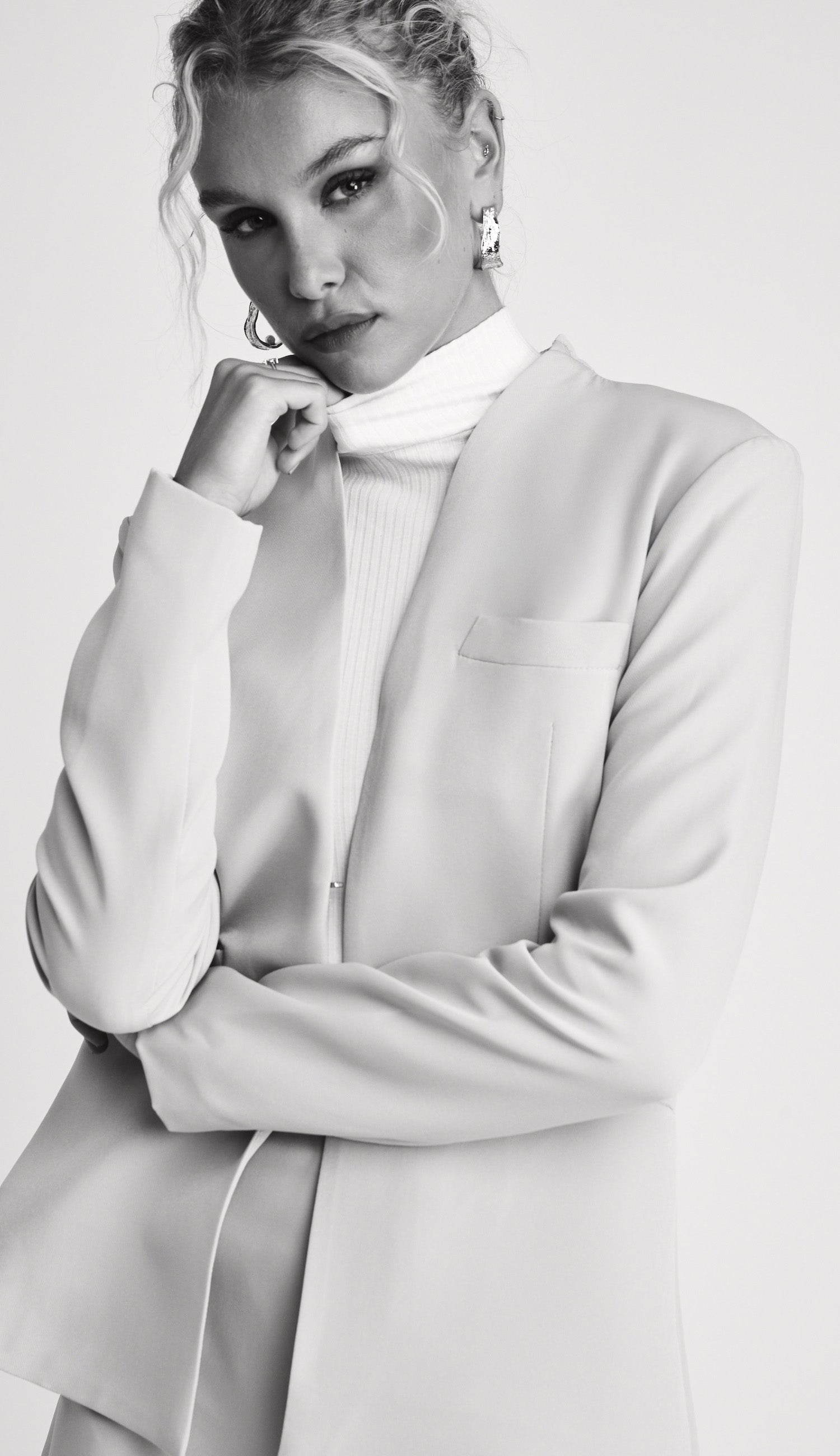 Blazer confeccionado em crepe de alfaiataria com forro. Possui modelagem ajustada e alongada, frente aberta com fechamento apenas por colchete de metal; a peça não possui lapela na gola, sendo ela reta e lisa; conta ainda com ombreiras para estruturar a silhueta, mangas longas, bolsos frontais embutidos e o corte clássico de alfaiataria que torna o modelo elegante e atemporal.
