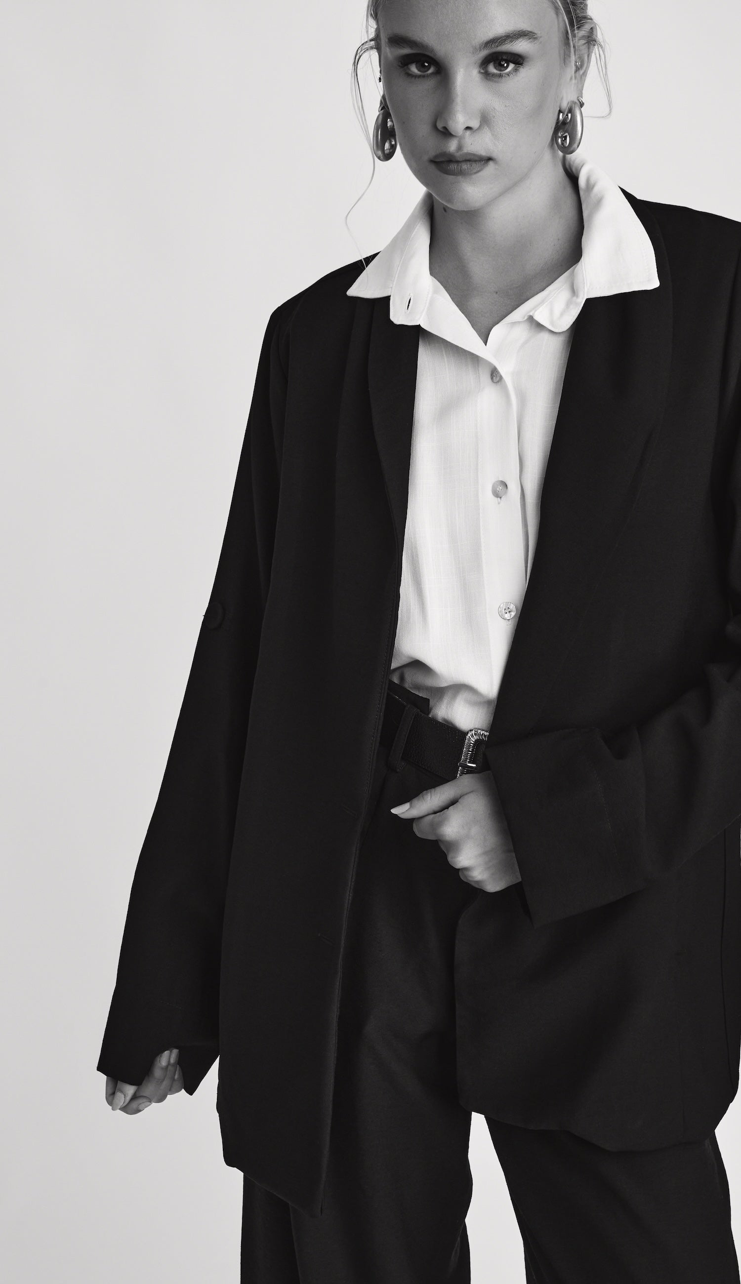 Blazer com forro, confeccionado em sarja de alfaiataria em poliviscose mais encorpada com aspecto amassadinho. Possui modelagem ajustada e alongada, ombreiras para estruturar a peça, decote em V com lapela na gola, fechamento frontal por botões forrados, bolsos laterais e mangas longas com martingale para ajuste do comprimento.
