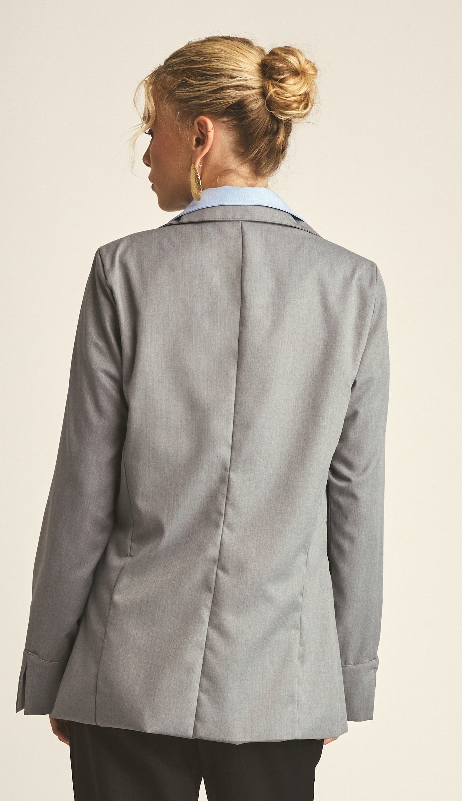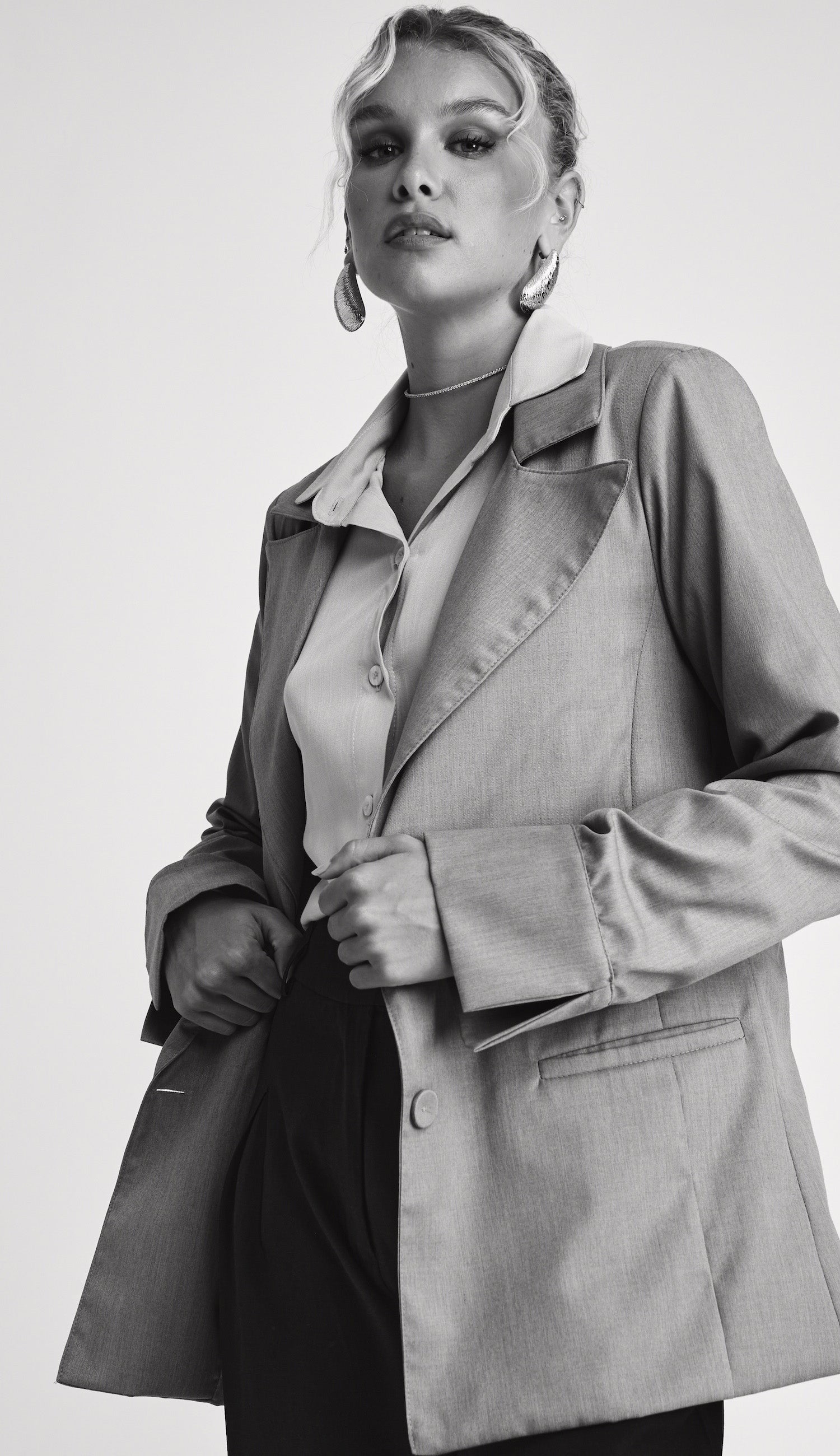 Blazer confeccionado em alfaiataria com forro. Possui modelagem alongada, recortes que modelam a silhueta, pala dobrada na gola em V, fechamento frontal por botões forrados, bolsos frontais, ombreiras para estruturar e mangas longas com punhos largos que têm aberturas laterais. Uma peça coringa que não pode faltar em todas as guarda-roupas.