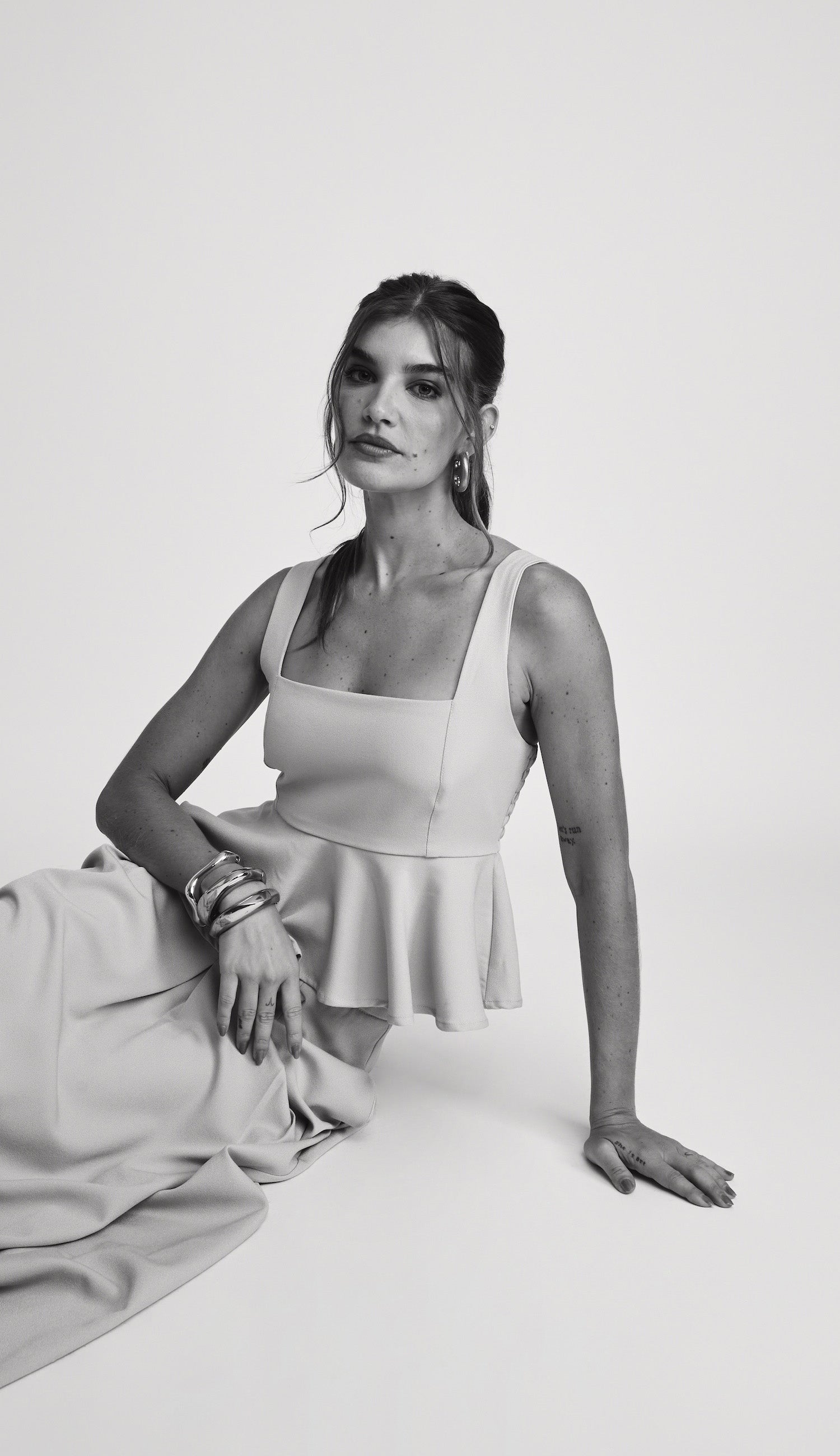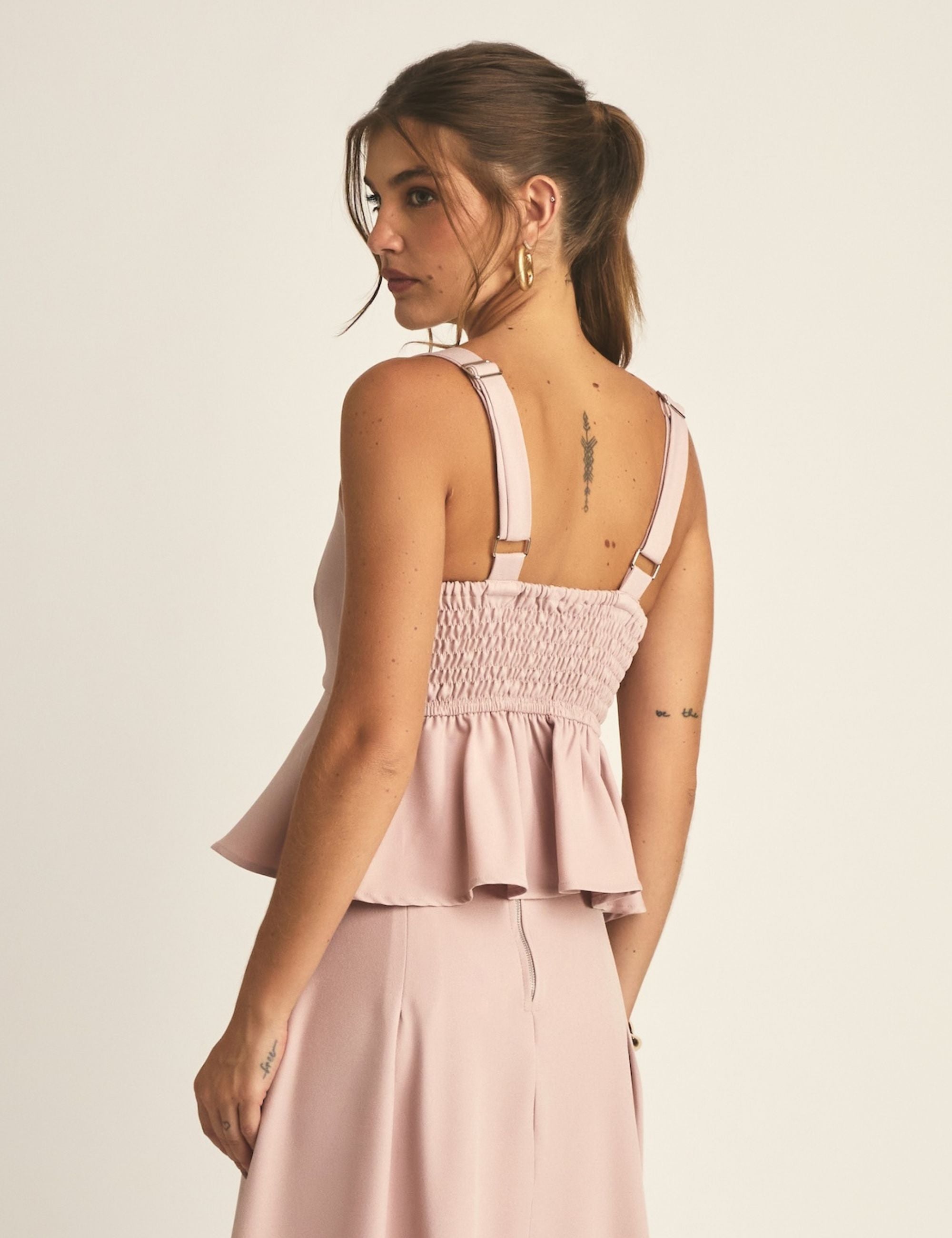 Blusa confeccionada em crepe de alfaiataria. Possui tecido duplo no busto para não ficar transparente, decote quadrado, alças largas com reguladores de metal, lastex franzido nas costas para melhor ajuste ao corpo e babado na cintura estilo peplum.