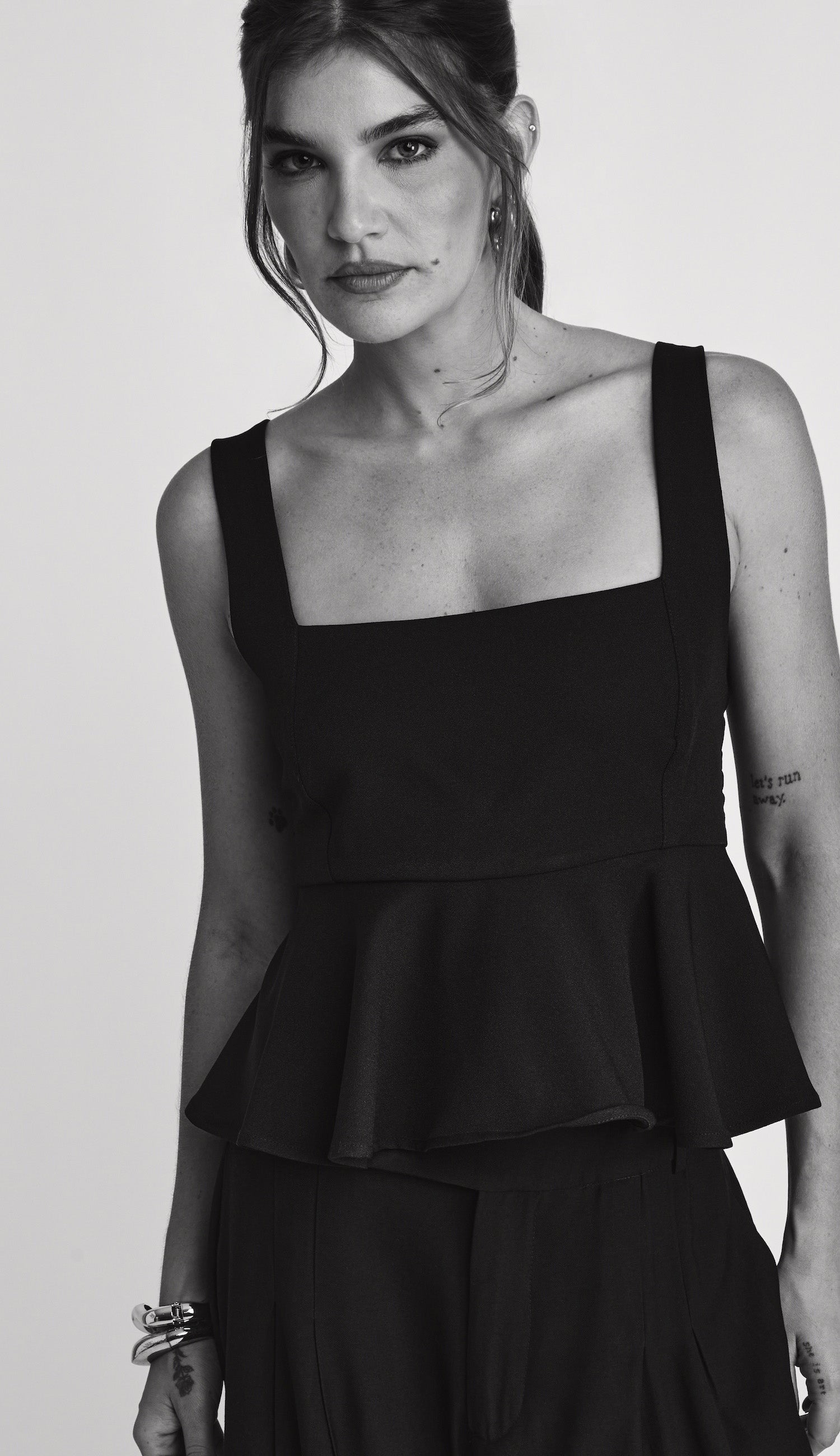 Blusa confeccionada em crepe de alfaiataria. Possui tecido duplo no busto para não ficar transparente, decote quadrado, alças largas com reguladores de metal, lastex franzido nas costas para melhor ajuste ao corpo e babado na cintura estilo peplum.