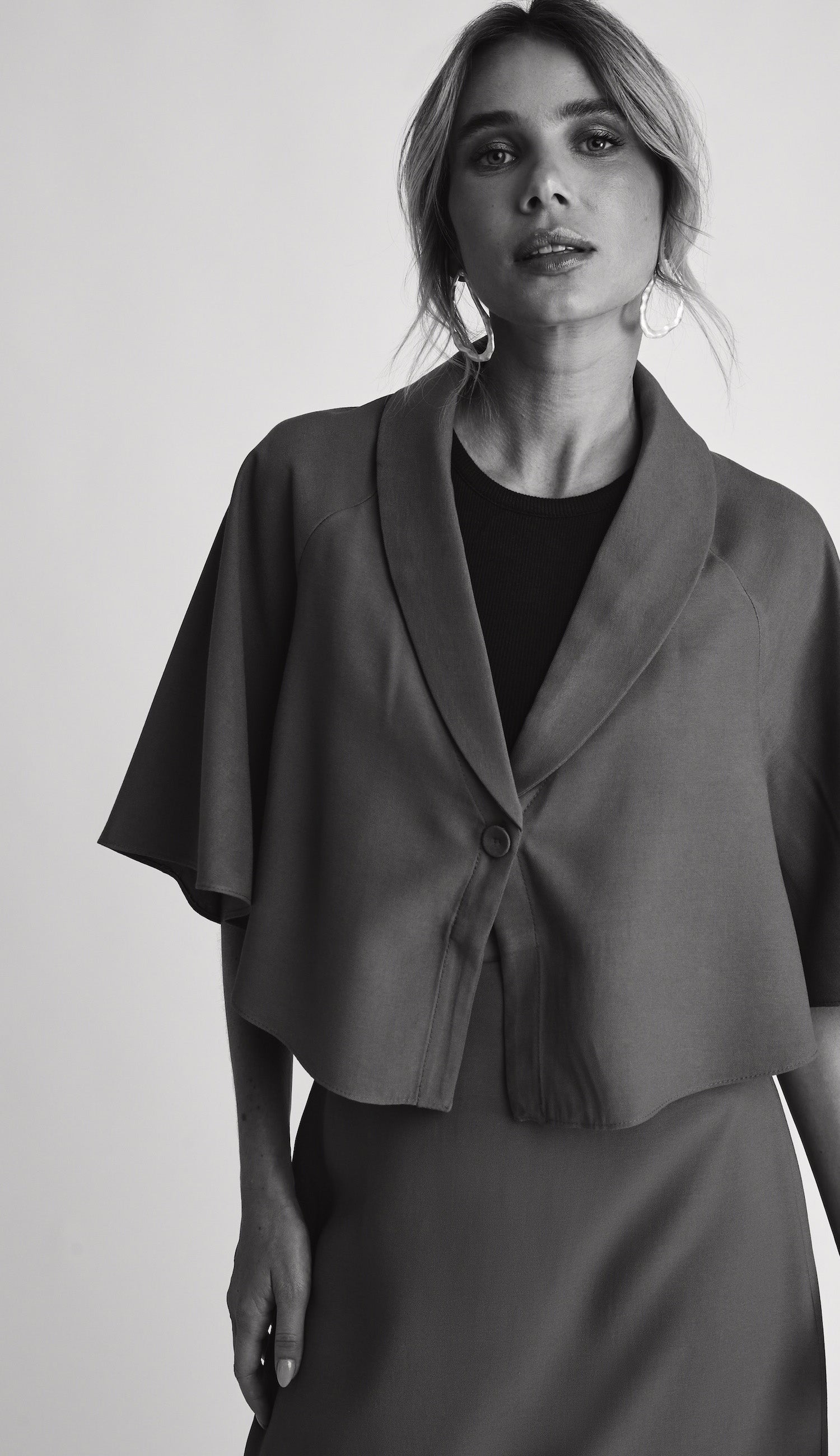 Blusa cropped estilo poncho confeccionada em alfaiataria de poliviscose com aspecto levemente amassadinho. Possui forro por baixo com elástico para ajustar melhor ao corpo, modelagem bem soltinha, decote em V com lapela dobrada na gola, detalhe de botão forrado de enfeite logo abaixo da gola e mangas curtas amplas estilo capa.