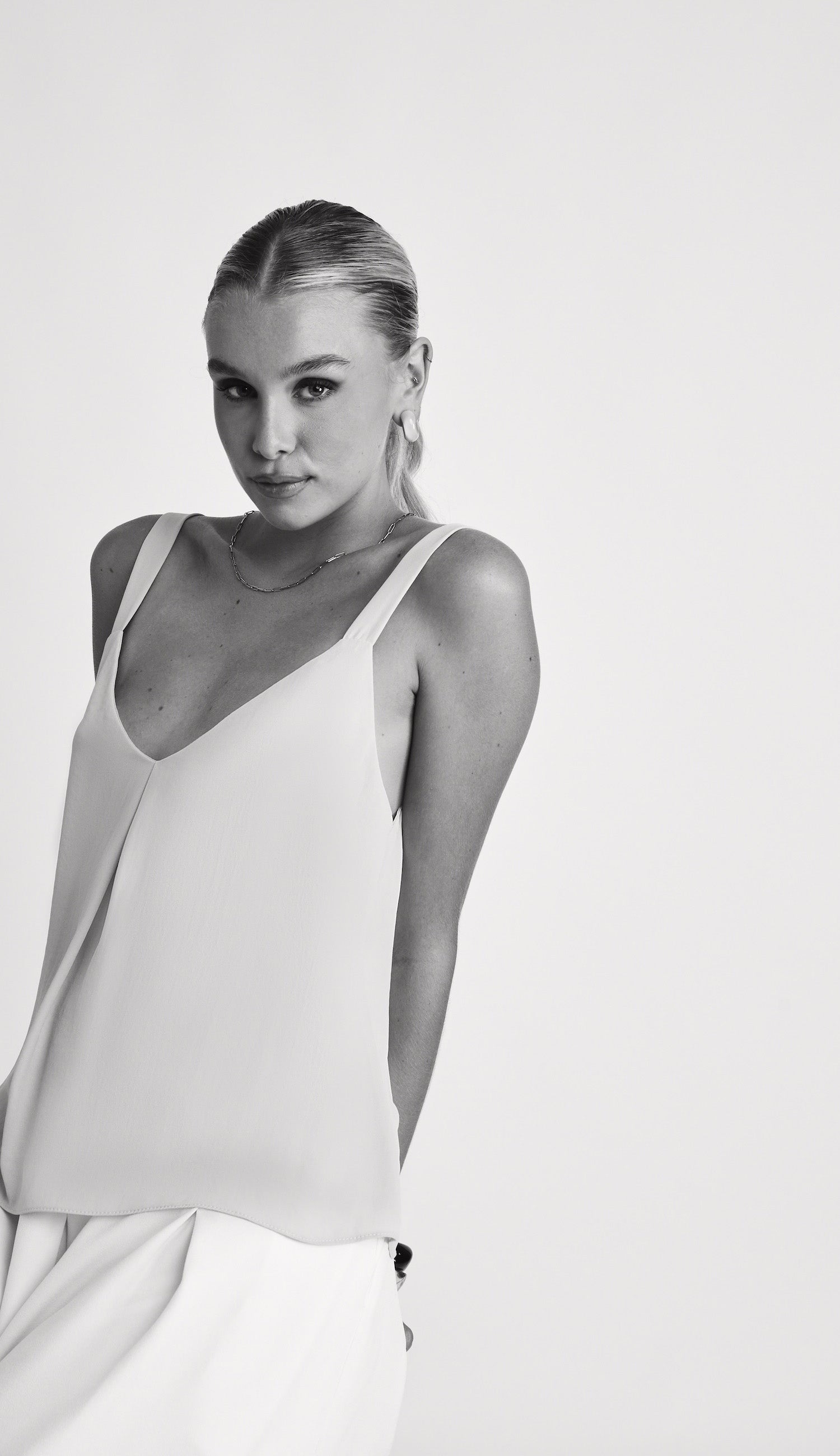 Regata confeccionada em crepe leve com tecido duplo na frente para não ficar transparente; possui modelagem soltinha, decote em V com preguinha e alças no mesmo tecido.