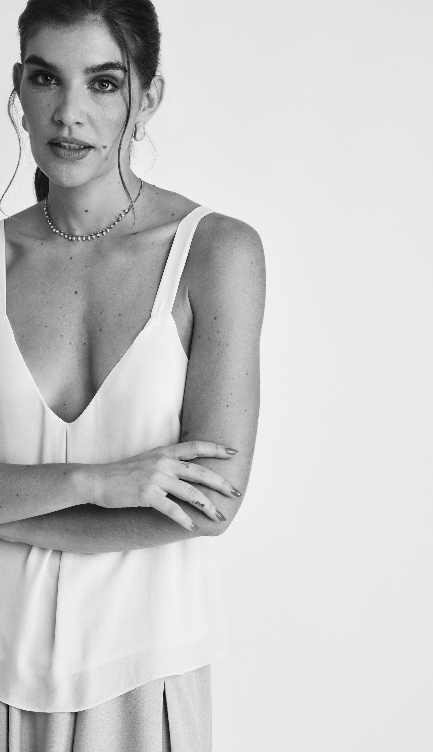 Regata confeccionada em crepe leve com tecido duplo na frente para não ficar transparente; possui modelagem soltinha, decote em V com preguinha e alças no mesmo tecido.