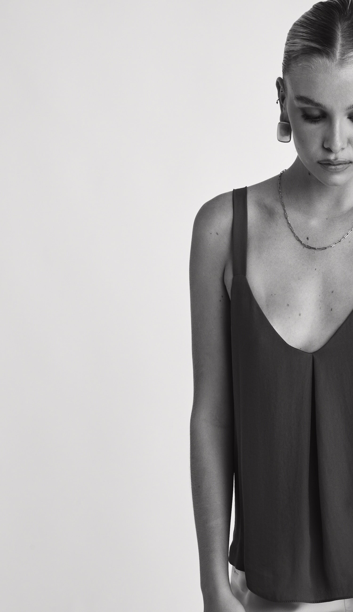 Regata confeccionada em crepe leve com tecido duplo na frente para não ficar transparente; possui modelagem soltinha, decote em V com preguinha e alças no mesmo tecido.