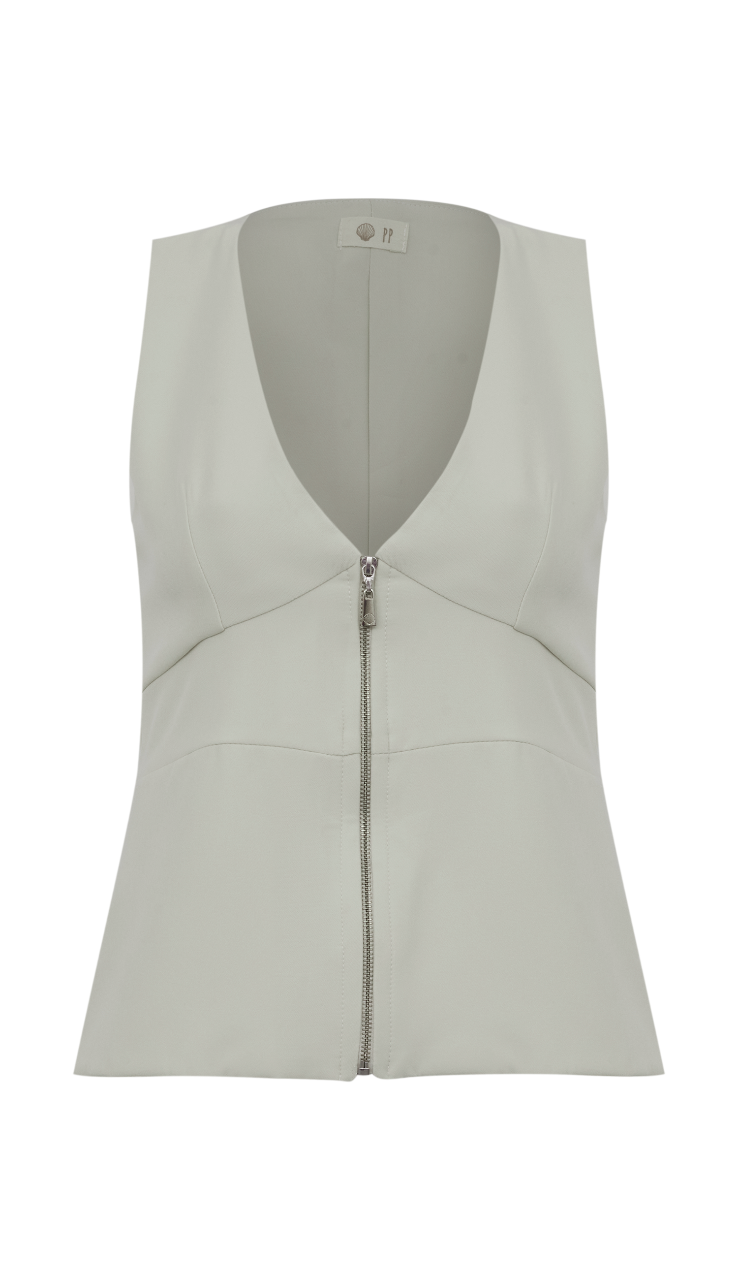 Blusa regata confeccionada em crepe de alfaiataria. Possui tecido duplo, modelagem ajustada, decote em V profundo, fechamento frontal por zíper de metal com pingente que tem a conchinha da Laguna gravada, pala abaixo do busto e recortes que modelam a peça.