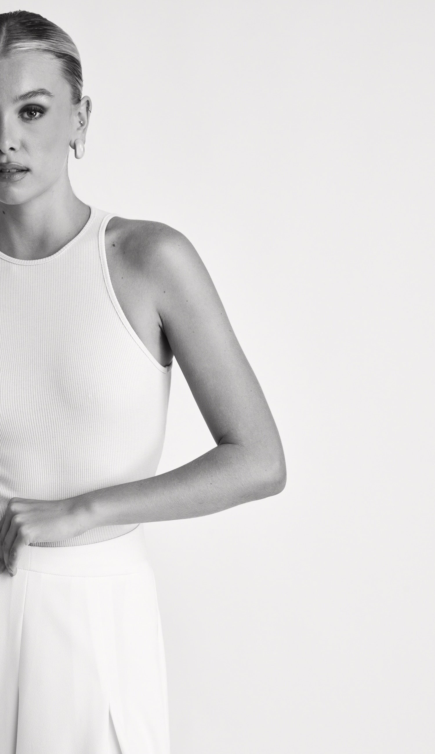 Body confeccionado em malha canelada. Possui decote redondo na frente, no estilo halter, com as cavas mais retas e decote nadador nas costas; modelagem ajustada, abertura nas costas e fecho de sutiã no gancho.