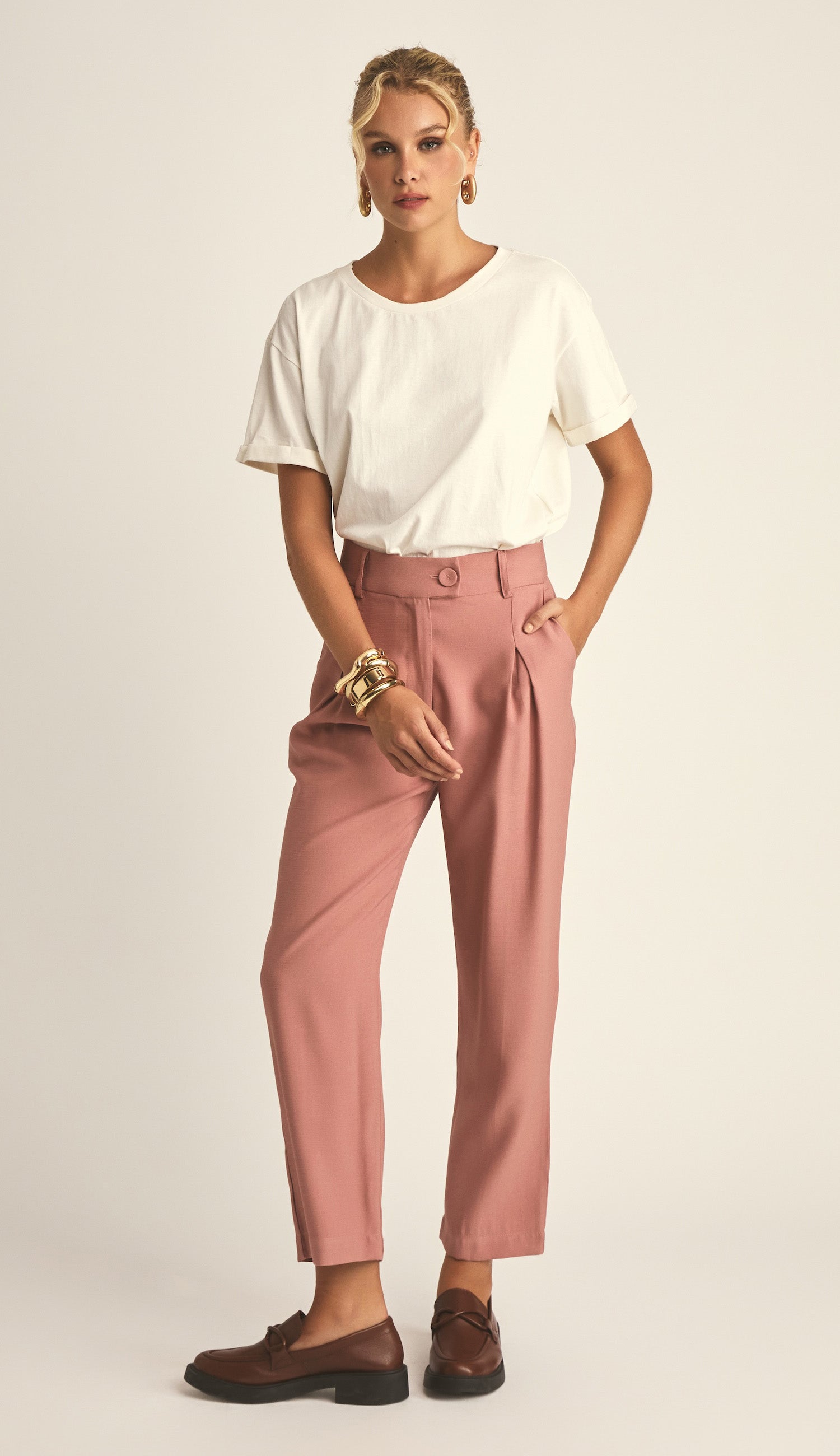 Calça cenoura confeccionada em alfaiataria de poliviscose texturizada com aspecto de linho. Possui pregas na frente, fechamento frontal por zíper e por botão forrado deslocado no cós, passantes, bolsos faca laterais e bolsos embutidos traseiros. O corte clássico de alfaiataria, torna-se uma peça elegante e atemporal.