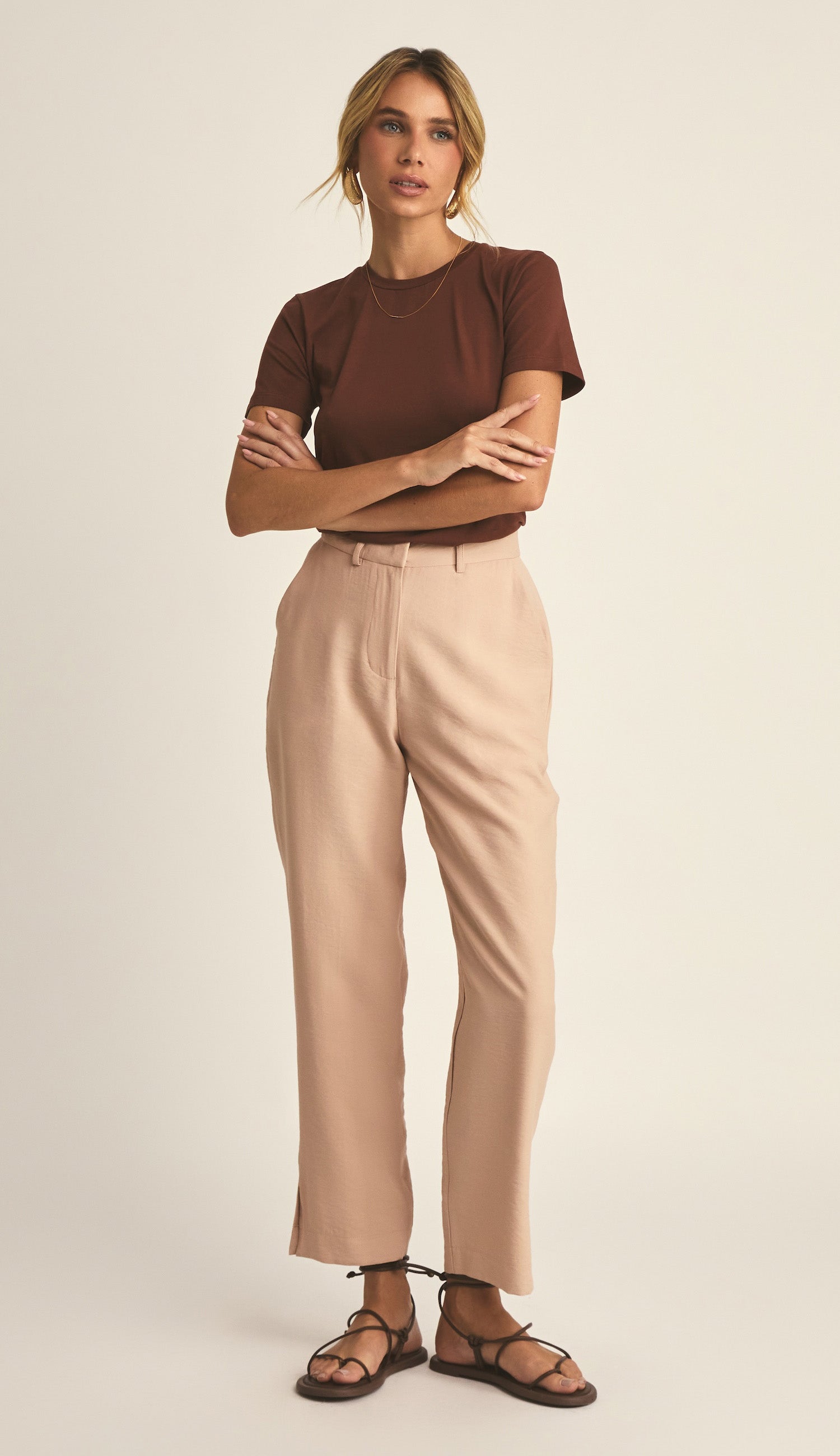 Calça confeccionada em alfaiataria de poliviscose com aspecto levemente amassadinho. Possui modelagem ajustada com pernas levemente soltinhas, passantes no cós, fechamento frontal por zíper e colchete de metal não aparentes, bolsos faca laterais e detalhe de aberturinhas nas laterais das barras.