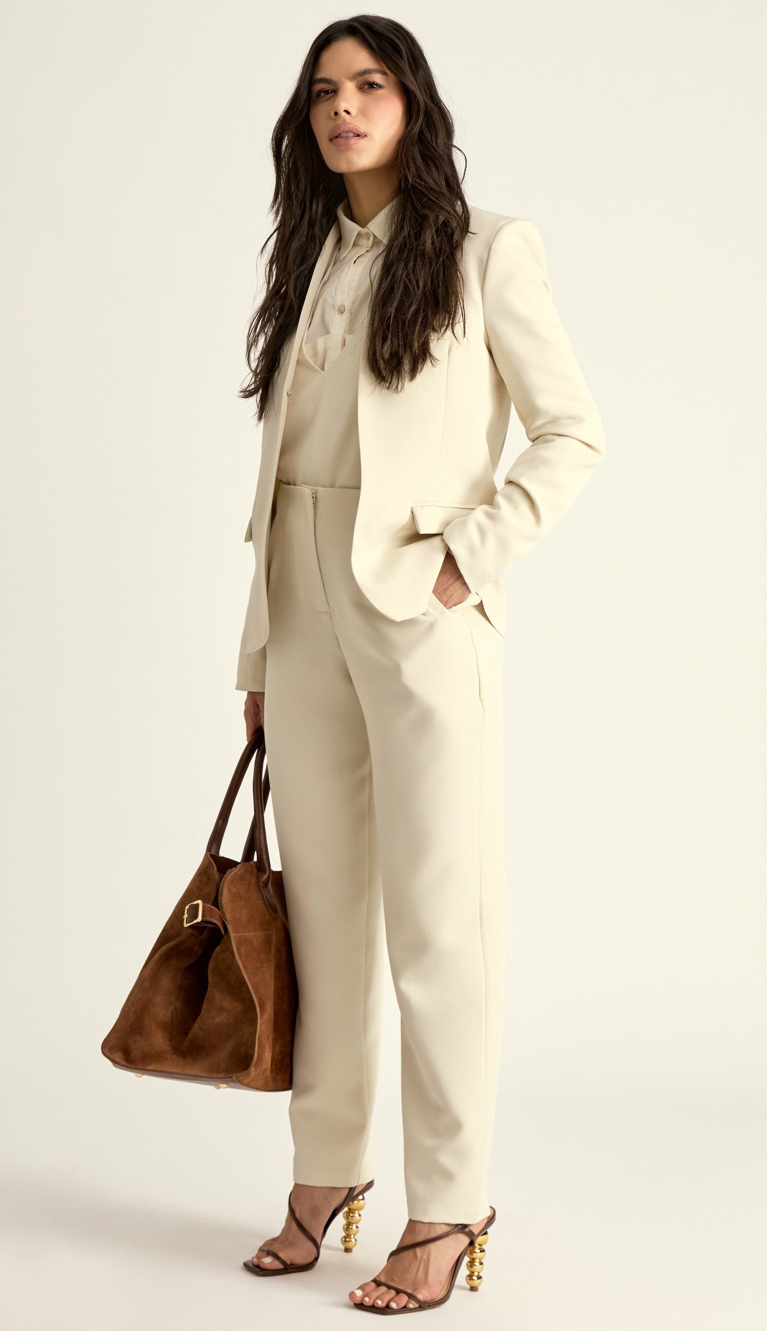 Calça carrot confeccionada em crepe de alfaiataria. Possui cintura alta com pregas frontais que desenham a silhueta; bolsos laterais e fechamento frontal por zíper.