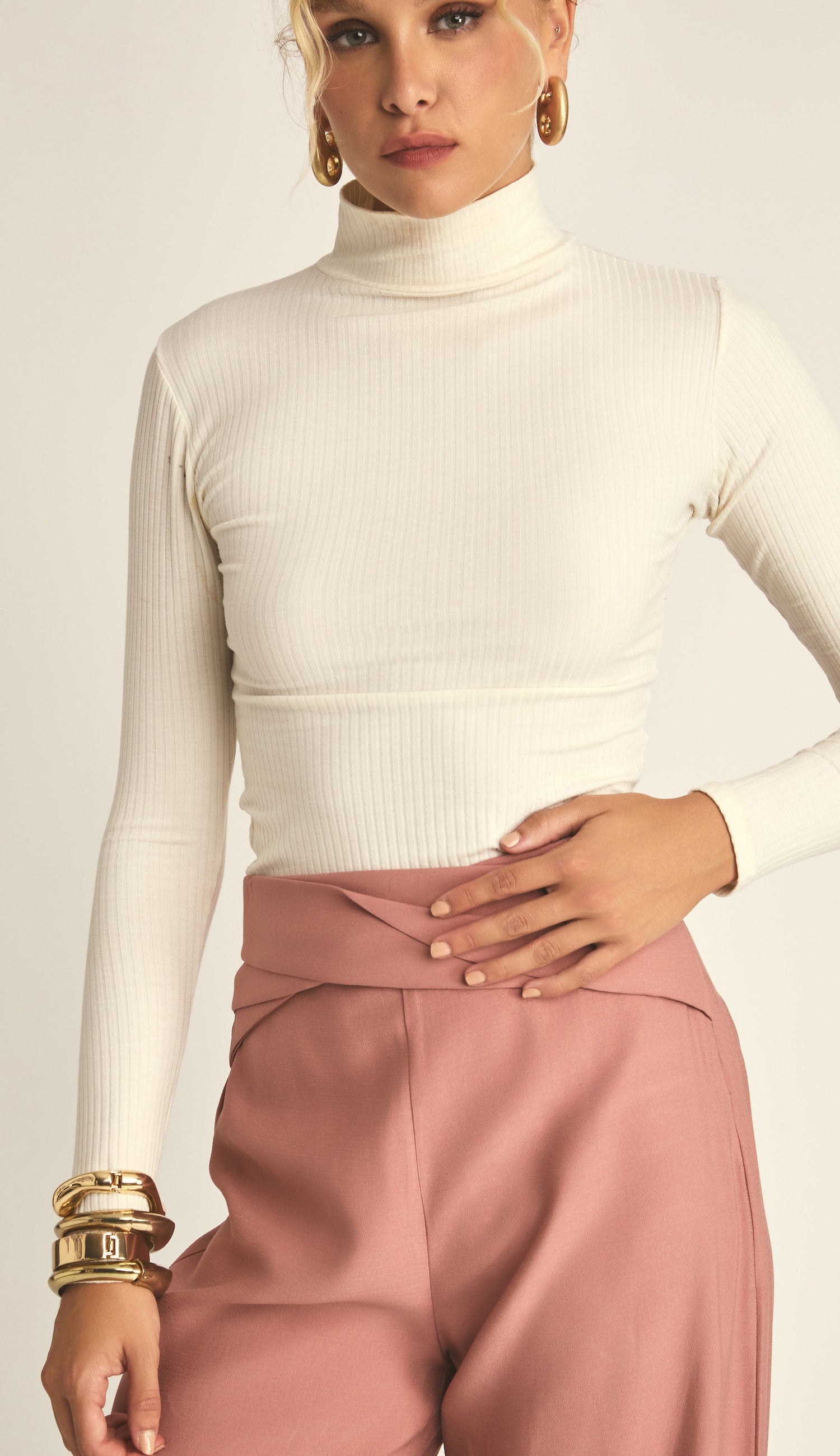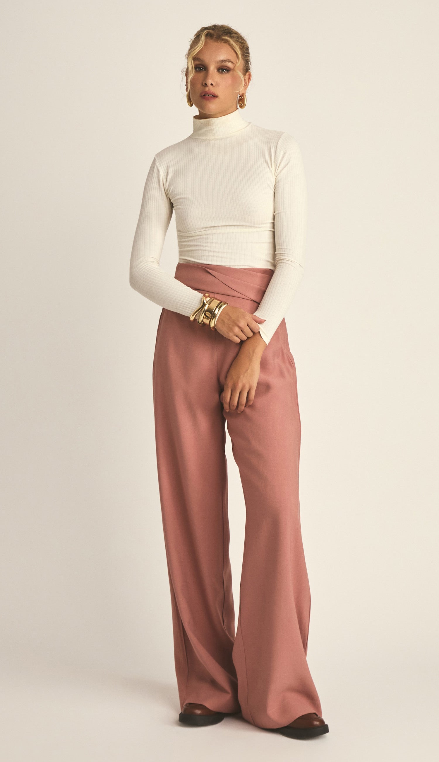 Calça pantalona com forro inteiro, confeccionada em alfaiataria de poliviscose texturizada com aspecto de linho. Possui um detalhe super charmoso de sobreposição pregueada assimétrica no cós, fechamento lateral por zíper invisível e bolsos traseiros embutidos.