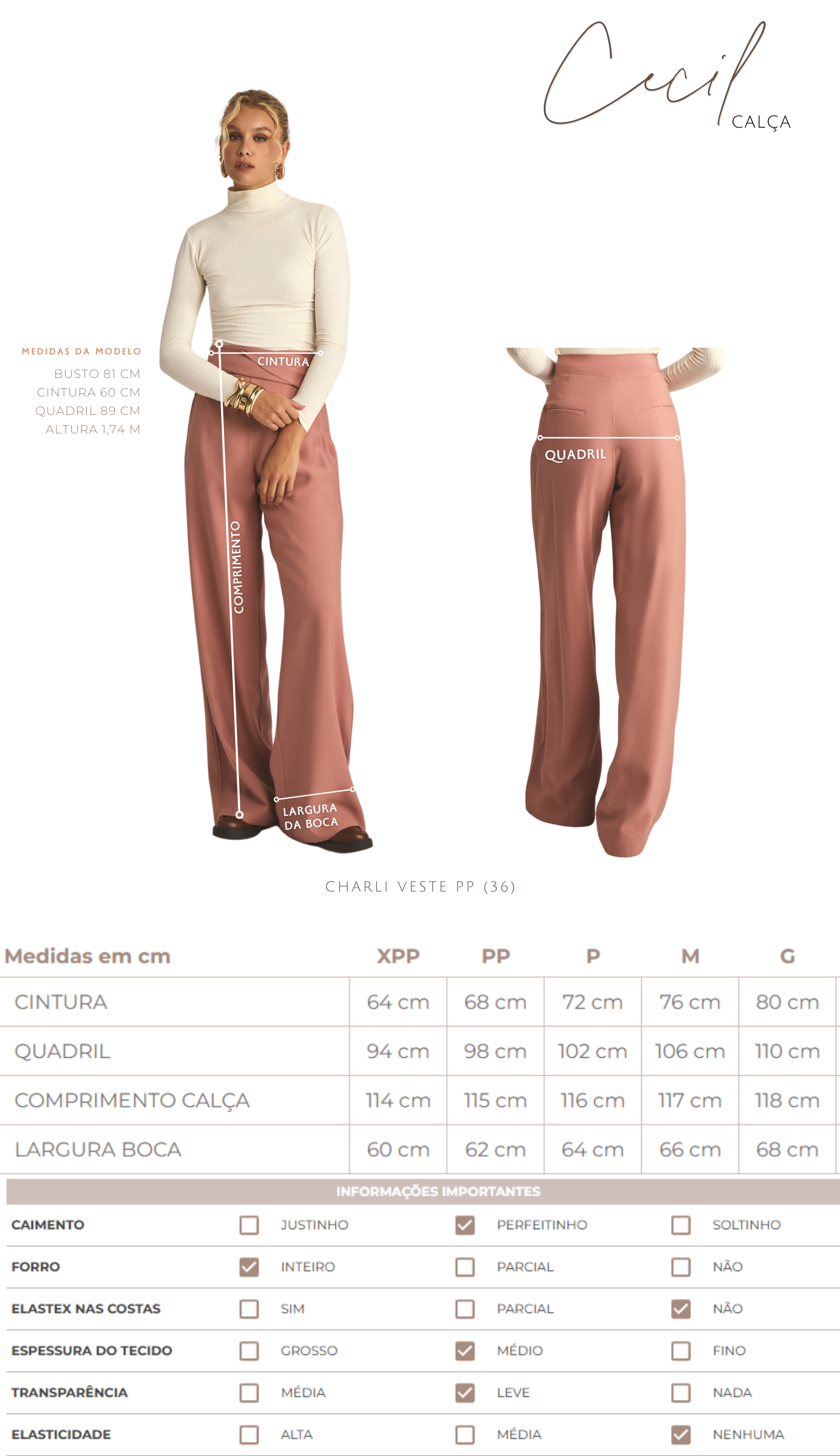 Calça pantalona com forro inteiro, confeccionada em alfaiataria de poliviscose texturizada com aspecto de linho. Possui um detalhe super charmoso de sobreposição pregueada assimétrica no cós, fechamento lateral por zíper invisível e bolsos traseiros embutidos.