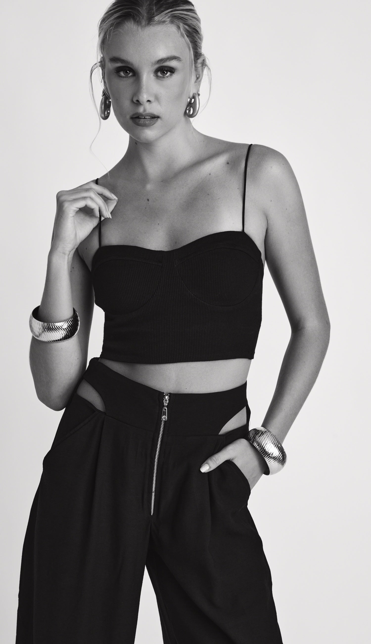 Calça pantalona confeccionada em alfaiataria de poliviscose mais encorpada com aspecto levemente amassadinho. Possui cintura alta, cós largo com pala e recortes vazados nas laterais, pregas frontais, bolsos faca laterais com detalhe em viés, bolsos traseiros chapados e fechamento frontal por zíper de metal com pingente que tem a conchinha da Laguna gravada.