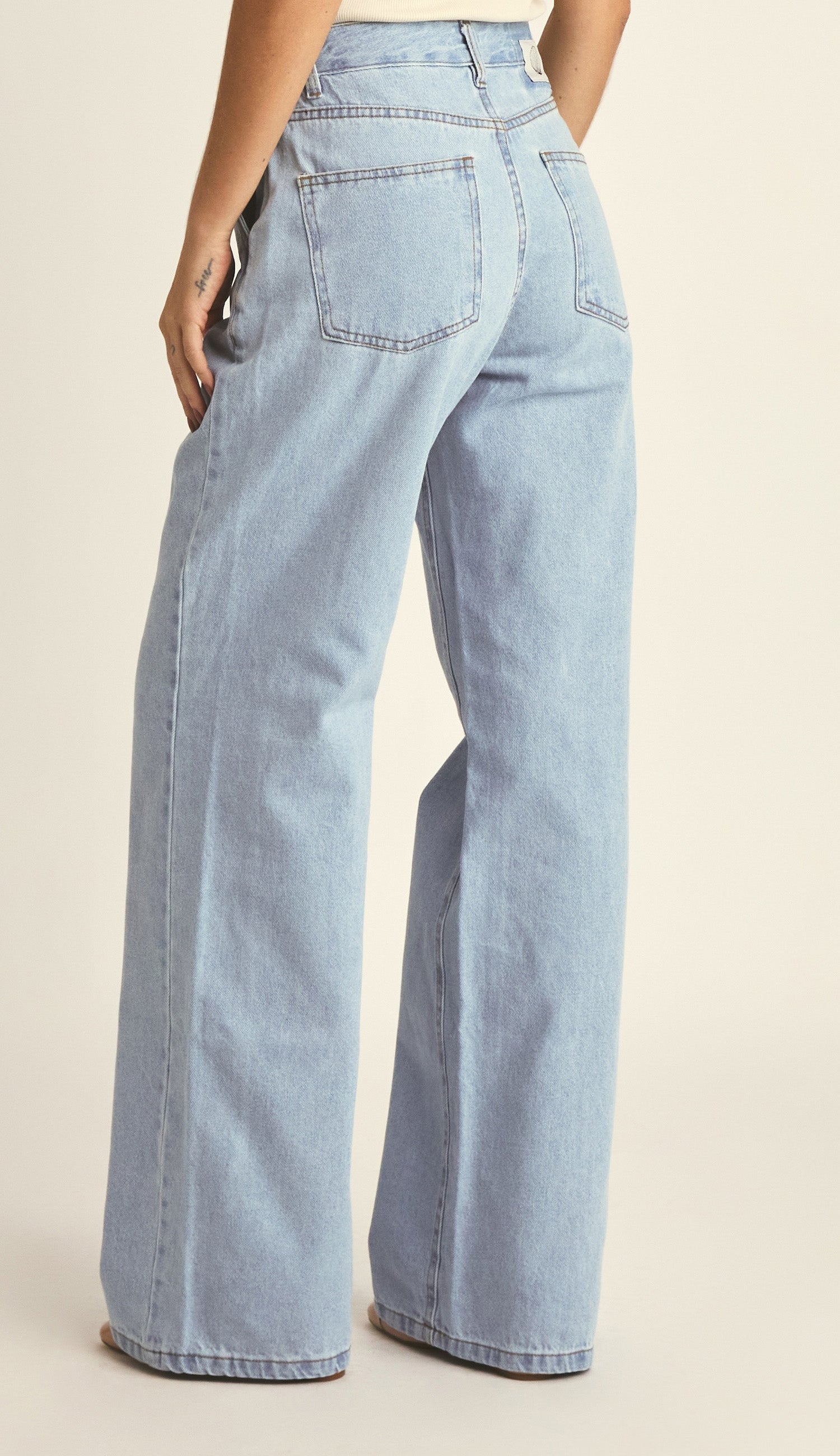 Calça jeans estilo wide com cintura ajustada e pernas larguinhas. Possui fechamento frontal por zíper e botão metálicos, passantes no cós, bolsos laterais e traseiros e detalhe super charmoso da etiqueta bordada com a conchinha da Laguna nas costas.