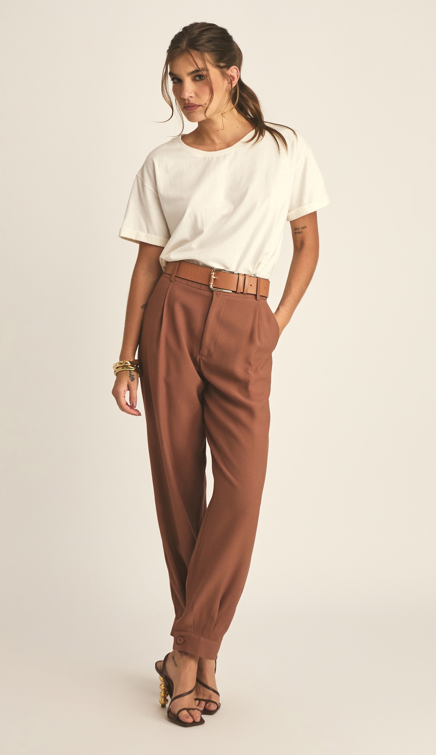 Calça com forro, confeccionada em alfaiataria de poliviscose com aspecto levemente amassadinho. Possui modelagem clássica de alfaiataria com pregas no cós e na barra, bolsos laterais, fechamento frontal por zíper e botão forrado e detalhe no punho da calça com o mesmo botão.