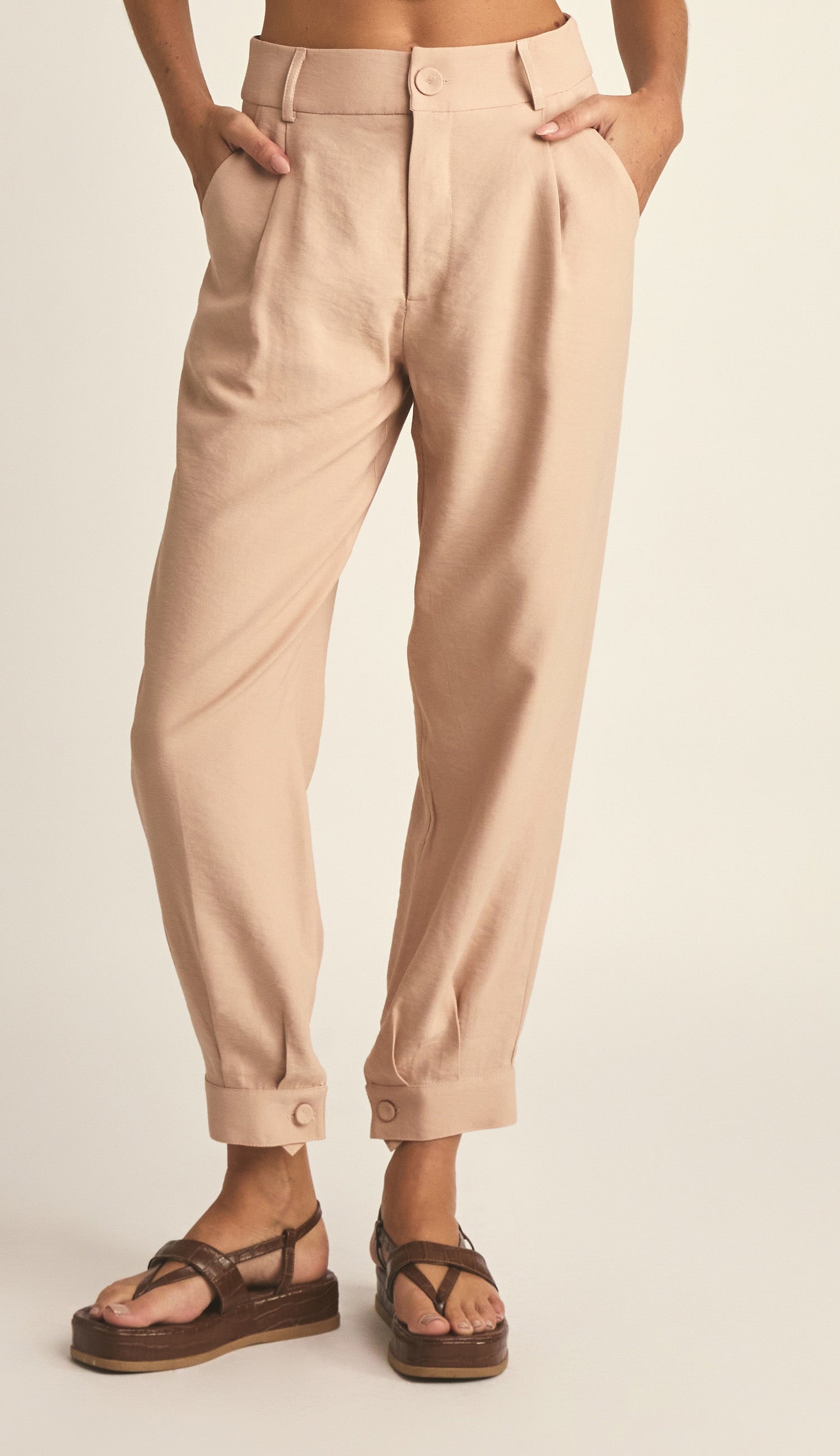 Calça com forro, confeccionada em alfaiataria de poliviscose com aspecto levemente amassadinho. Possui modelagem clássica de alfaiataria com pregas no cós e na barra, bolsos laterais, fechamento frontal por zíper e botão forrado e detalhe no punho da calça com o mesmo botão.