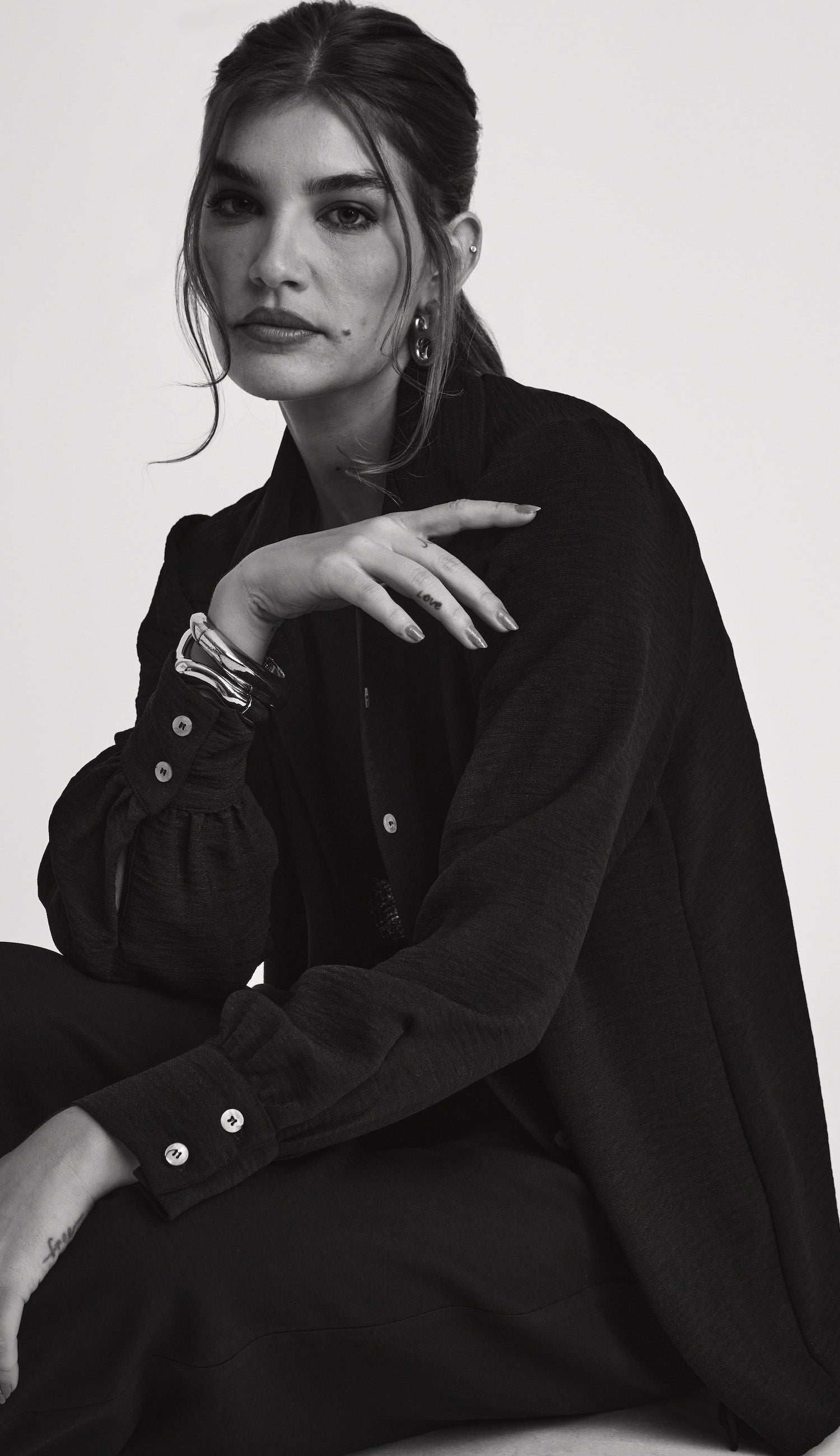Camisa confeccionada em em crepe texturizado com efeito amassadinho. Possui modelagem soltinha, mangas longas, gola tradicional, franzidinho nos ombros e fechamento frontal e dos punhos com botões madrepérola.