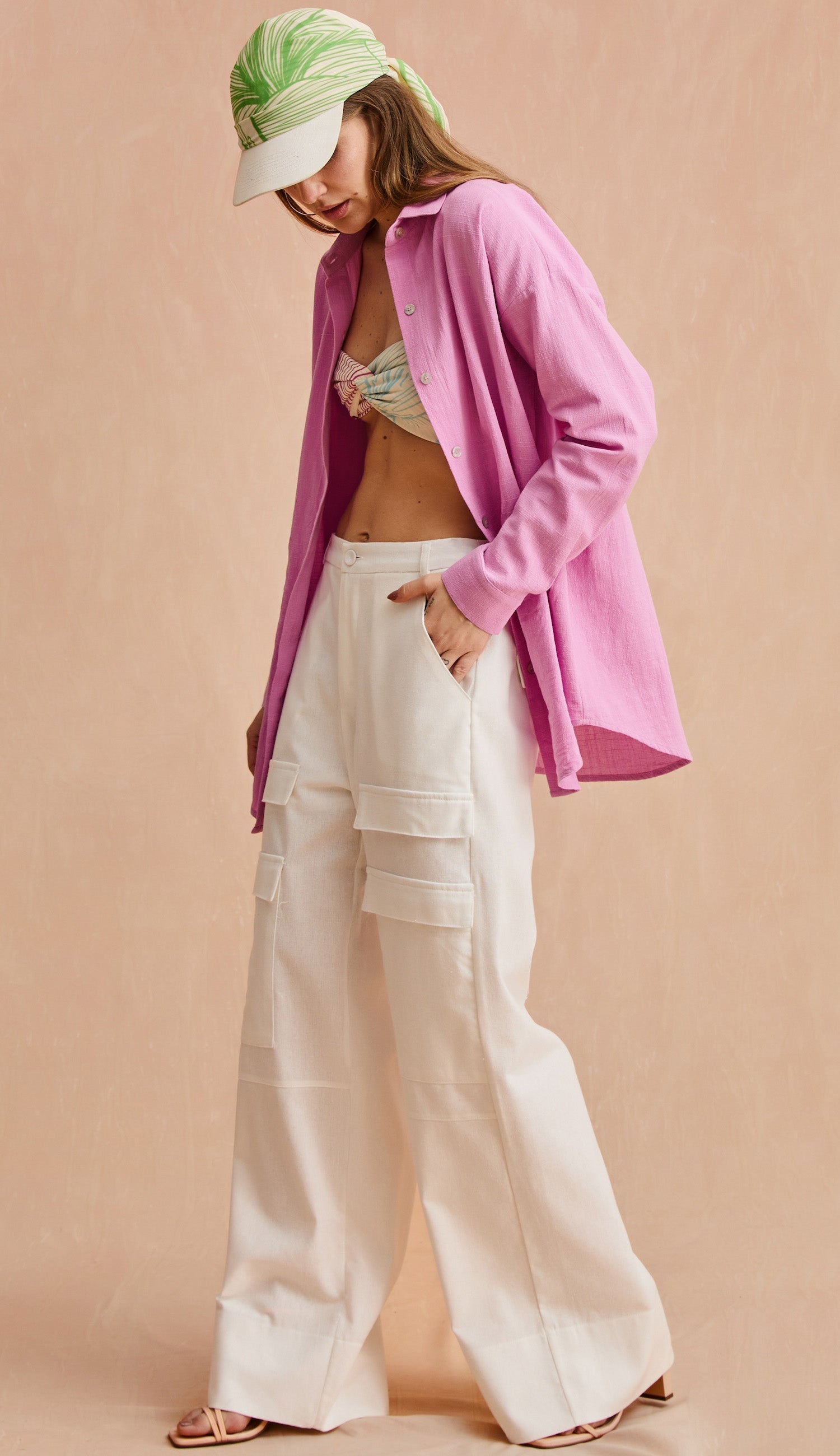 Camisão confeccionada em algodão flamê texturizado. Modelagem ampla e longa, peça super versátil podendo ser amarrada em laço, fechamento frontal por botões madrepérola.