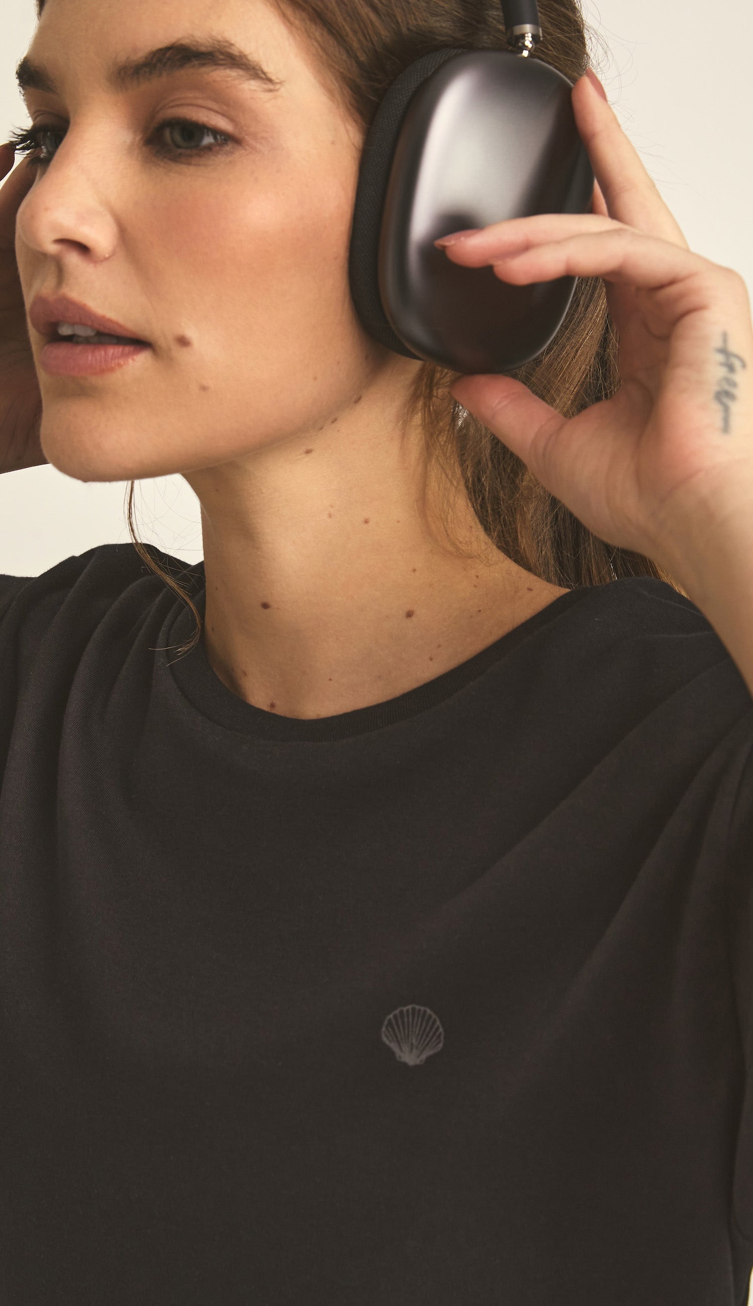 T-shirt slim confeccionada em malha de algodão egípcio. Possui modelagem reta alongada, mangas curtas, decote redondo com ribana e o detalhe charmoso da conchinha da Laguna em relevo estampada no mesmo tom da peça, na região do peito.
