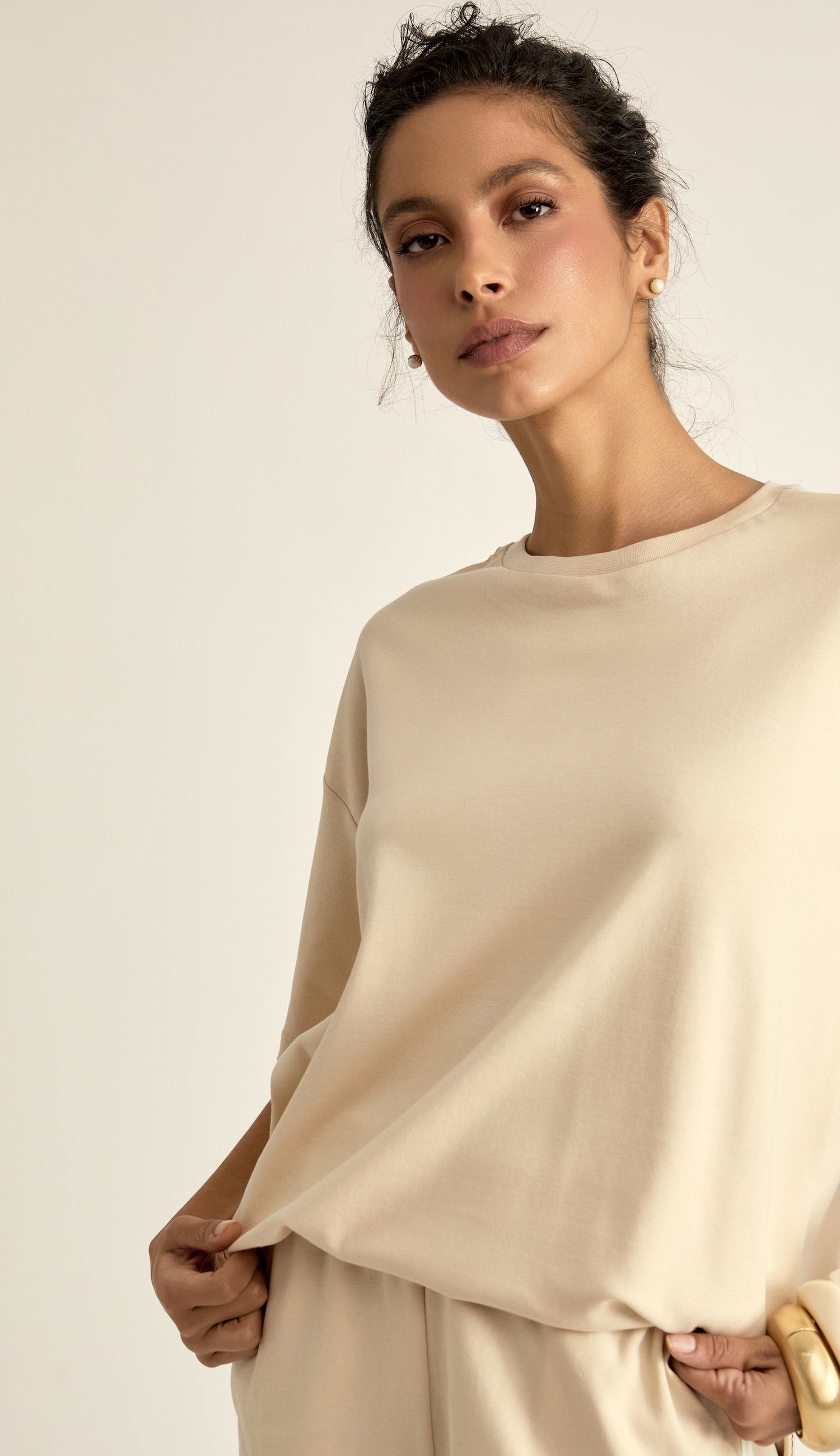 Camiseta t-shirt confeccionada em algodão egípcio. Possui modelagem solta e alongada, gola redonda com ribana, ombros deslocados, mangas curtas e aplicação de etiqueta da Laguna com logo bordado fixada na barra das costas.