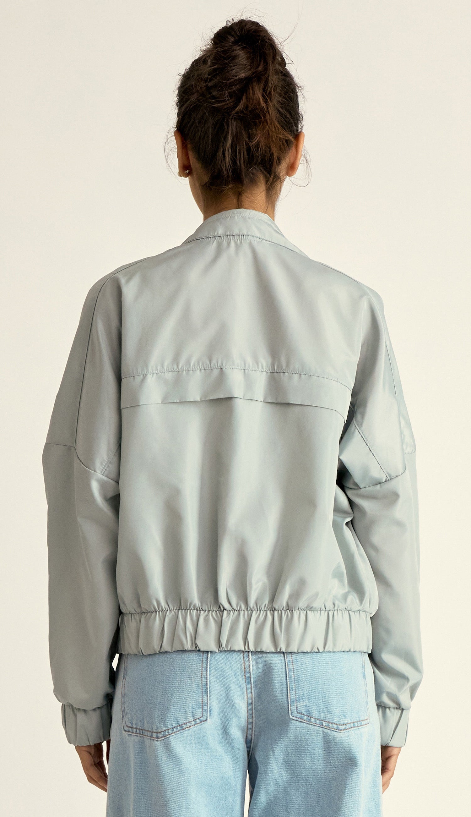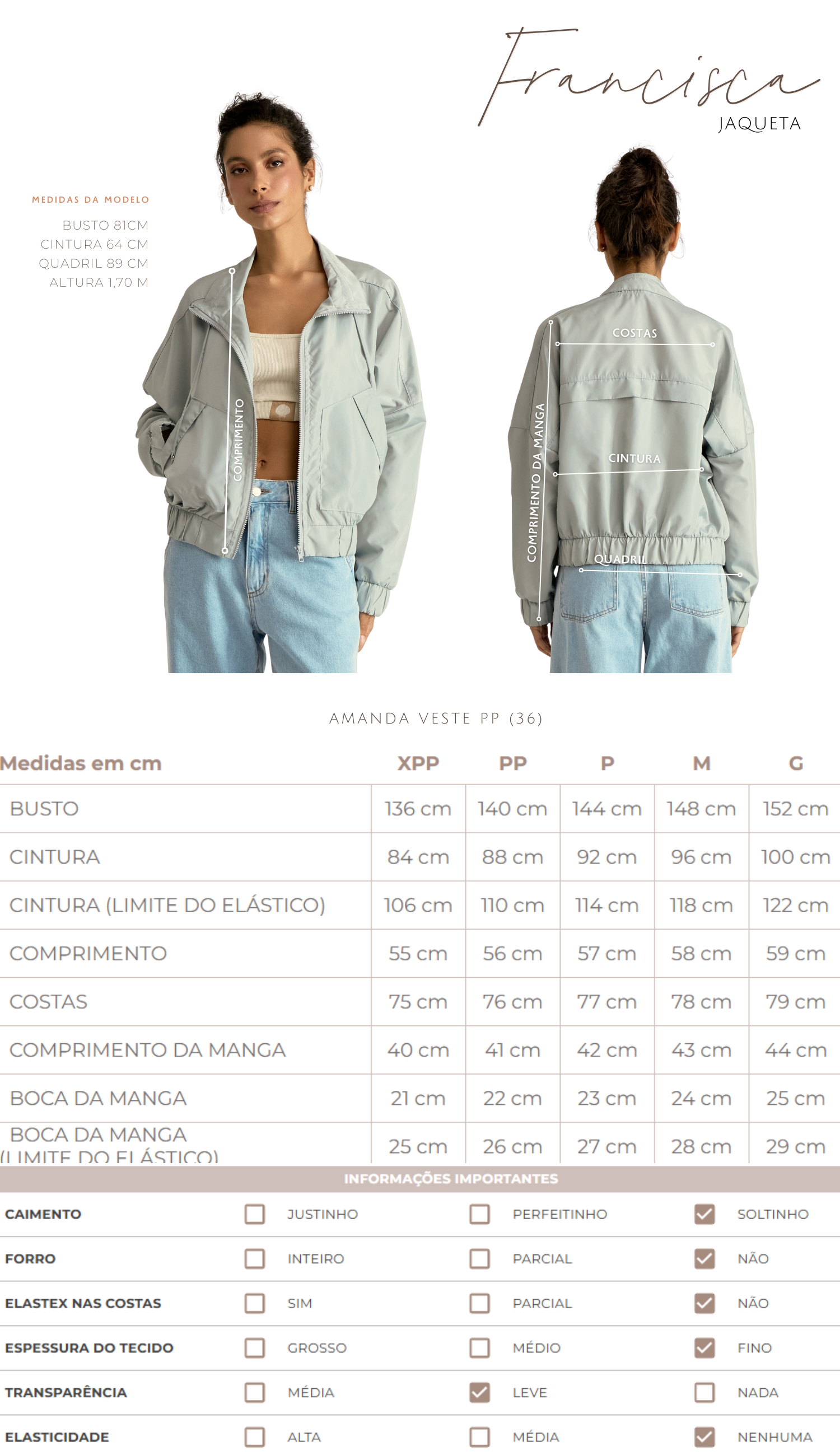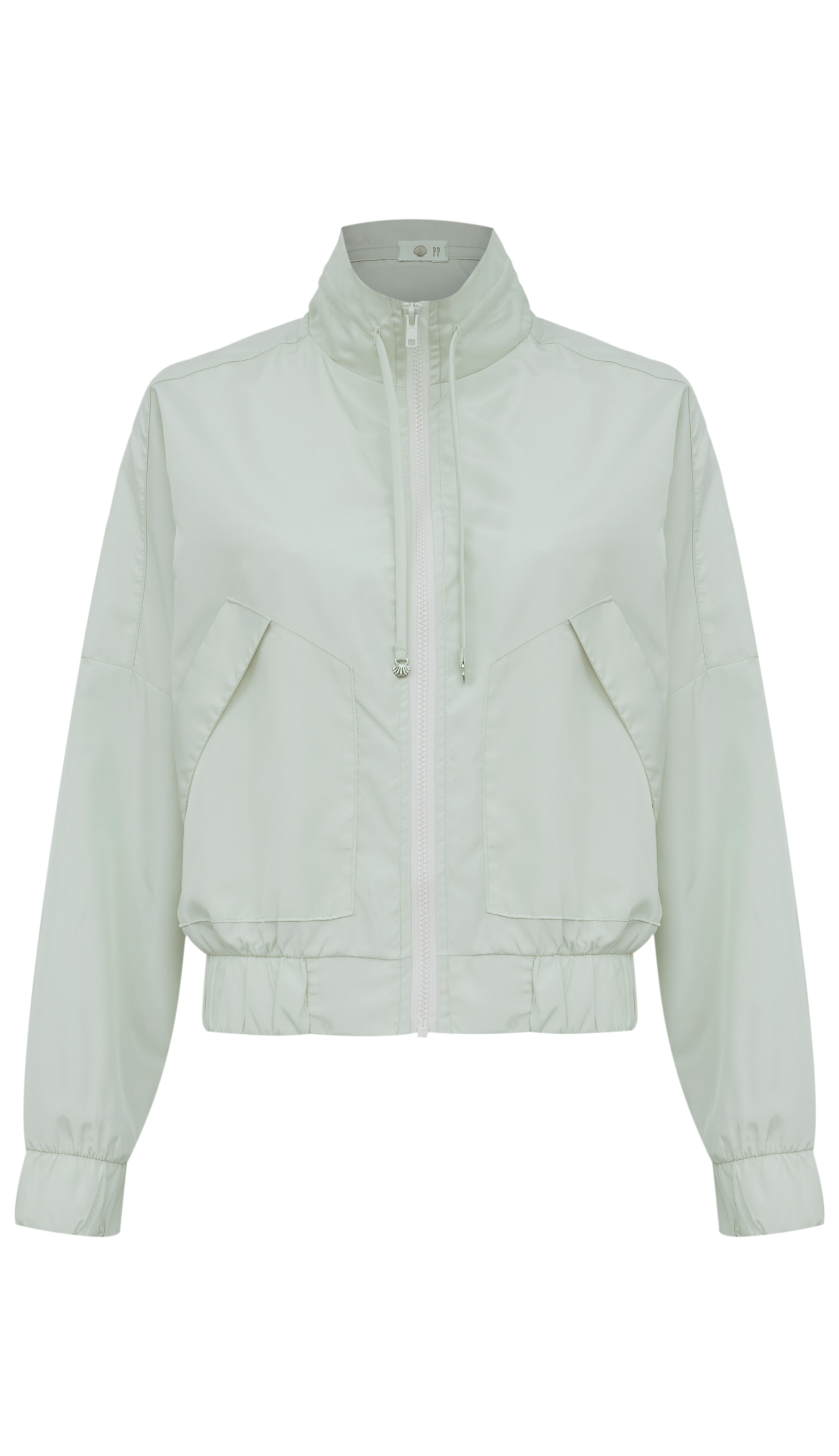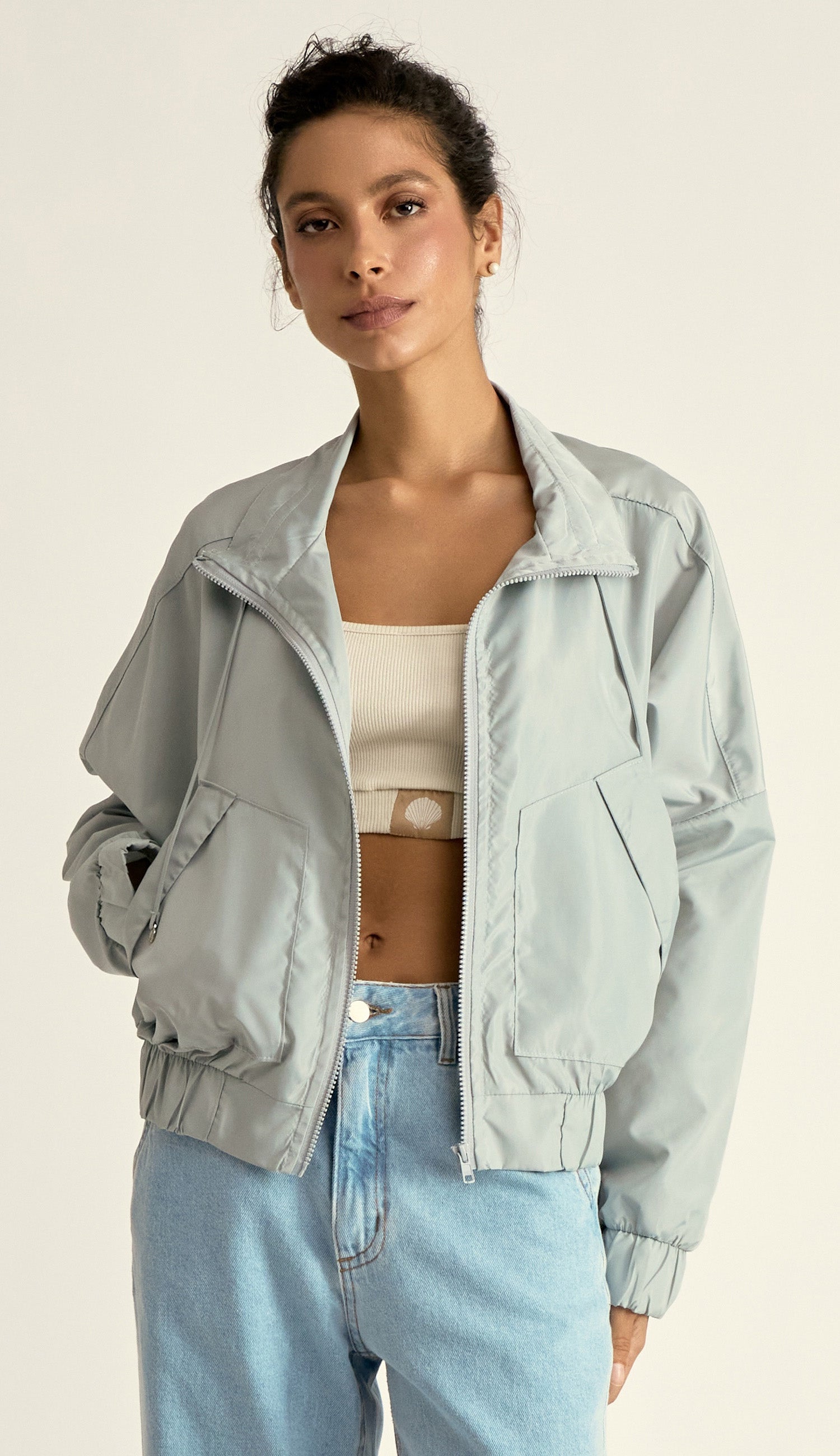 Jaqueta corta vento impermeável confeccionada em nylon. Possui modelagem soltinha, gola alta com tirinhas embutidas para ajuste e amarração com ponteiras de metal em formato de conchinha, fechamento frontal por zíper destacável, mangas longas com cava deslocada estilo morcego e punho largo em elástico revestido, bolsos laterais com detalhe de pala dobrada e barra também em elástico revestido.