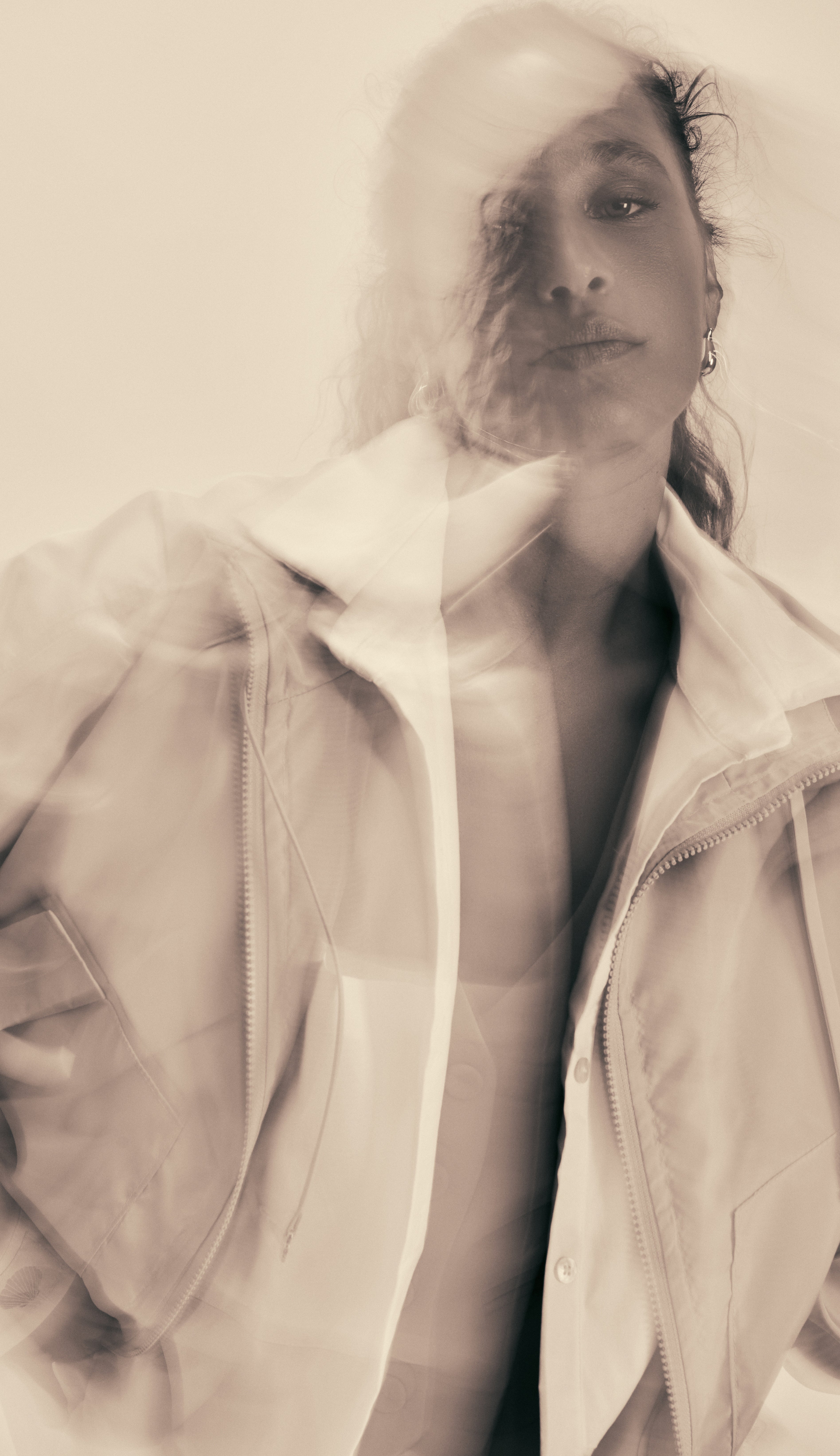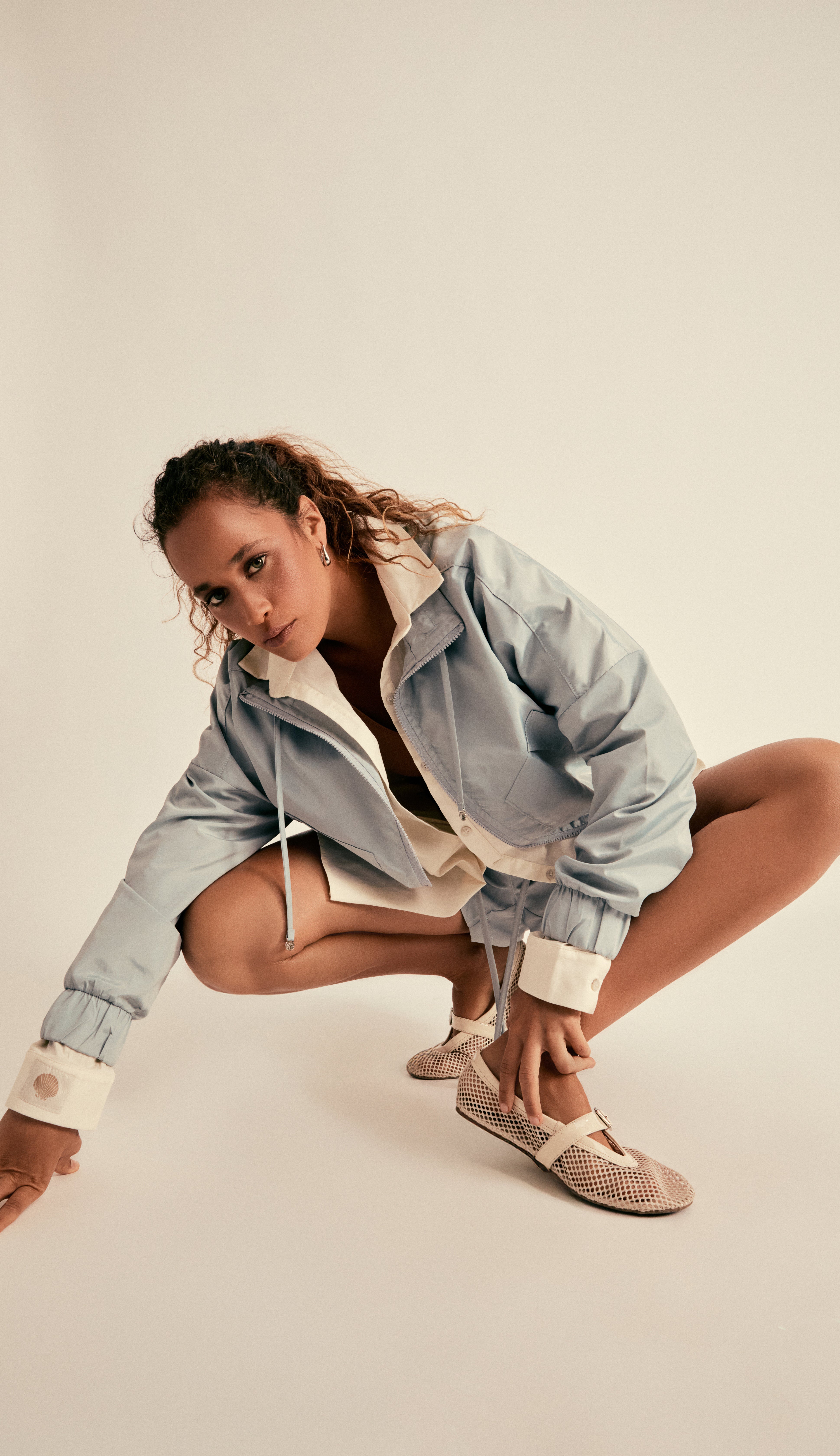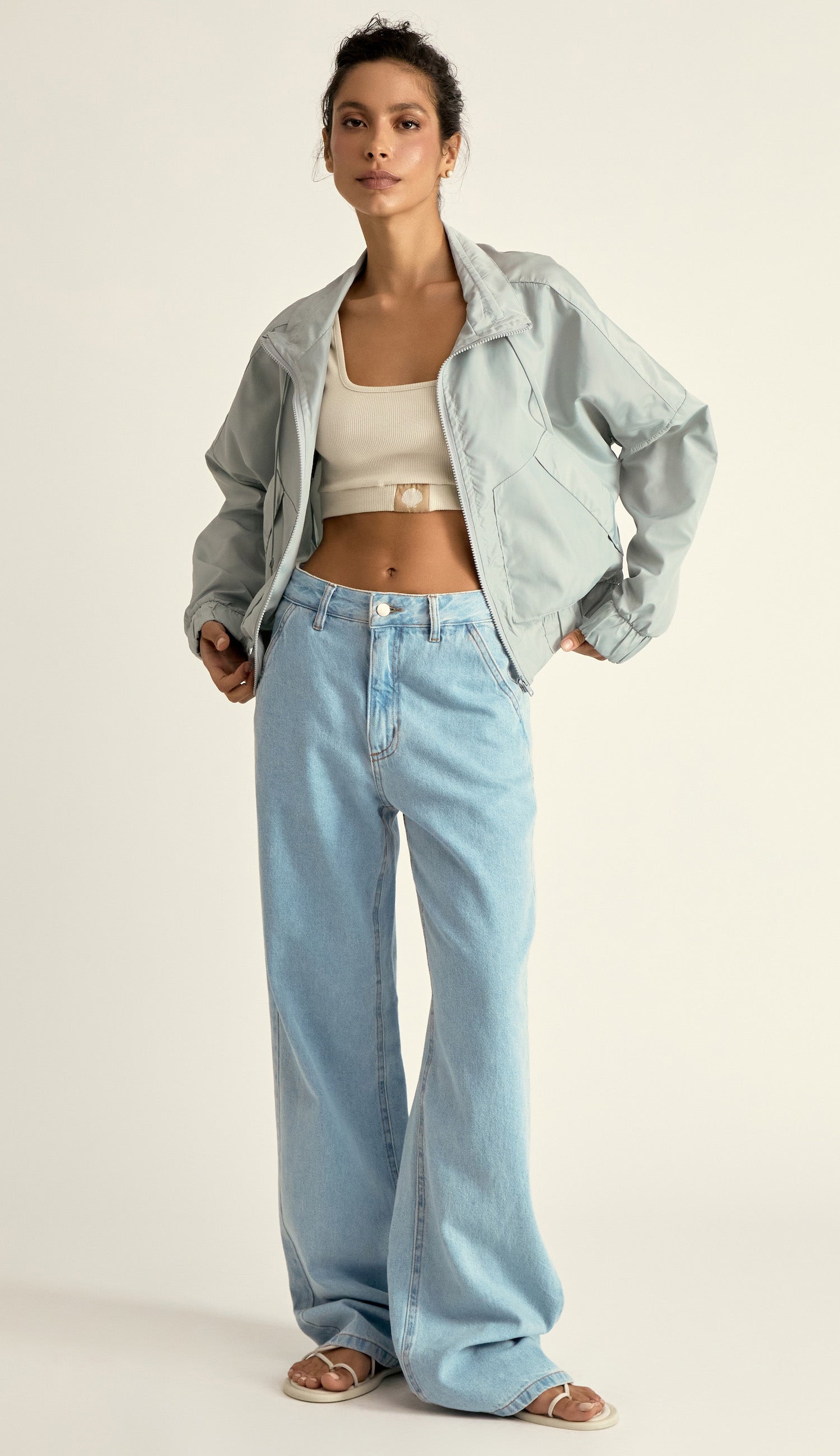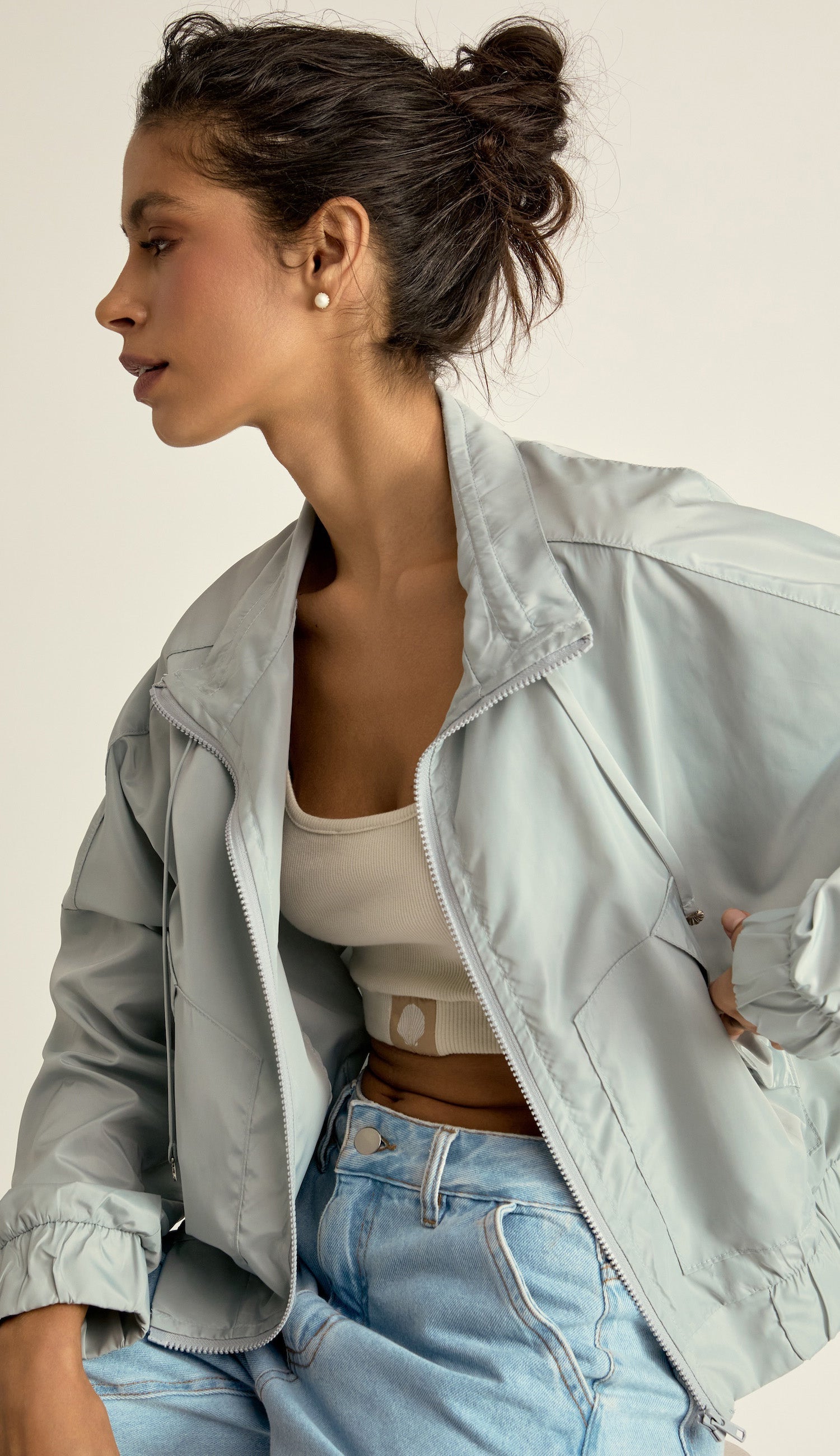 Jaqueta corta vento impermeável confeccionada em nylon. Possui modelagem soltinha, gola alta com tirinhas embutidas para ajuste e amarração com ponteiras de metal em formato de conchinha, fechamento frontal por zíper destacável, mangas longas com cava deslocada estilo morcego e punho largo em elástico revestido, bolsos laterais com detalhe de pala dobrada e barra também em elástico revestido.