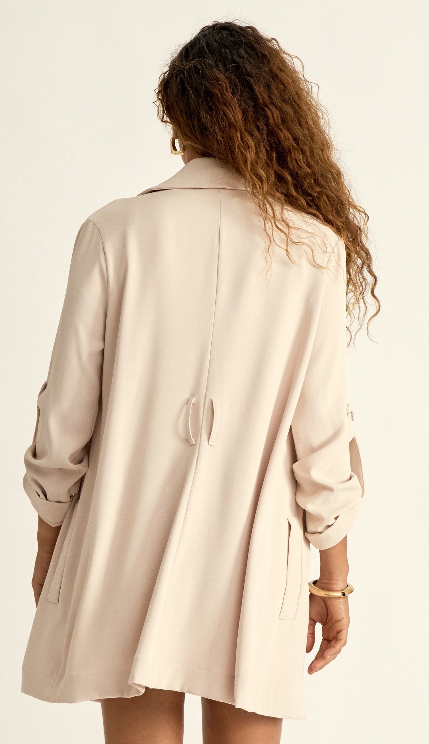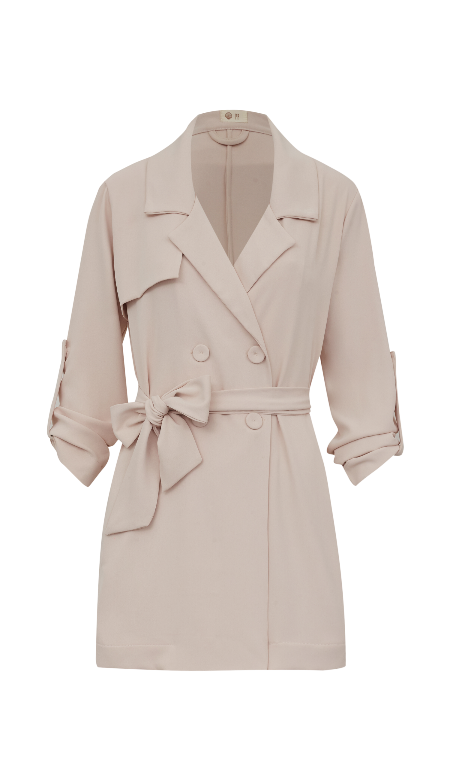 Blazer alongado confeccionado em crepe de alfaiataria. Possui modelagem mais ampla, fechamento frontal por duas fileiras de botões forrados, gola em V com lapela dobrada, mangas longas com martingale para ajuste do comprimento, bolsos laterais, passantes duplos nas costas e acompanha faixa solta para amarrar na cintura e ajustar a silhueta.