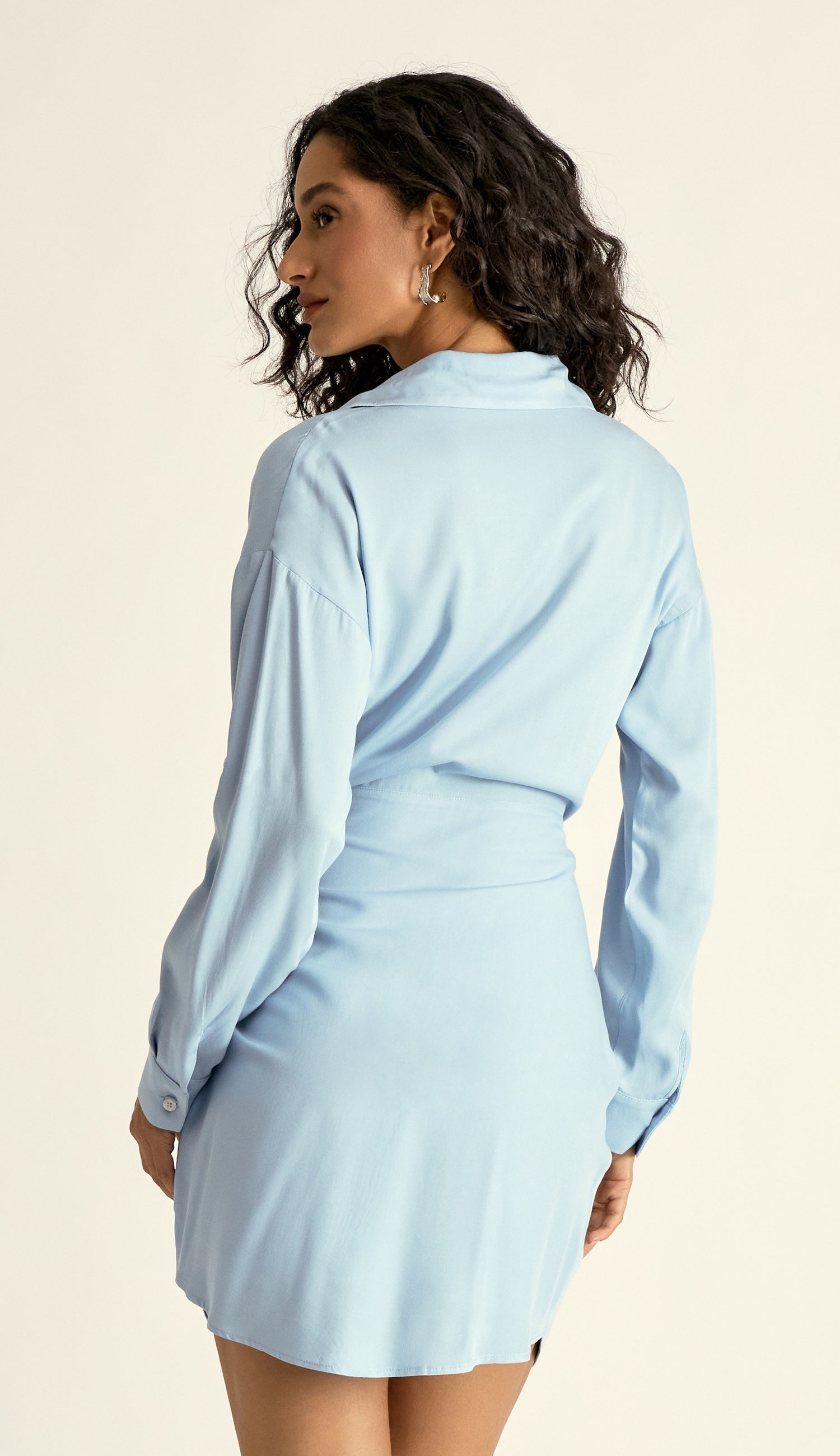 Vestido chemise ajustado confeccionado em viscose twill. Possui forro na parte da saia, fechamento frontal e dos punhos por botões madrepérola, cavas deslocadas, mangas longas com martingale para ajuste do comprimento e tecido fixo nas laterais para amarração frontal com sobreposição e efeito drapeado que dá todo o charme e diferencial para o modelo!