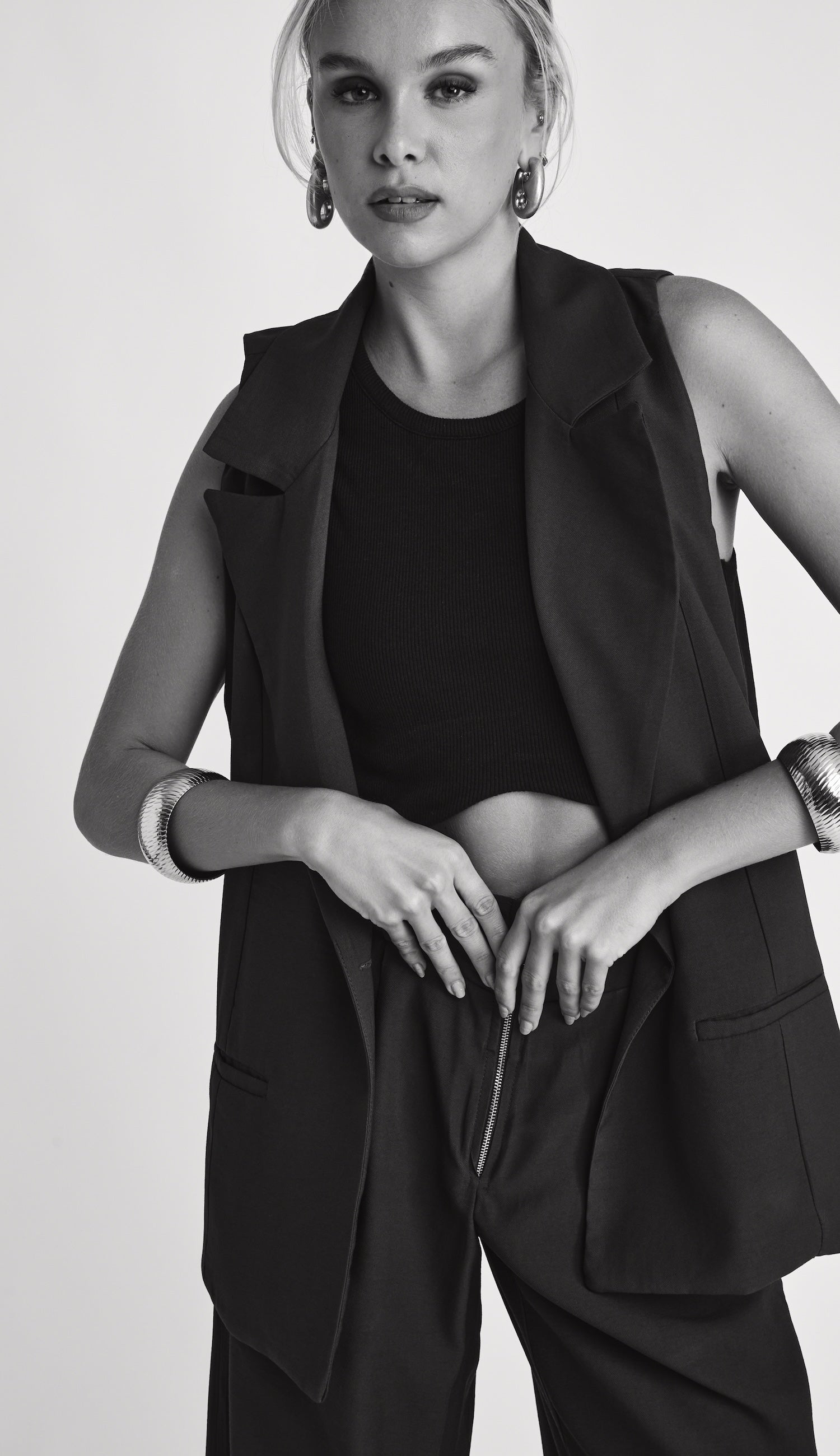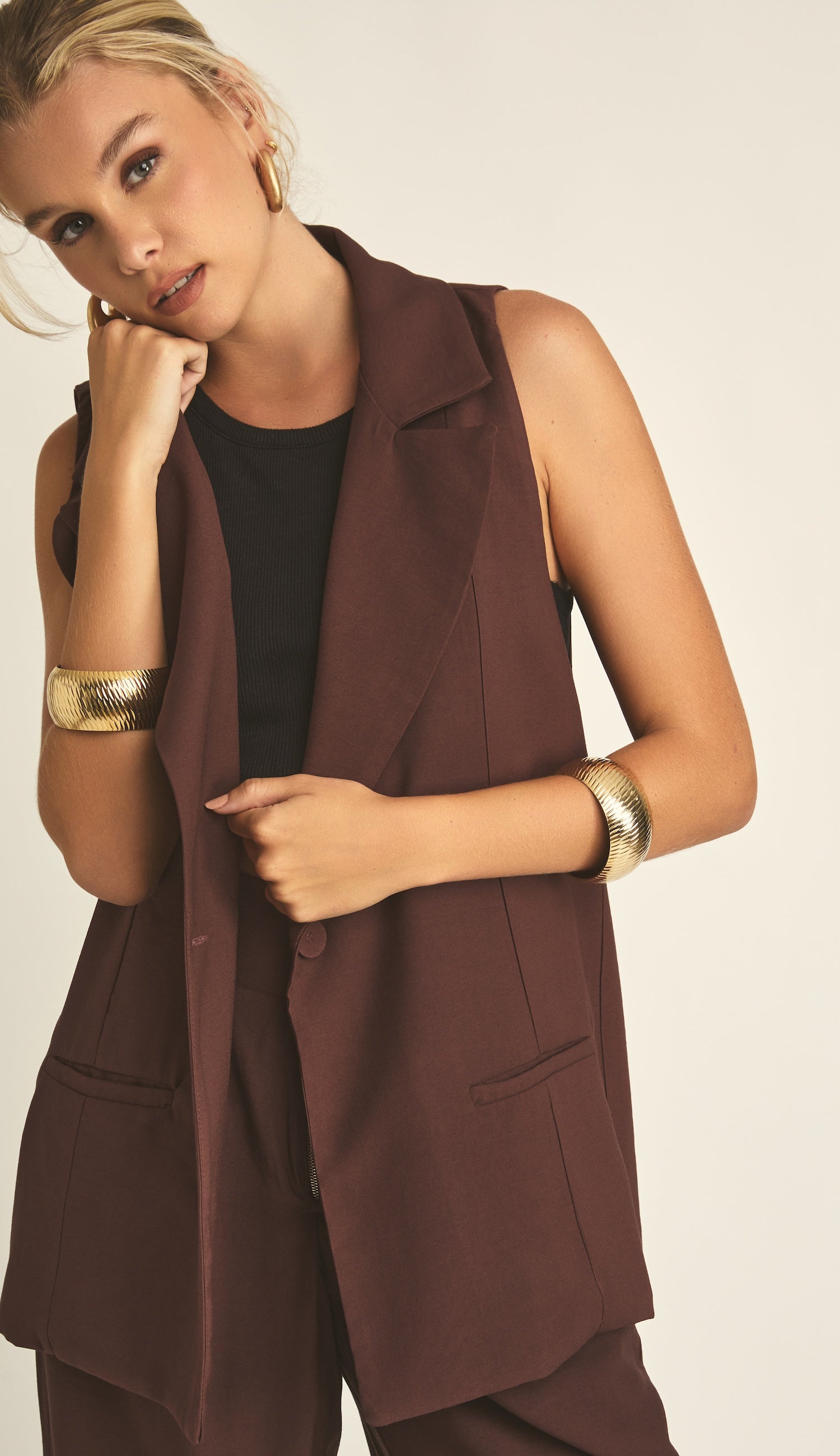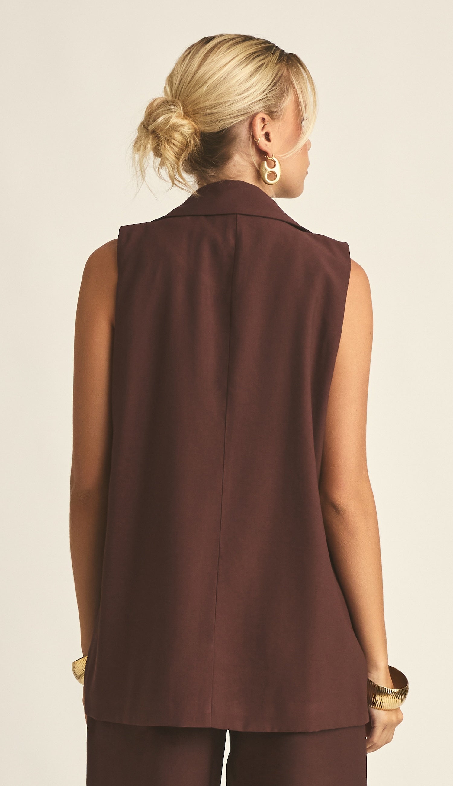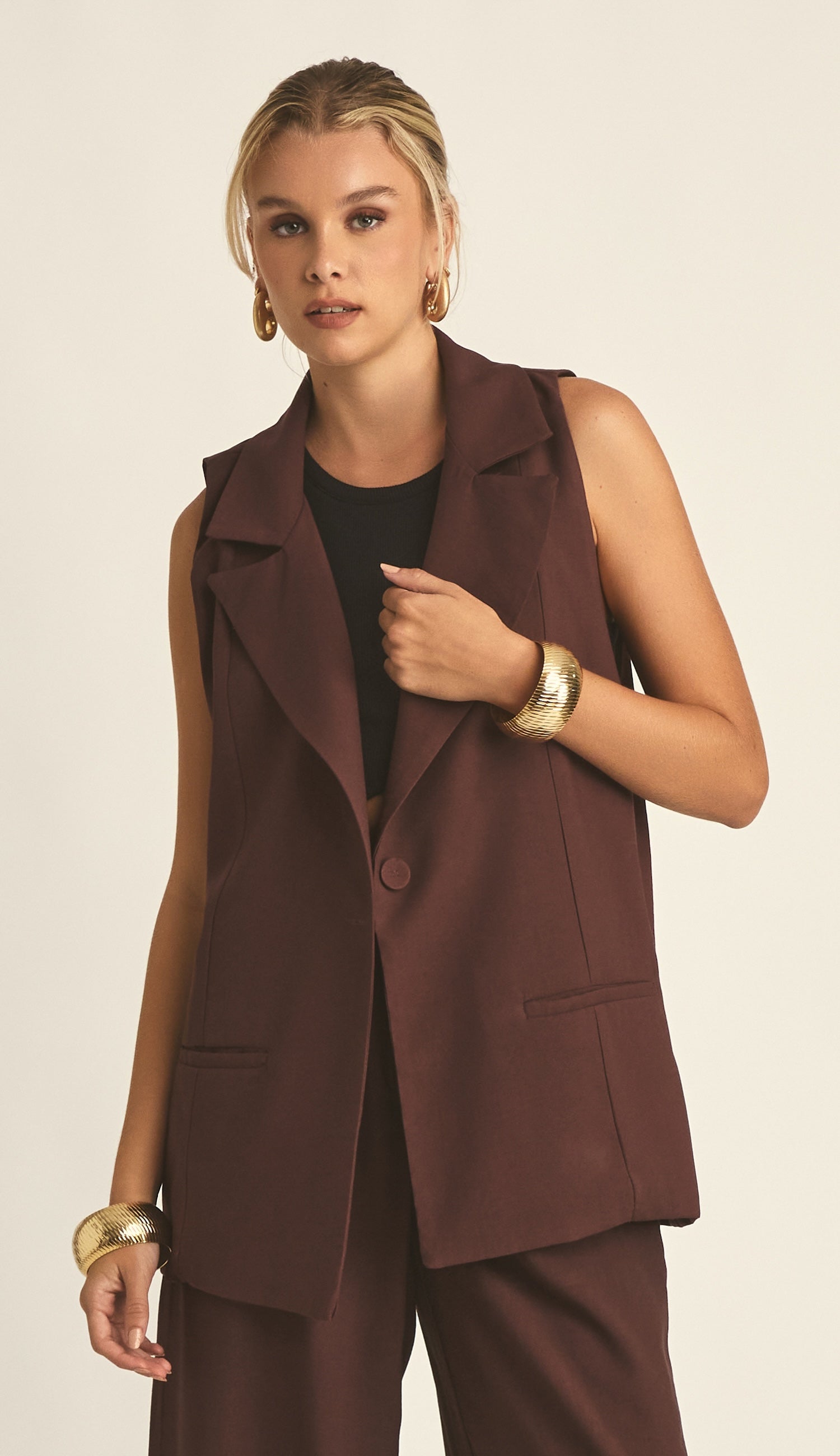Colete regata com forro, confeccionado em sarja de alfaiataria em poliviscose mais encorpada com aspecto amassadinho. Possui modelagem soltinha e alongada, decote em V com lapela dobrada na gola, bolsos frontais embutidos e fechamento frontal por botão forrado.