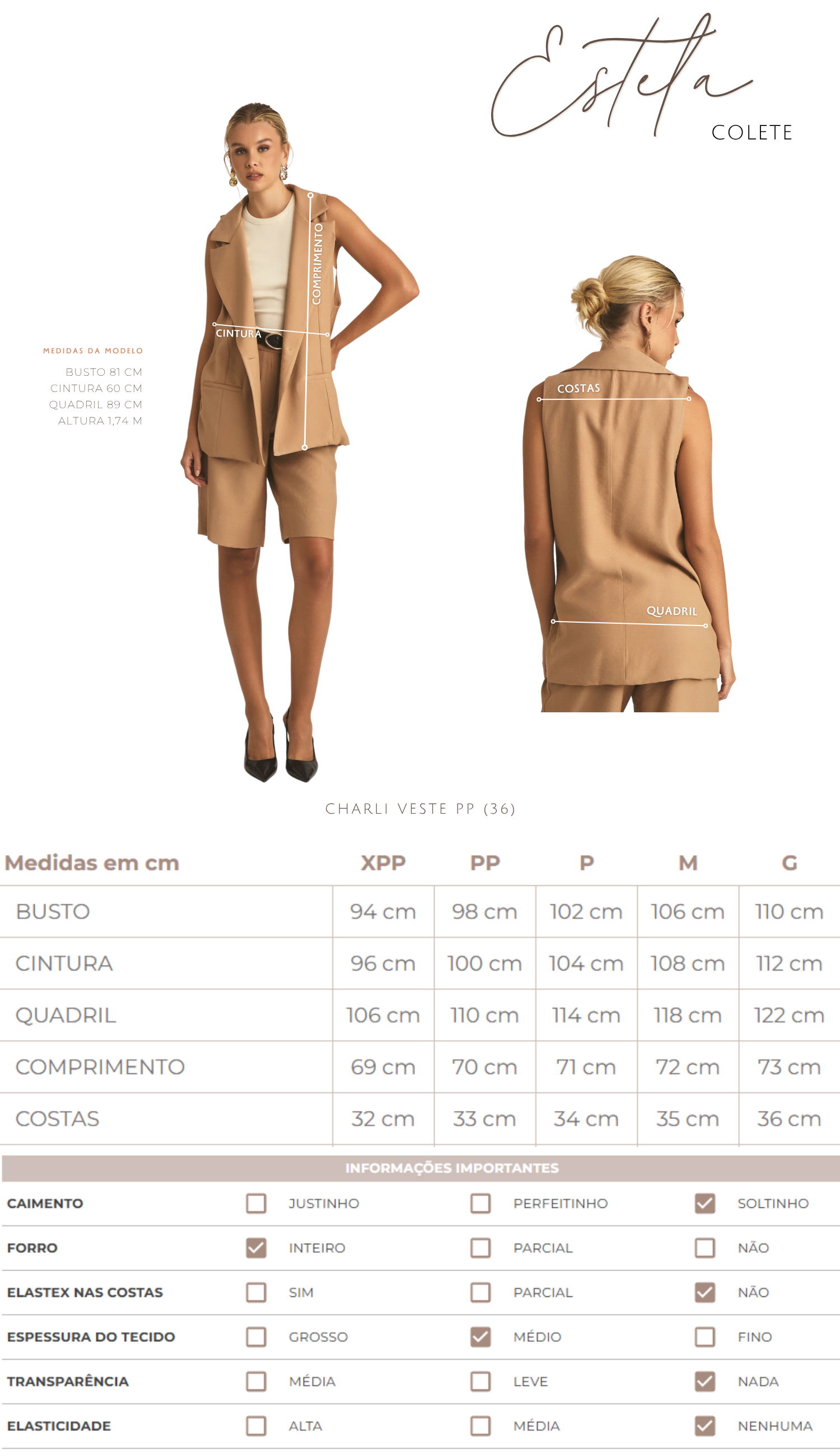 Colete regata com forro, confeccionado em sarja de alfaiataria em poliviscose mais encorpada com aspecto amassadinho. Possui modelagem soltinha e alongada, decote em V com lapela dobrada na gola, bolsos frontais embutidos e fechamento frontal por botão forrado.