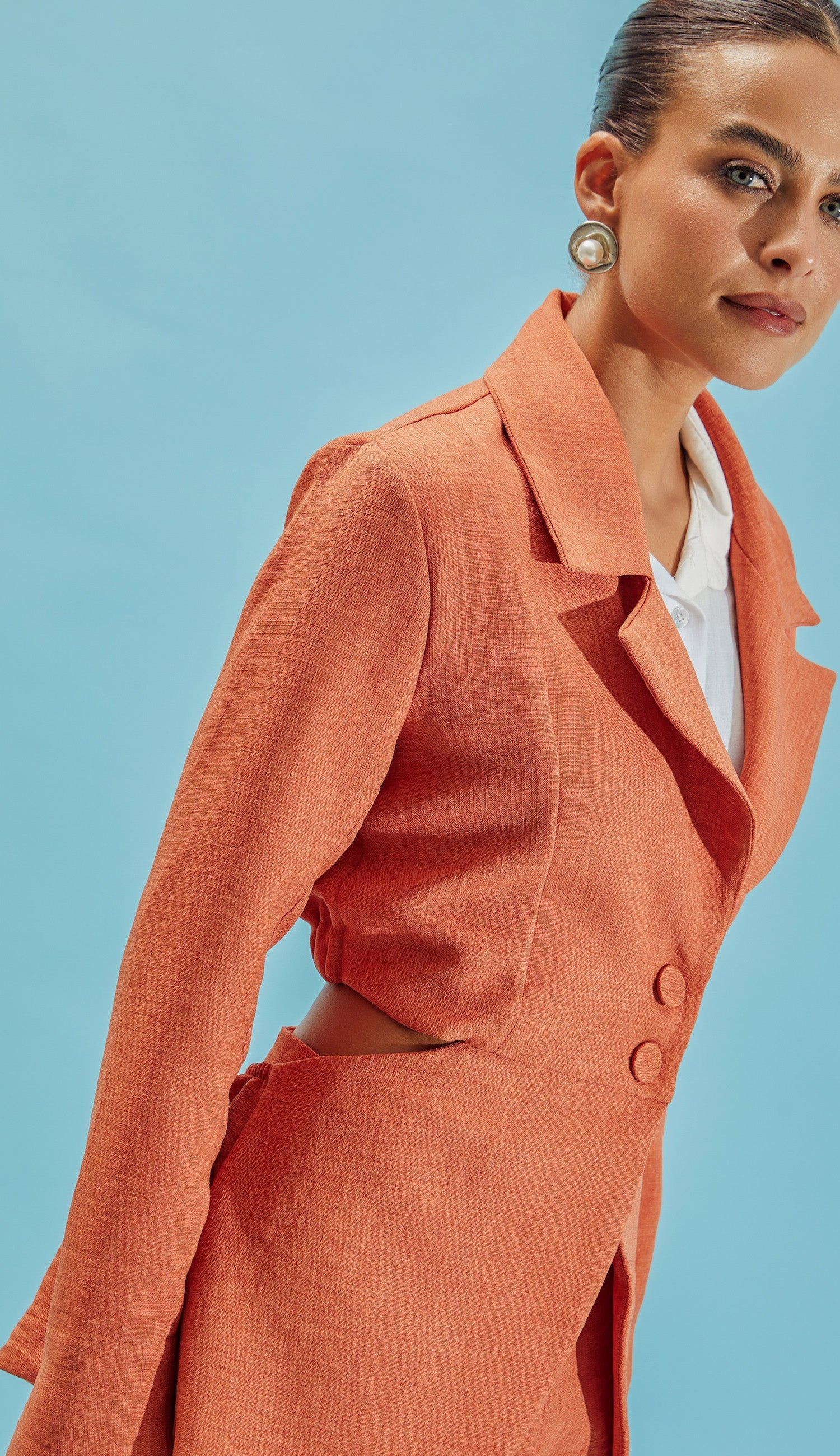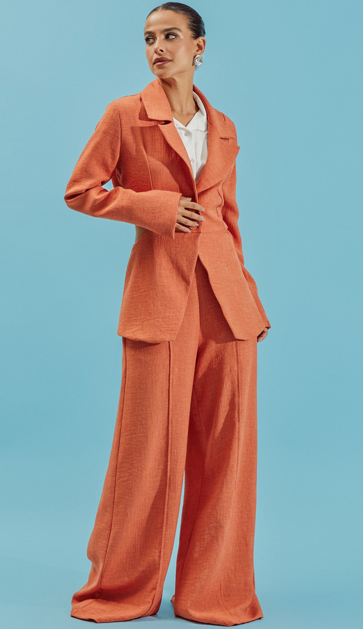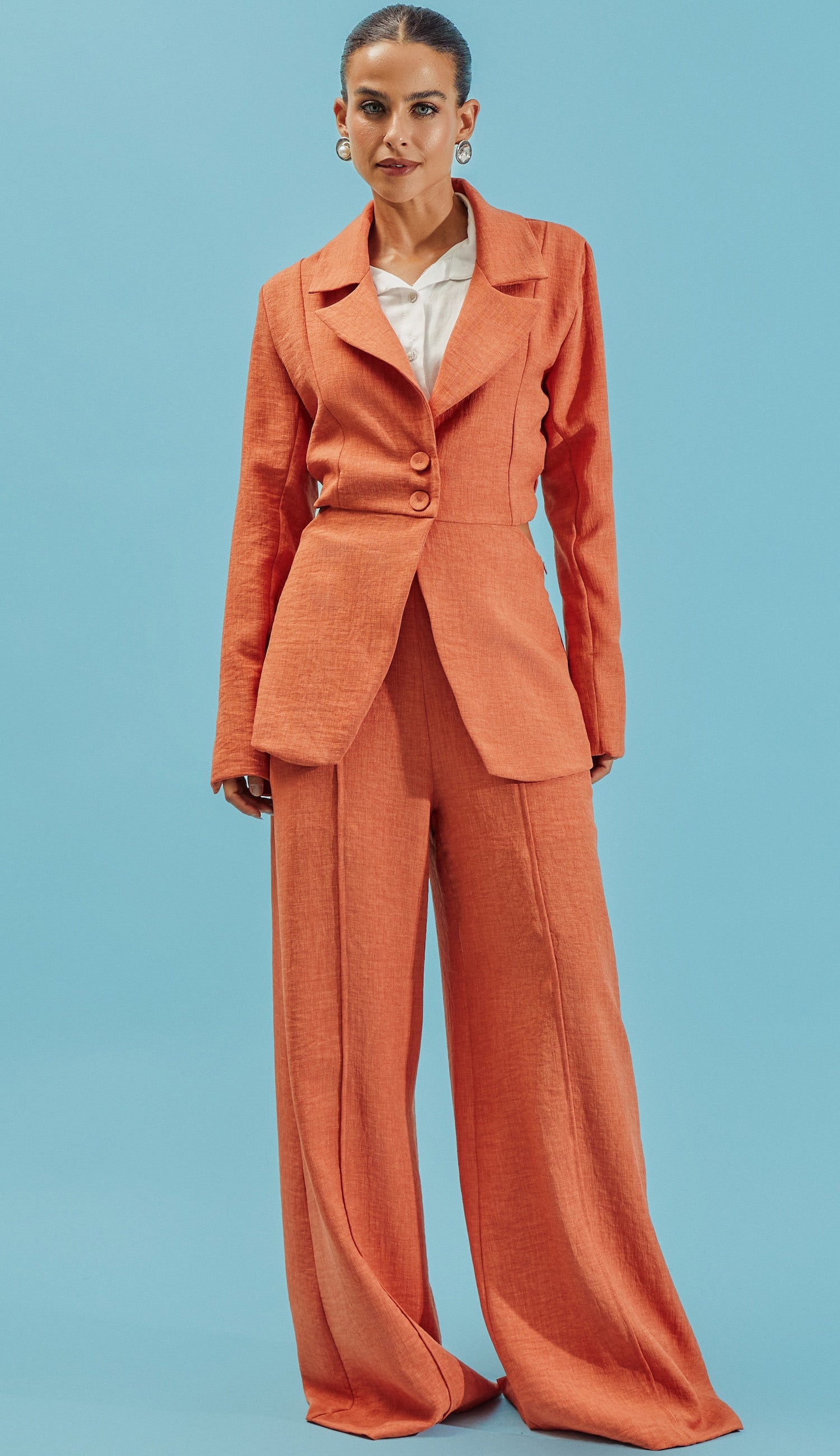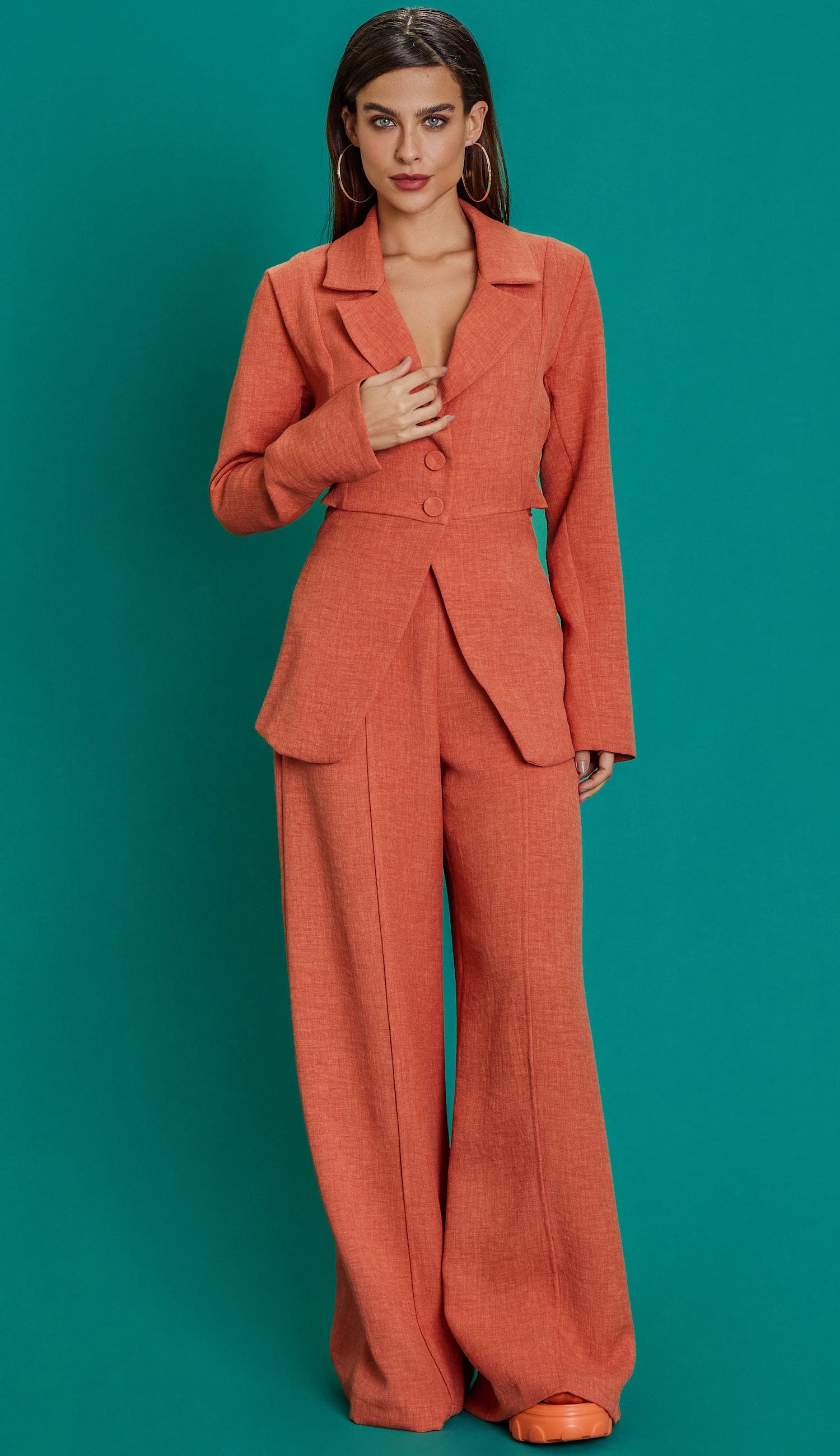 Conjunto com forro, confeccionado em poliéster com aspecto de linho com efeito marmorizado. O blazer mais descontruído possui comprimento alongado, mangas longas com abertura lateral, lapelas dobradas na gola, fechamento frontal por botão único forrado, recorte vazado nas costas com elástico e fendinha na barra traseira. A calça é pantalona, possui bolsos e vincos frontais e fechamento lateral por zíper invisível. Esse conjunto une a elegância do linho com a praticidade do poliéster, que não amassa facilmente.