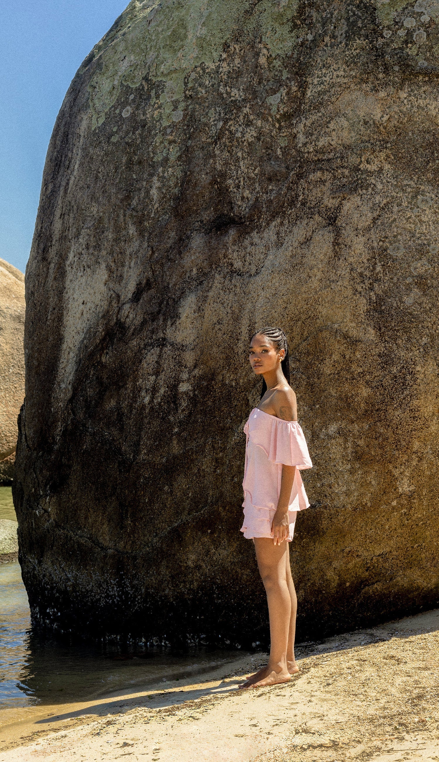 Conjunto confeccionado em crepe leve com forro. A blusa possui decote ciganinha; elástico franzido no decote e nos ombros; tirinhas no centro do decote para amarração com ponteiras de metal em formato de conchinha, que permite diversos tipos de amarração; babado que vai do decote até as costas, criando mangas também; lastex franzido nas costas para melhor ajuste ao corpo e abertura frontal na blusa que deixa a parte de baixo à mostra. O shorts saia possui fechamento lateral por zíper invisível e modelagem soltinha evasê com camadas diagonais transpassadas e sobrepostas.