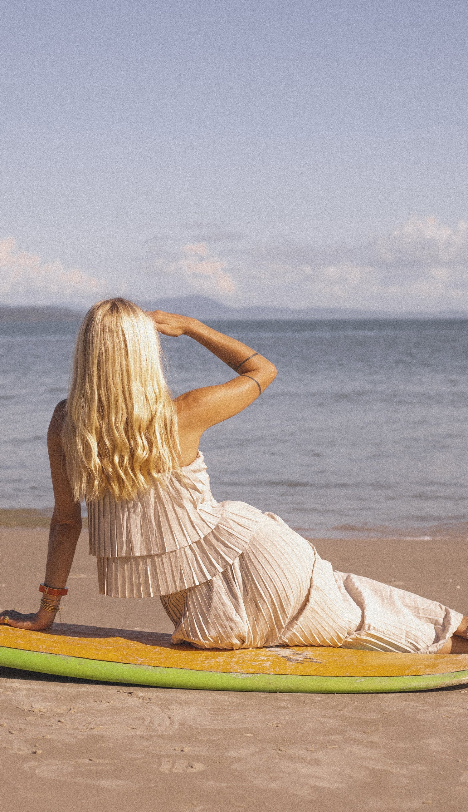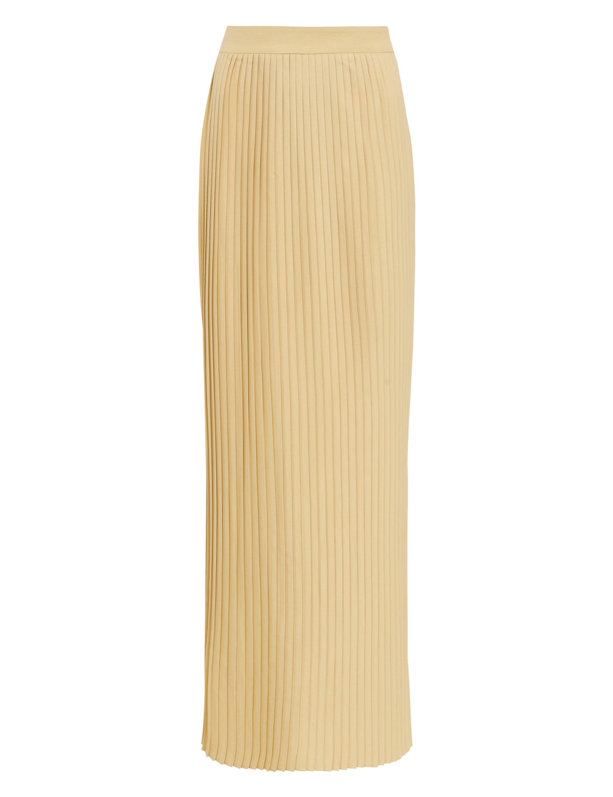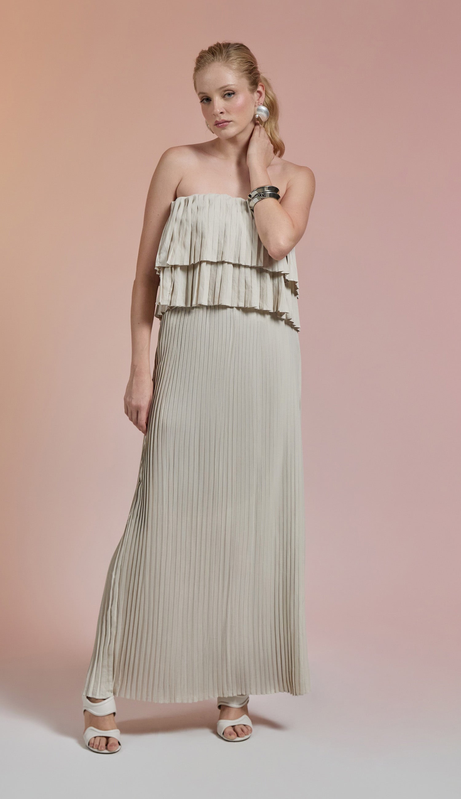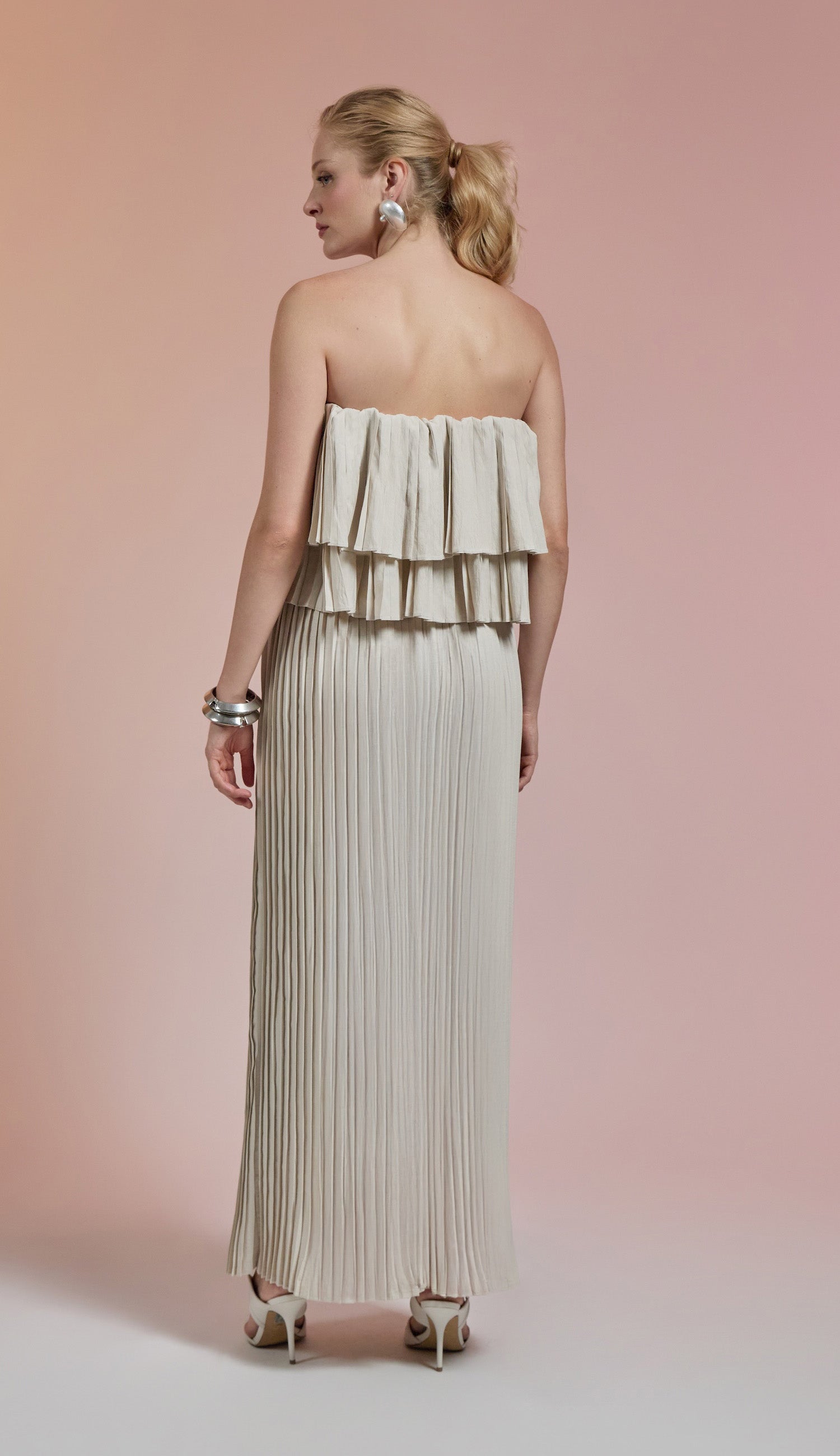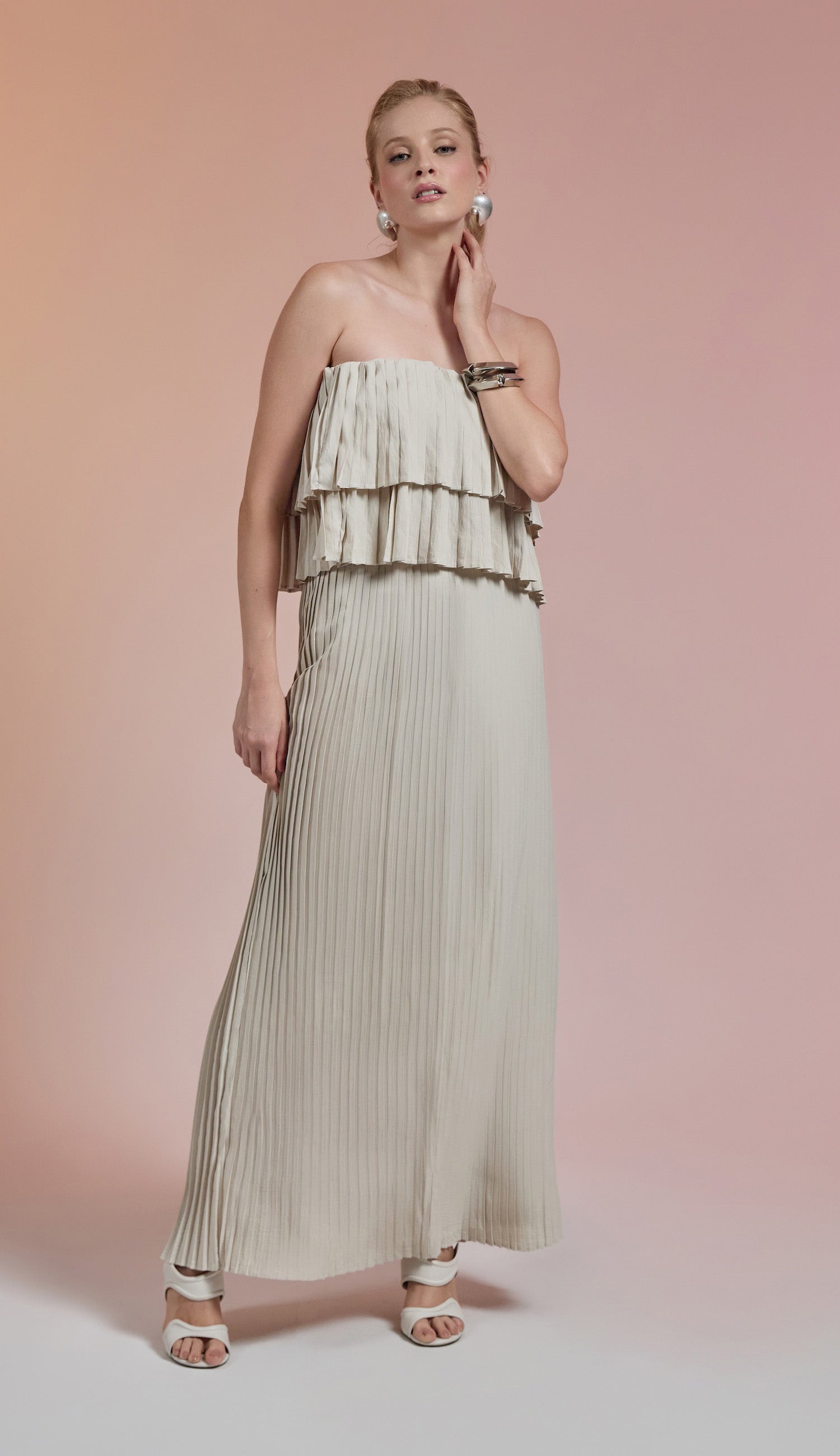 Conjunto confeccionado em poliéster plissado com aspecto de liocel e efeito amassadinho. O top não tem mangas, possui decote reto com elástico interno e é composto por duas camadas sobrepostas e tecido em lastex por baixo, para melhor ajuste ao corpo. A saia é longa, soltinha e possui pala no cós e fechamento traseiro por zíper invisível. O tecido garante praticidade e elegância, pois, devido à sua composição, não amassa facilmente e o aspecto de 'tecido nobre' dá um ar sofisticado ao look.