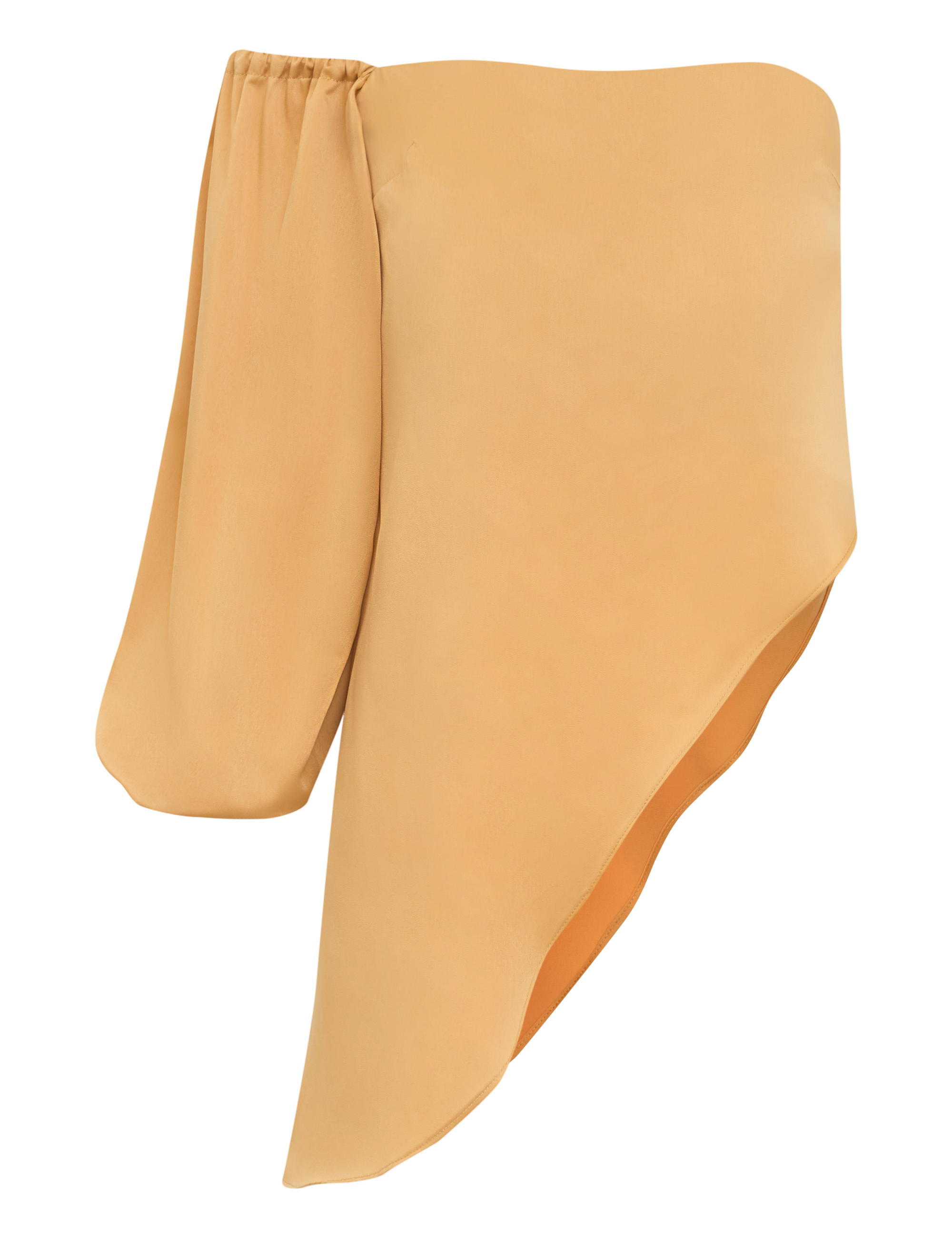 Conjunto confeccionado em alfaiataria acetinada. A blusa é ombro único, possui barrado assimétrico com uma das laterais mais alongadas do que a outra, decote reto com elástico interno e manga longa bufante com abertura superior e elástico franzido no ombro e no punho, podendo ser usada no lugar ou estilo ciganinha. A saia é curta e ajustada; possui forro e fechamento traseiro por zíper invisível.