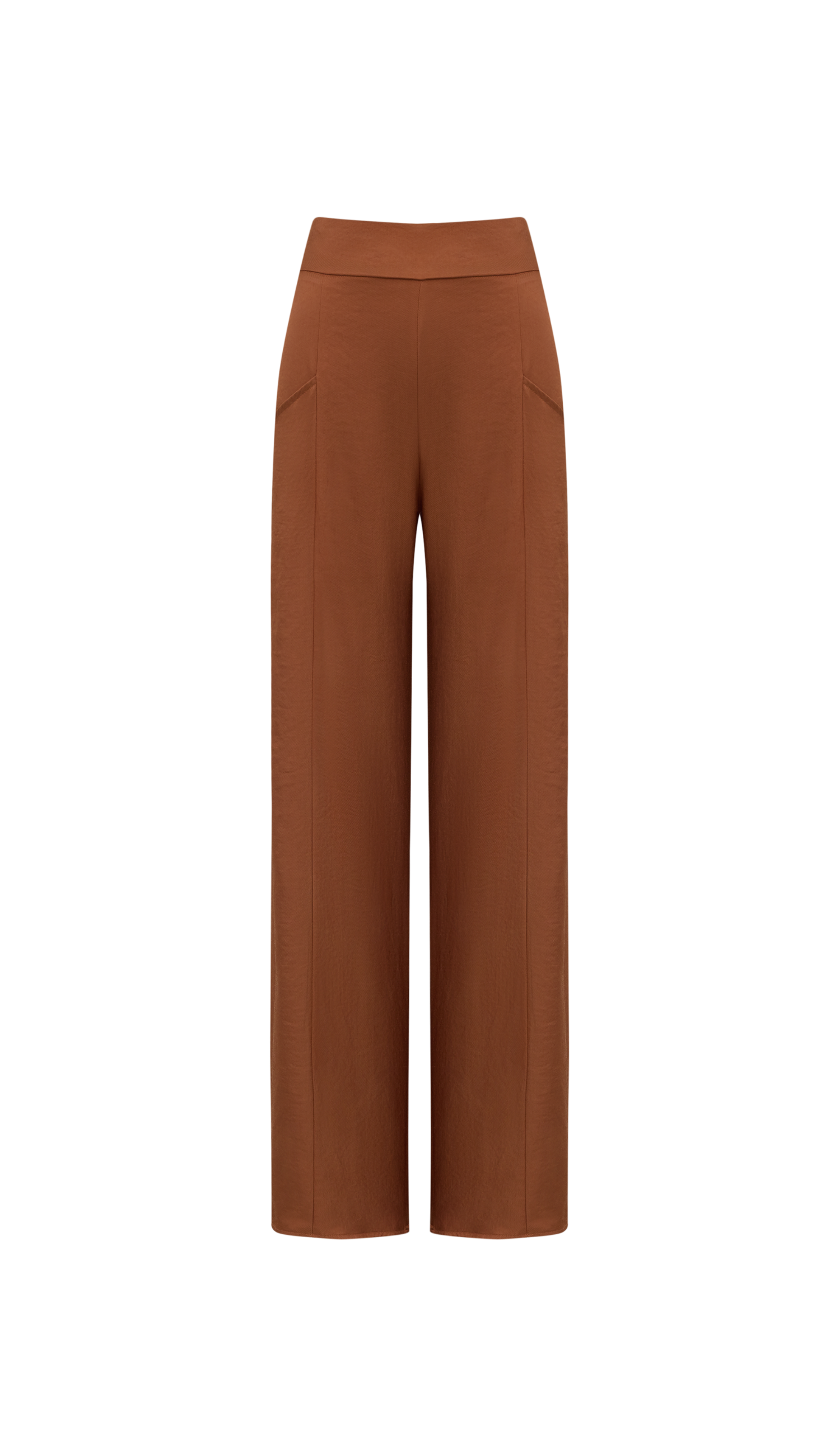 Conjunto confeccionado em alfaiataria acetinada com aspecto levemente amassadinho. A camisa possui modelagem reta e soltinha, decote em V, lapela dobrada na gola estilo blazer, fechamento frontal e dos punhos por botões forrados, 4 bolsos chapados frontais com detalhe de preguinha, mangas longas com martingale para ajuste do comprimento e preguinhas nos punhos e nas costas para melhor caimento. A calça é estilo wide com pala larga no cós, vincos frontais que alongam a silhueta, bolsos amplos laterais com recorte diagonal, fechamento lateral por zíper invisível e acompanha cinto de cordão revestido no mesmo tecido para amarrar.