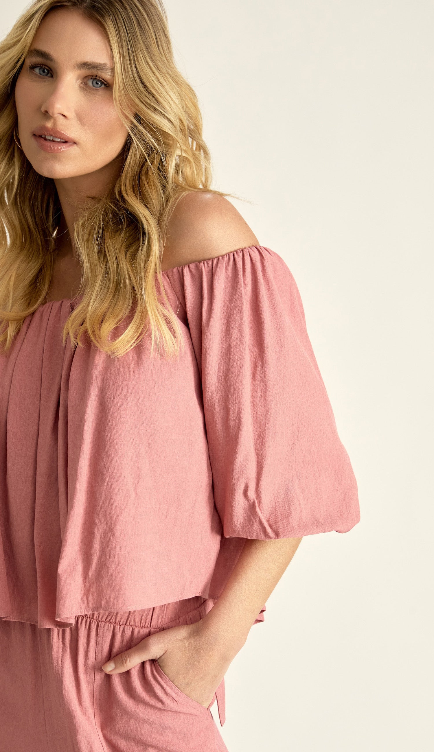 Conjunto com forro, confeccionado em poliviscose texturizada com aparência de linho e aspecto levemente amassadinho. A blusa possui modelagem ampla, decote ciganinha com elástico franzido, mangas 3/4 balonê com elástico franzido revestido no punho e acompanha tirinha no mesmo tecido com ponteiras de metal em formato de conchinha para amarrar da forma que quiser. A calça é estilo wide, com pernas mais retas levemente amplas, possui elástico franzido no cós, detalhe de botão forrado de enfeite na frente, recortes pespontados em toda a peça, parecendo "retalhos", bolsos faca laterais e bolsos traseiros com lapela dobrada.