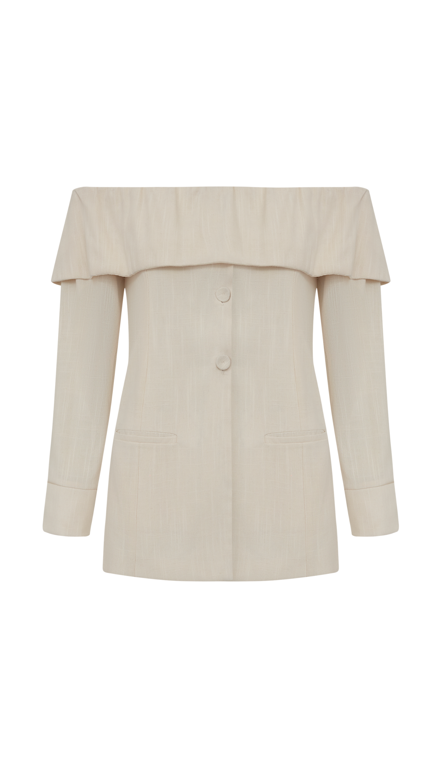 Conjunto confeccionado em linho texturizado encorpadinho com forro. A blusa possui modelagem justa e alongada, decote ciganinha com elástico franzido e detalhe de pala dobrada no decote, mangas longas com aberturinha nos punhos, fechamento frontal por botões forrados parecendo um blazer; os botões vão só até o meio da peça, o que deixa uma abertura frontal super charmosa; conta ainda com recortes que modelam a silhueta e bolsinhos frontais embutidos. A calça é estilo wide, com pernas retas não muito amplas e possui vincos frontais que alongam a silhueta, bolsos laterais, pala no cós e fechamento lateral por zíper invisível.