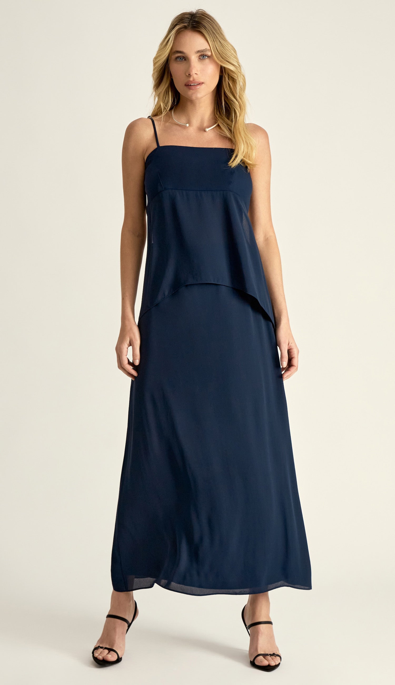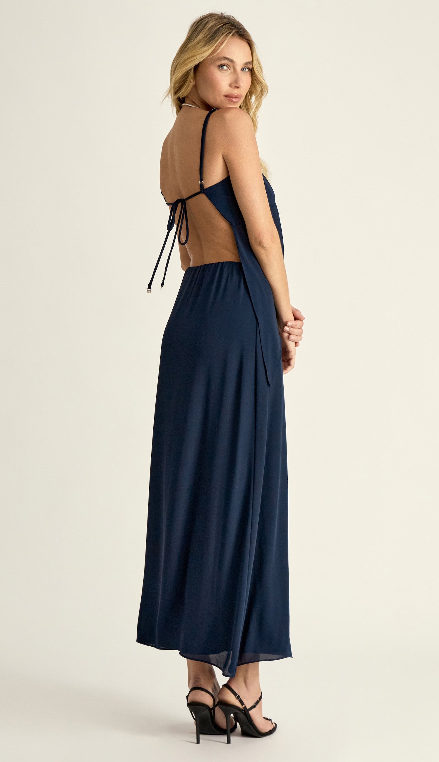 Conjunto confeccionado em crepe leve com forro. A blusa é frente única com costas abertas, possui decote reto, modelagem alongada, alcinhas reguláveis, recorte logo abaixo do busto no estilo império, seguido de tecido soltinho com detalhe de pontas assimétricas na lateral das barras e fechamento nas costas por tirinha comprida para amarrar com ponteiras de metal em formato de conchinha. A saia é longa e ajustada até o quadril e soltinha logo em seguida, para facilitar a movimentação e possui elástico franzido no cós.