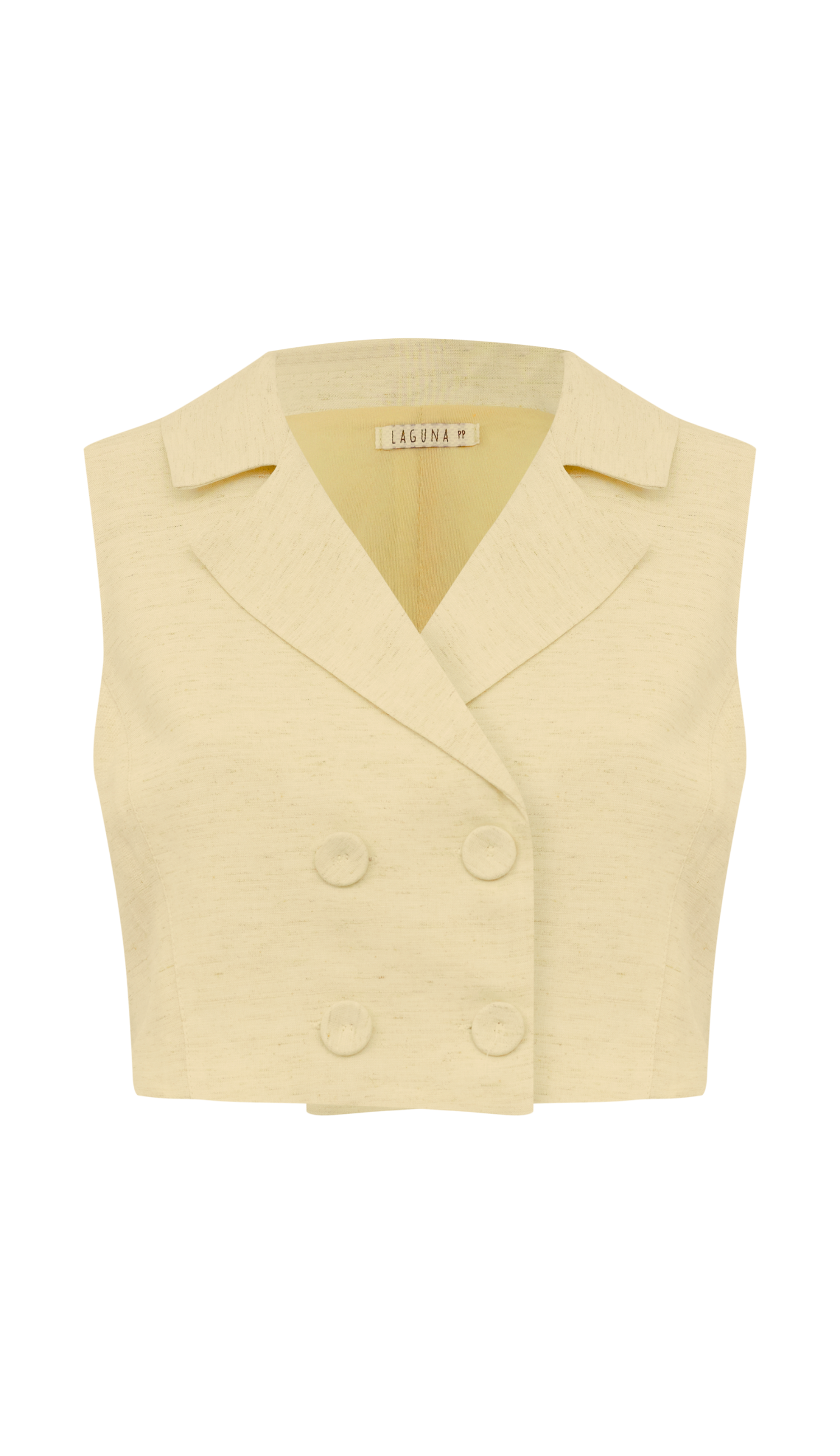 Conjunto confeccionado em linho com forro. O colete é cropped e possui modelagem soltinha, lapela dobrada na gola estilo blazer, fechamento frontal por fileira dupla de botões forrados e recortes que modelam a peça. A calça é pantalona e possui fechamento frontal por zíper e botão forrado, passantes frontais que criam uma prega com volume que é super elegante, bolsos traseiros e passantes comuns nas costas.
