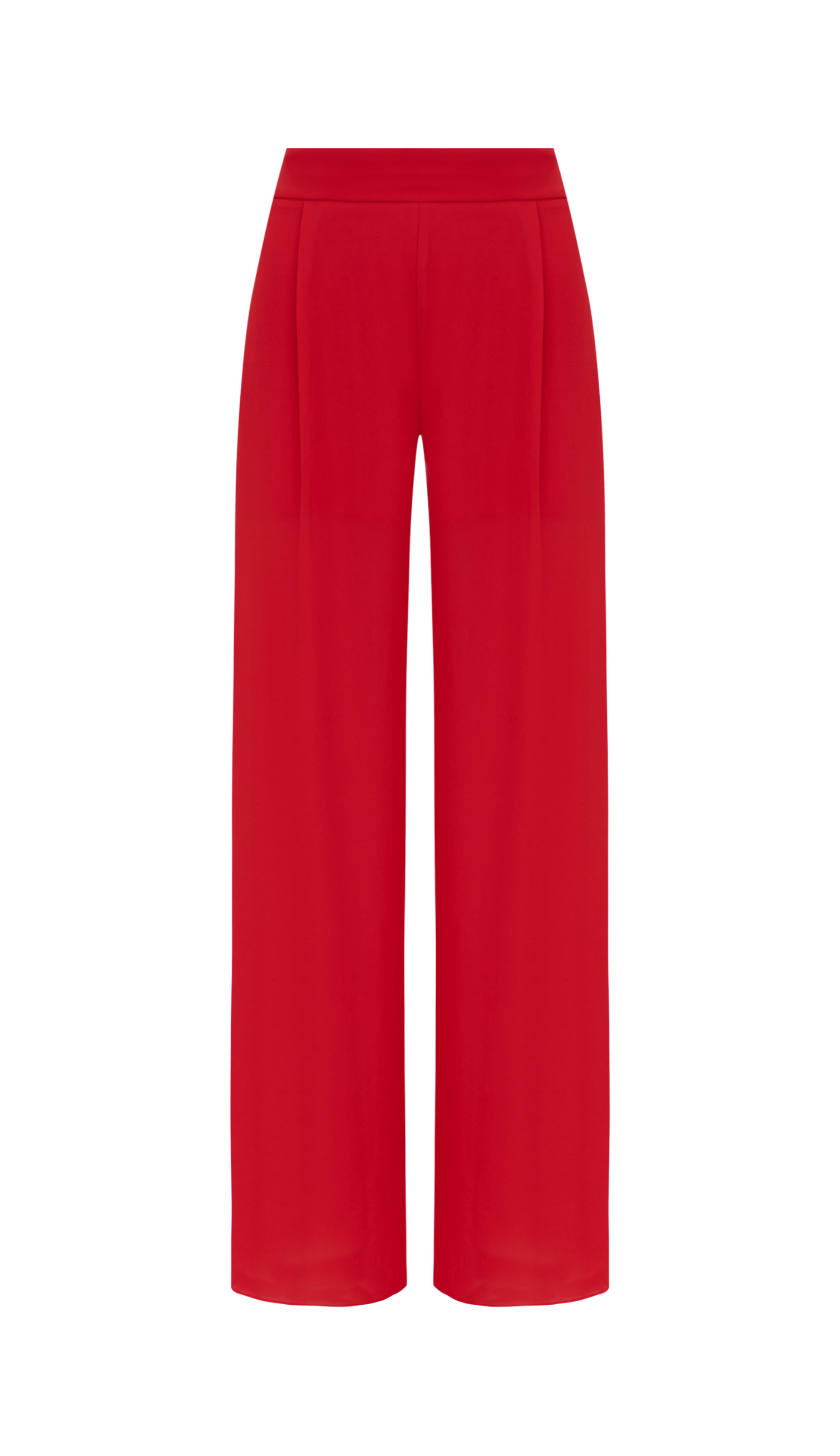Conjunto confeccionado em crepe com forro. A blusa não possui manga e conta com decote reto com elástico interno; top de forro fixo no busto com elástico também para melhor sustentação e modelagem ampla e alongada com recorte assimétrico na barra. A calça é pantalona, possui pregas frontais, cós largo e fechamento lateral por zíper invisível.