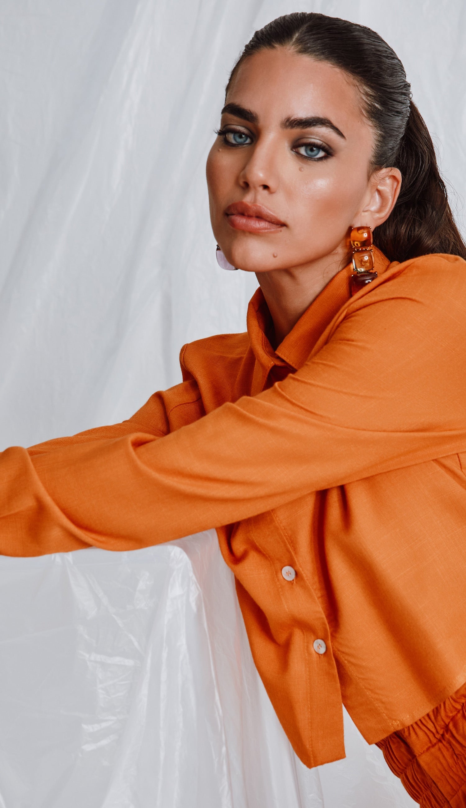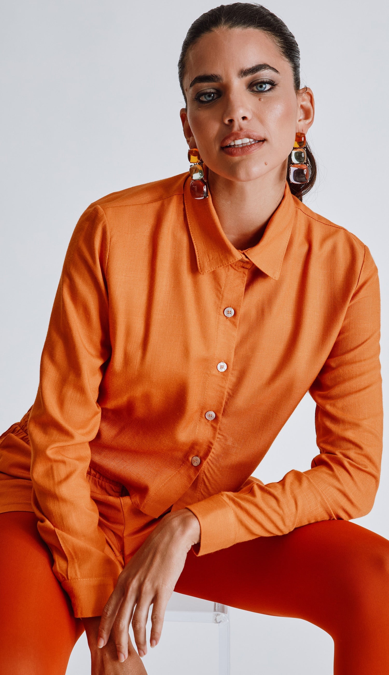 Conjunto confeccionado em viscose com toque e aspecto de linho. A camisa é cropped e possui modelagem solta, gola tradicional e fechamento frontal e nos punhos por botões madrepérola. O shorts possui forro, modelagem soltinha, fechamento frontal por zíper não aparente, cós bem largo com elásticos franzidos e bolsos laterais.