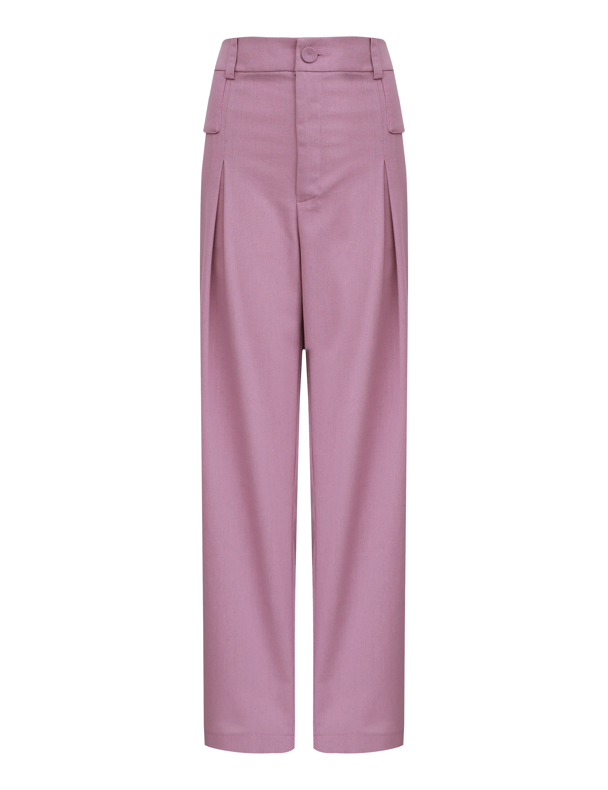 Conjunto confeccionado em linho. O top possui forro, alças largas com reguladores de metal, decote coração com pala e recortes que modelam o busto, barbatanas e recortes na cintura estilo corset, seguido de babadinho, fechamento traseiro por zíper de metal com conchinha da Laguna gravada pingente e lastex franzido nas costas para melhor ajuste ao corpo. A calça possui modelagem de alfaiataria, com cintura ajustada e pernas retas; fechamento frontal por zíper e botão forrado, passante no cós, pregas frontais e detalhe de lapela dobrada fixa nas laterais.