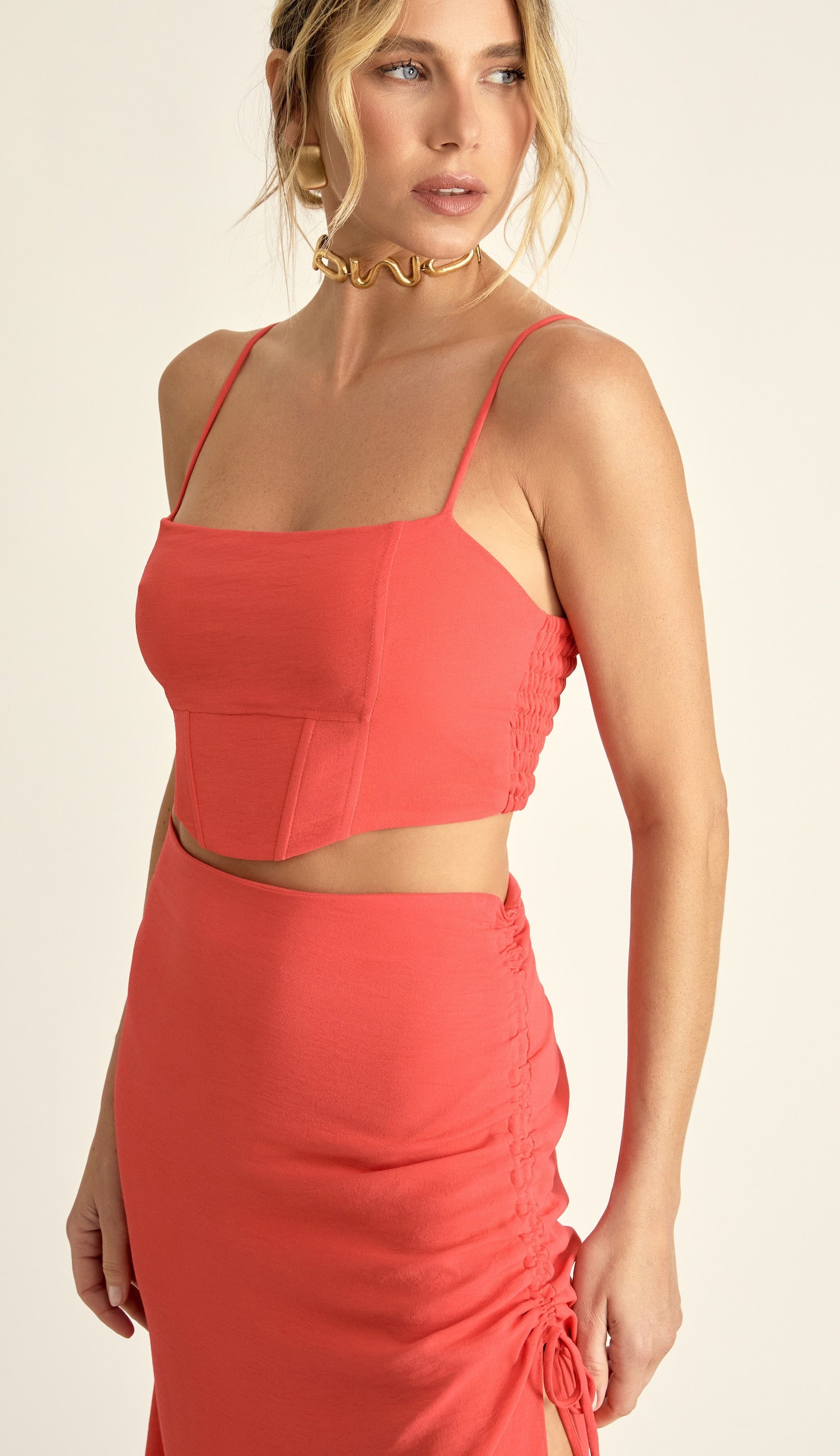 Conjunto com forro confeccionado em crepe texturizado com efeito amassadinho. O top possui decote reto, alcinhas reguláveis, recortes frontais com barra arredondada no estilo corset estruturado com barbatanas e lastex franzido nas costas para melhor ajuste ao corpo. A saia é longa, fechamento lateral por zíper invisível e modelagem ajustada ao corpo com recorte franzido lateral com tirinhas embutidas para para ajuste da fenda e amarração.