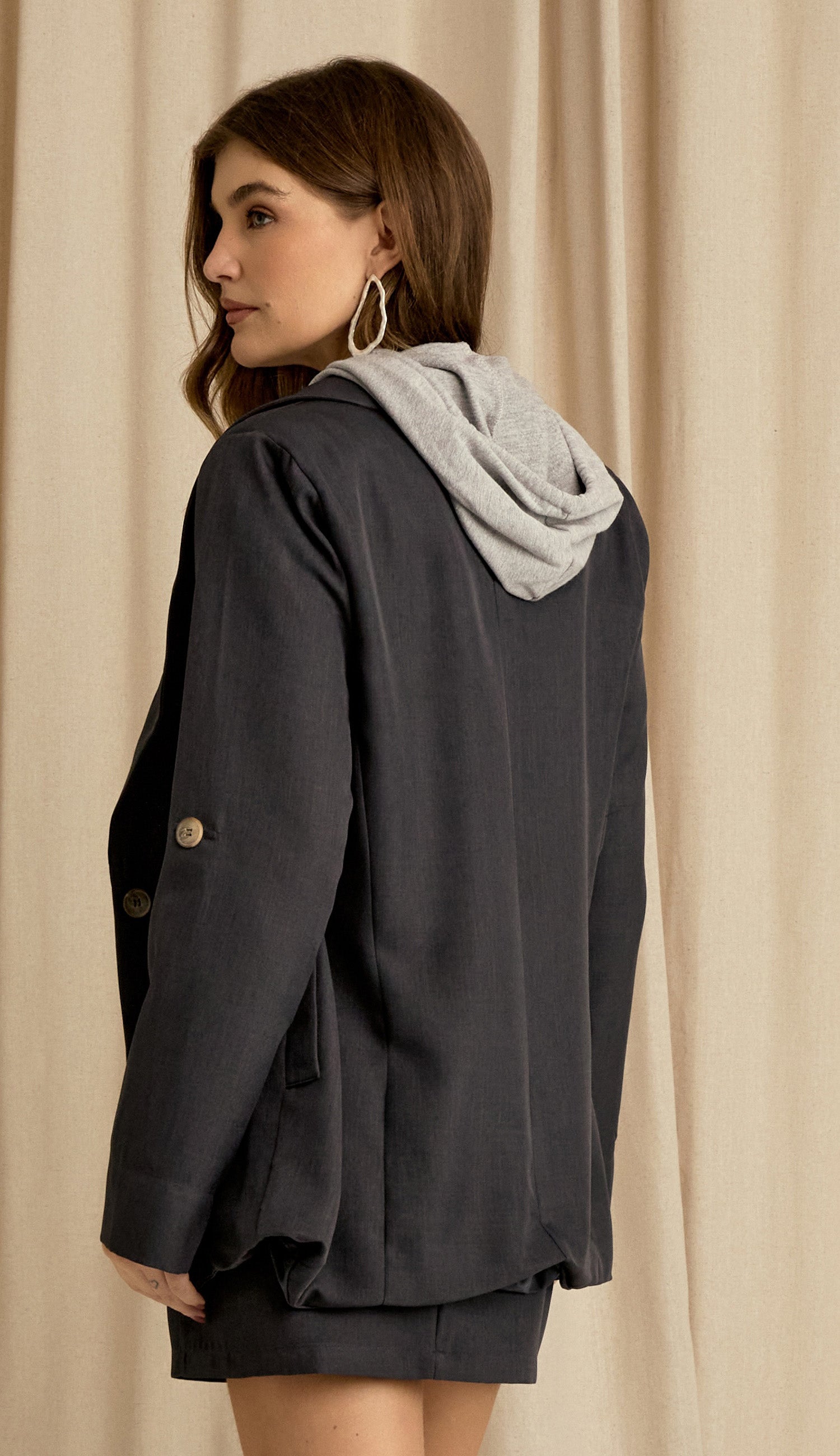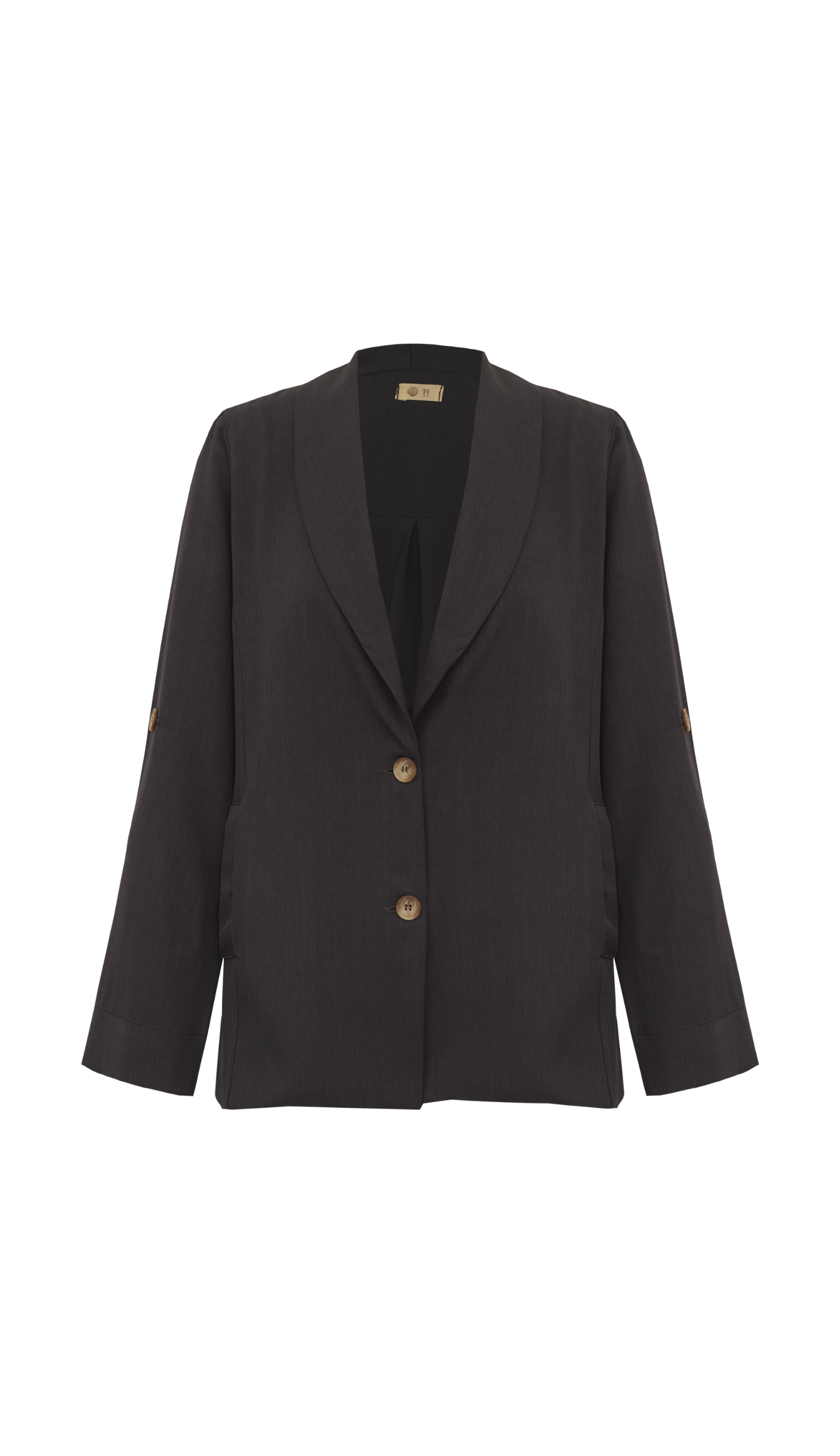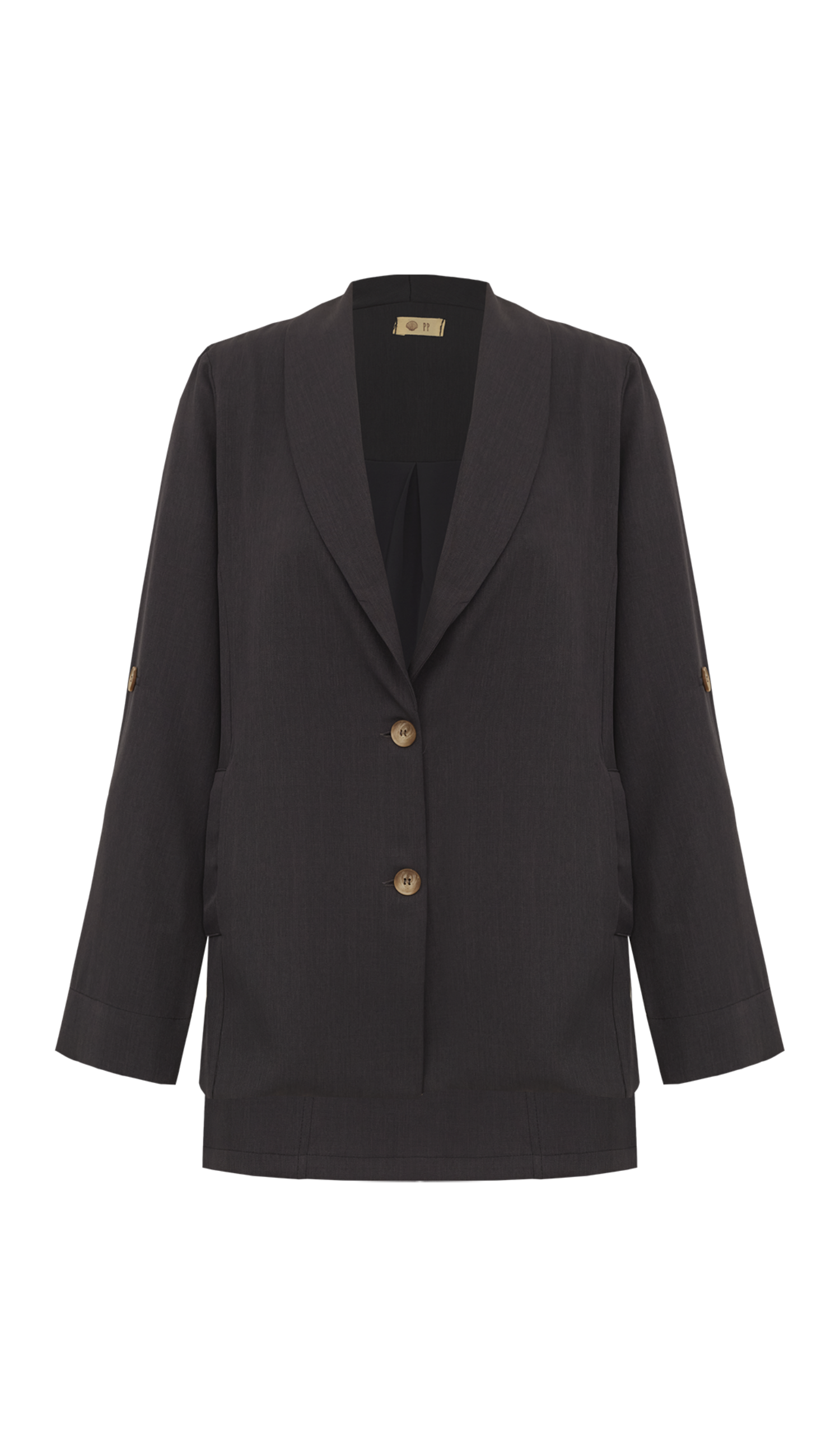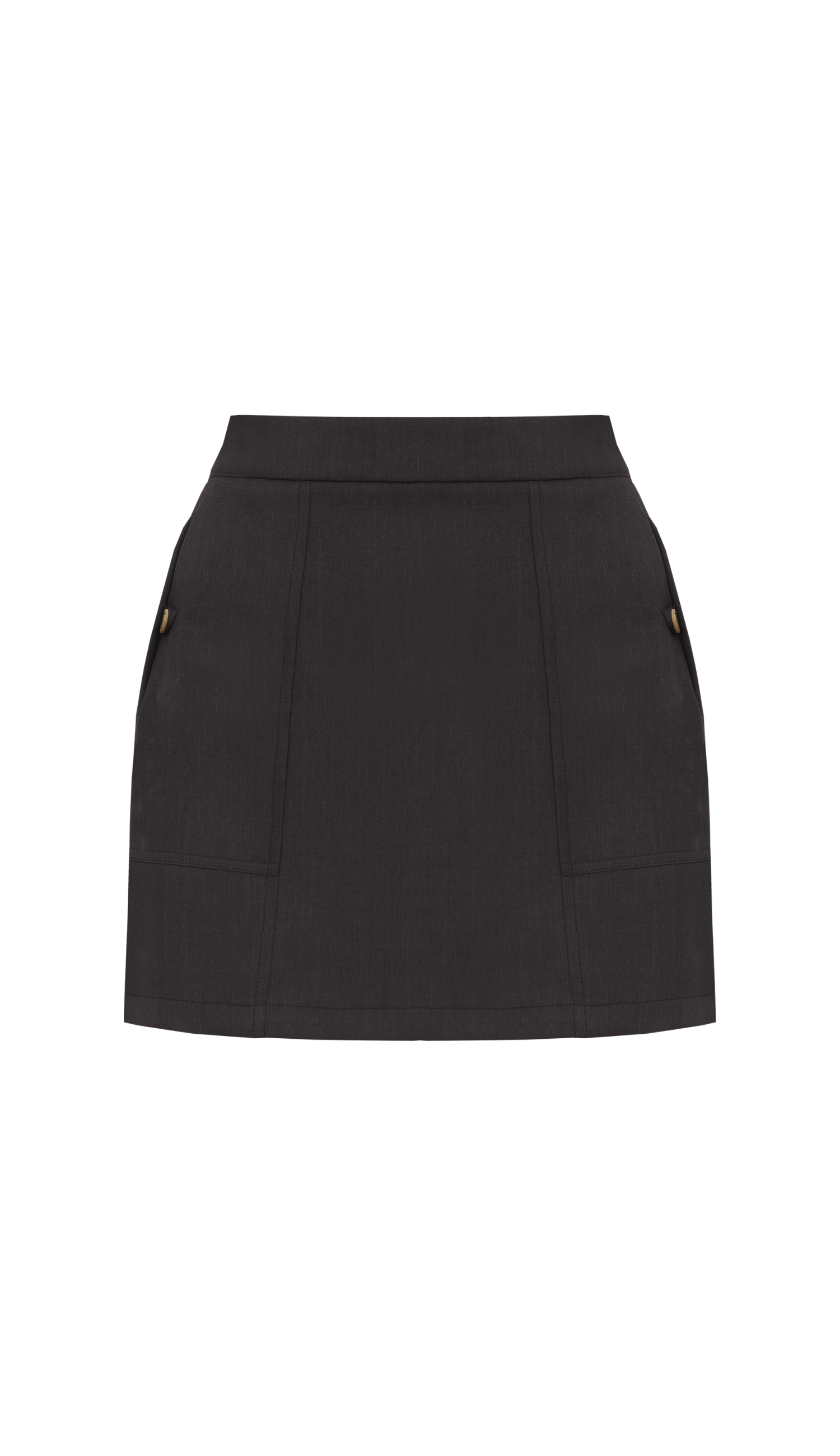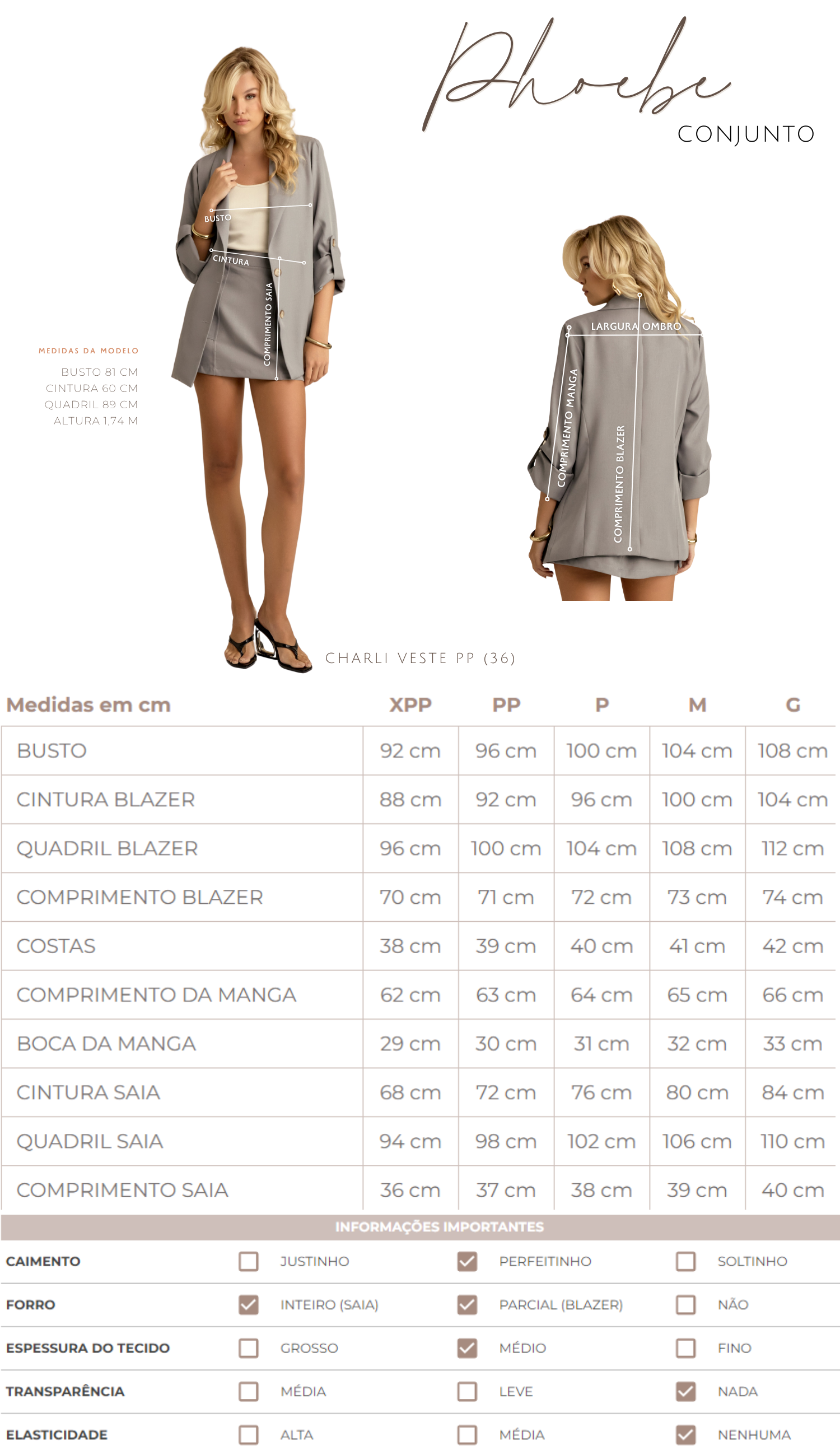 Conjunto confeccionado em alfaiataria com forro. O blazer é alongado e possui recortes que modelam o corpo, fechamento frontal por botões foscos rajados, lapela dobrada na gola, bolsos laterais, ombreiras para estruturar e mangas longas com martingale e botão para ajuste do comprimento. A saia é curta e ajustada e possui fechamento traseiro por zíper invisível, recortes frontais pespontados, bolsos laterais aplicados com detalhe de fechamento por botãozinho fosco rajado.