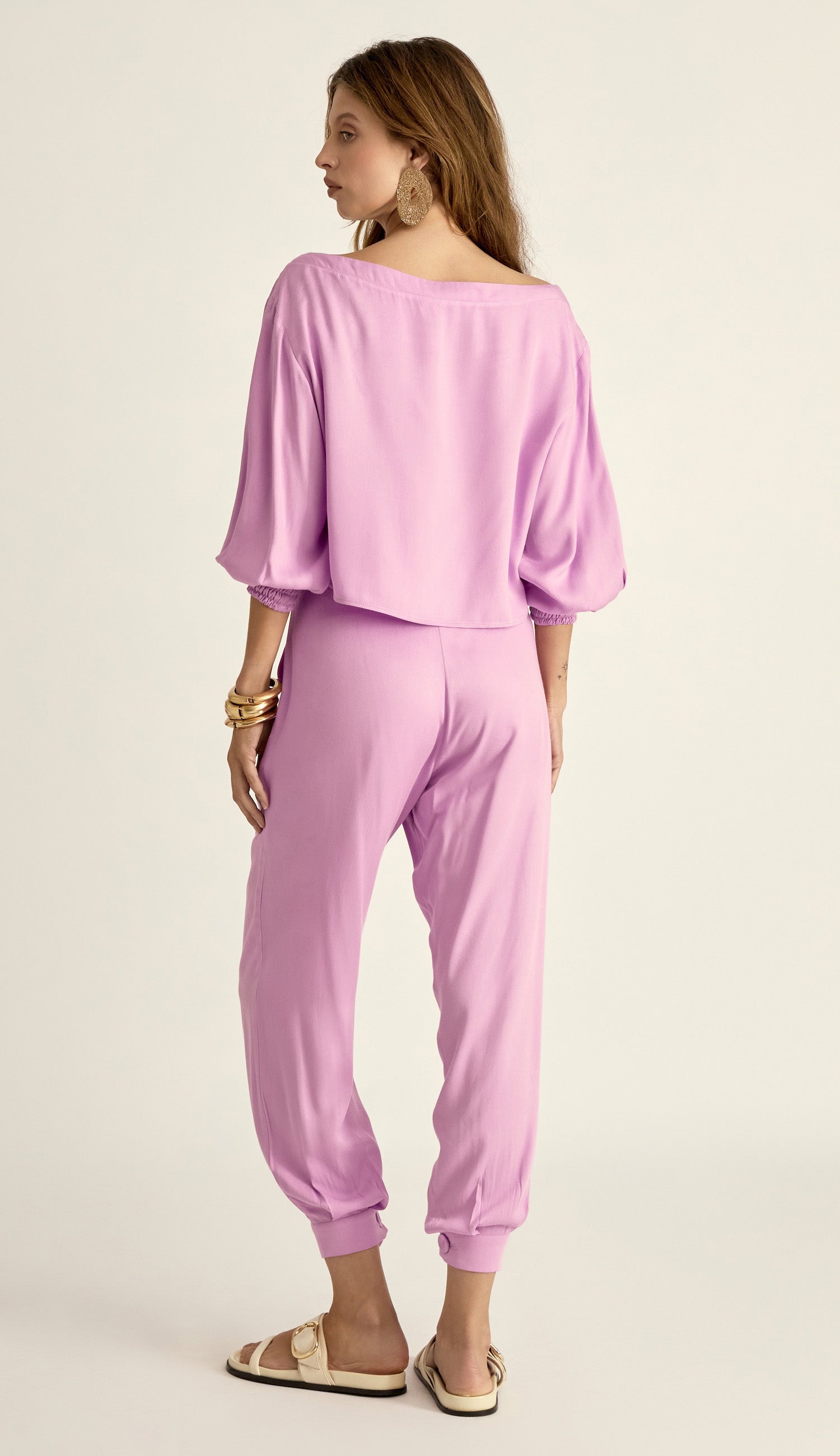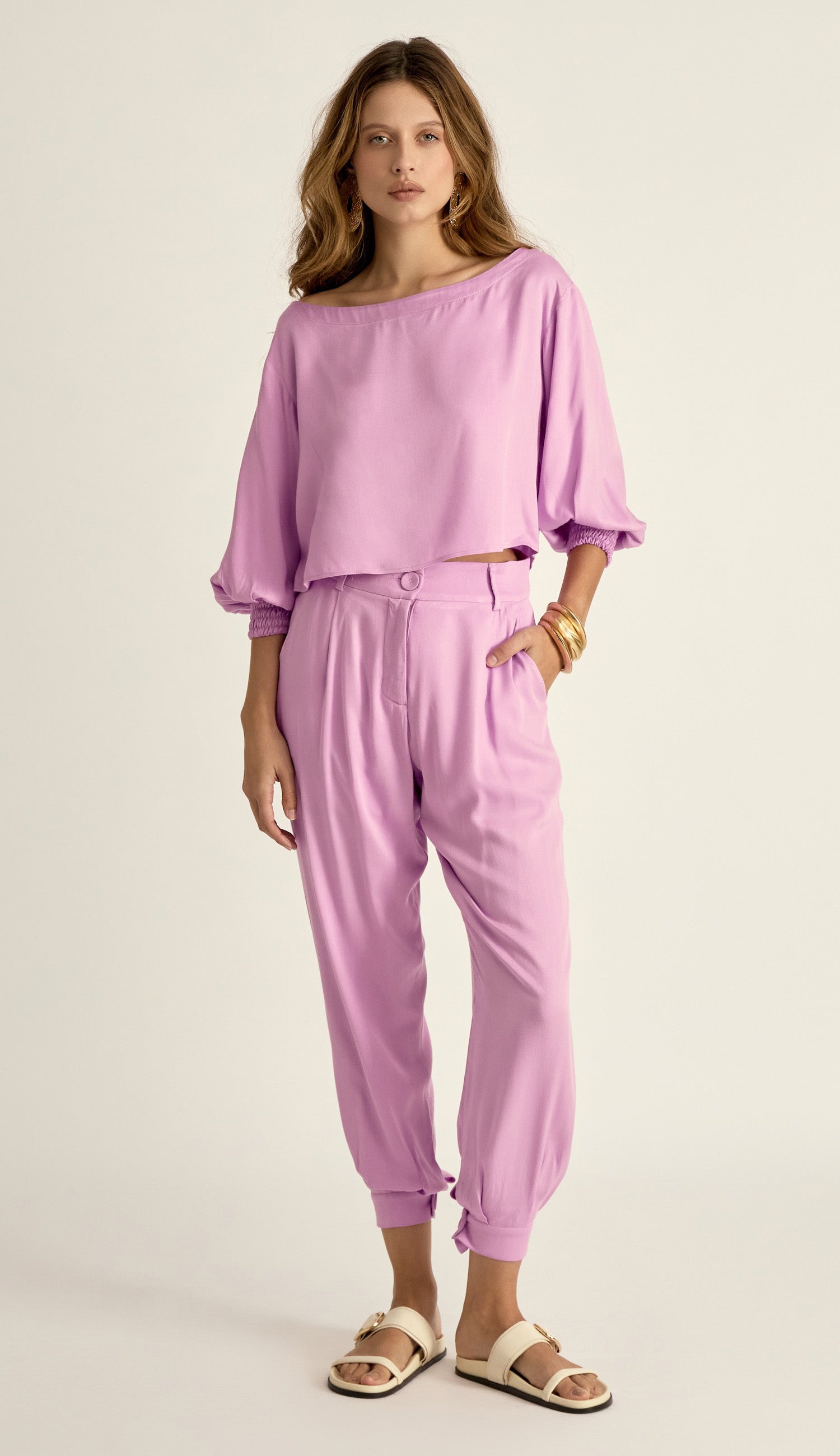 Conjunto confeccionado em viscose twill. A blusa possui decote canoa, mangas 3/4 com lastex franzido nos punhos. A calça possui forro, pregas no cós e na barra com detalhe de botão forrado, fechamento frontal também por botão forrado e zíper. Um look que pode te acompanhar no trabalho ou em um ambiente mais casual!