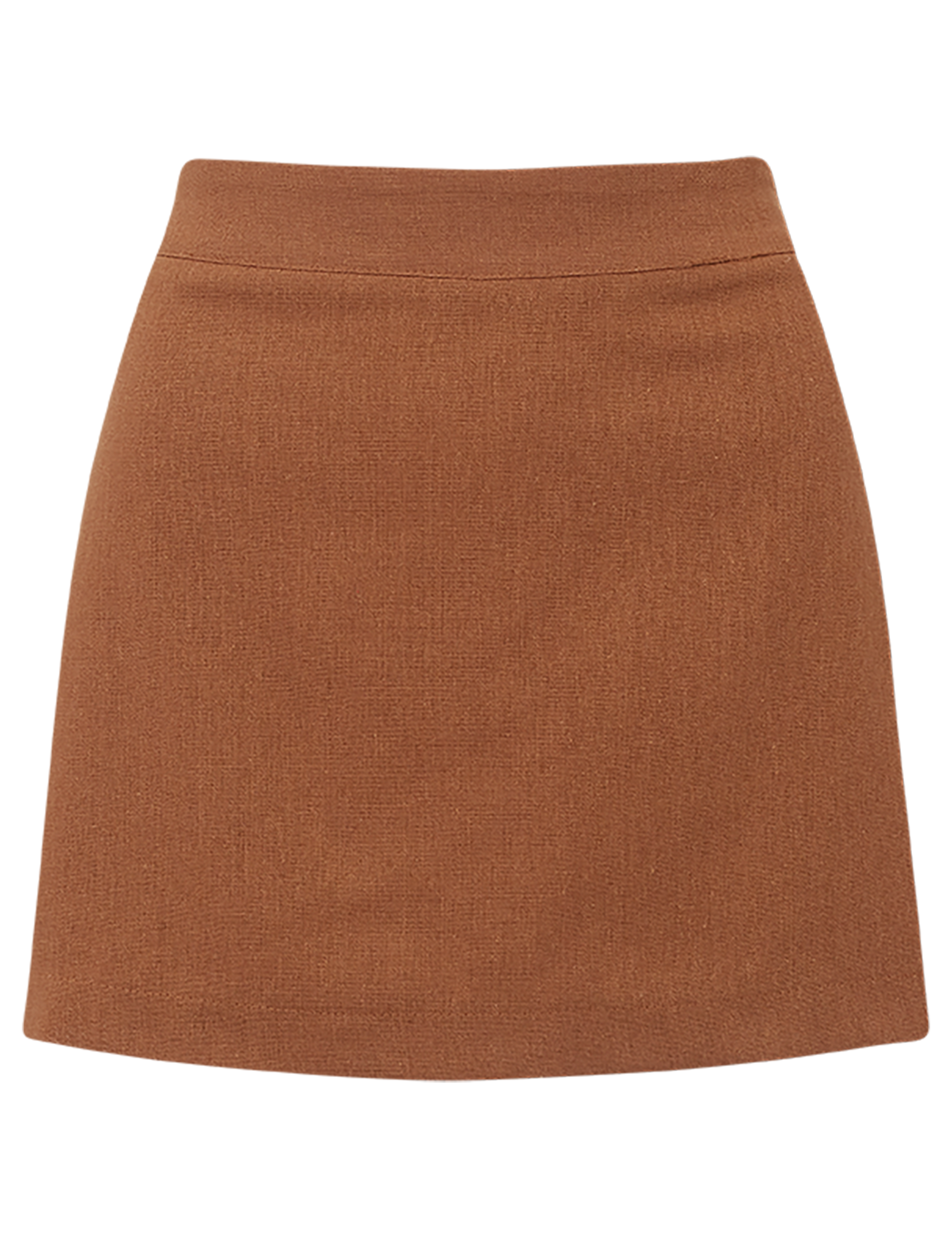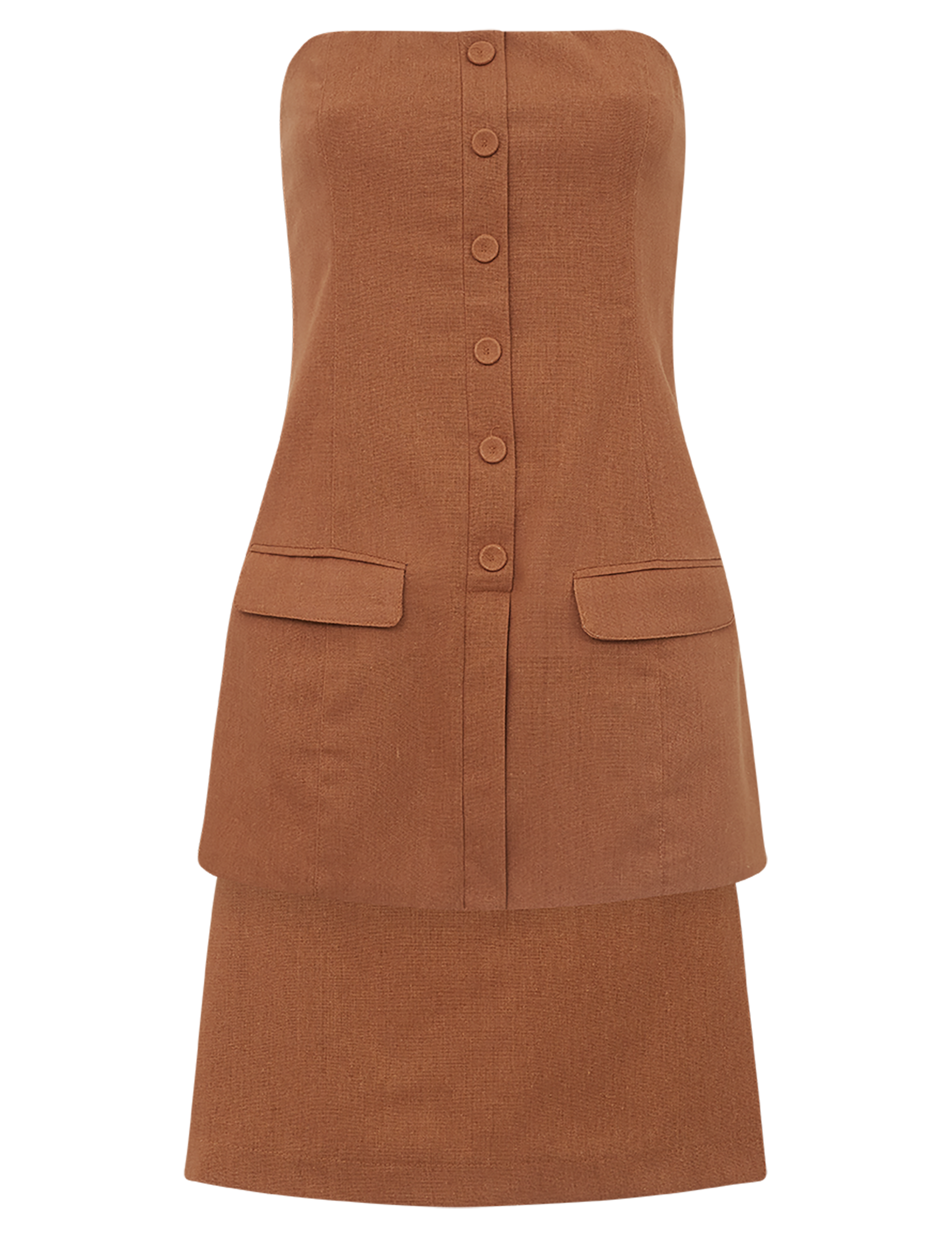 Conjunto confeccionado em linho mais encorpado com forro. A blusa não possui mangas e conta com modelagem alongada, decote reto com silicone interno para maior sustentação, recortes que modelam a peça, detalhe frontal de botões forrados de enfeite, bolsos frontais com lapela dobrada, elástico franzido nas costas e fechamento lateral por zíper invisível. A saia é curta e ajustada e possui fechamento traseiro por zíper invisível.