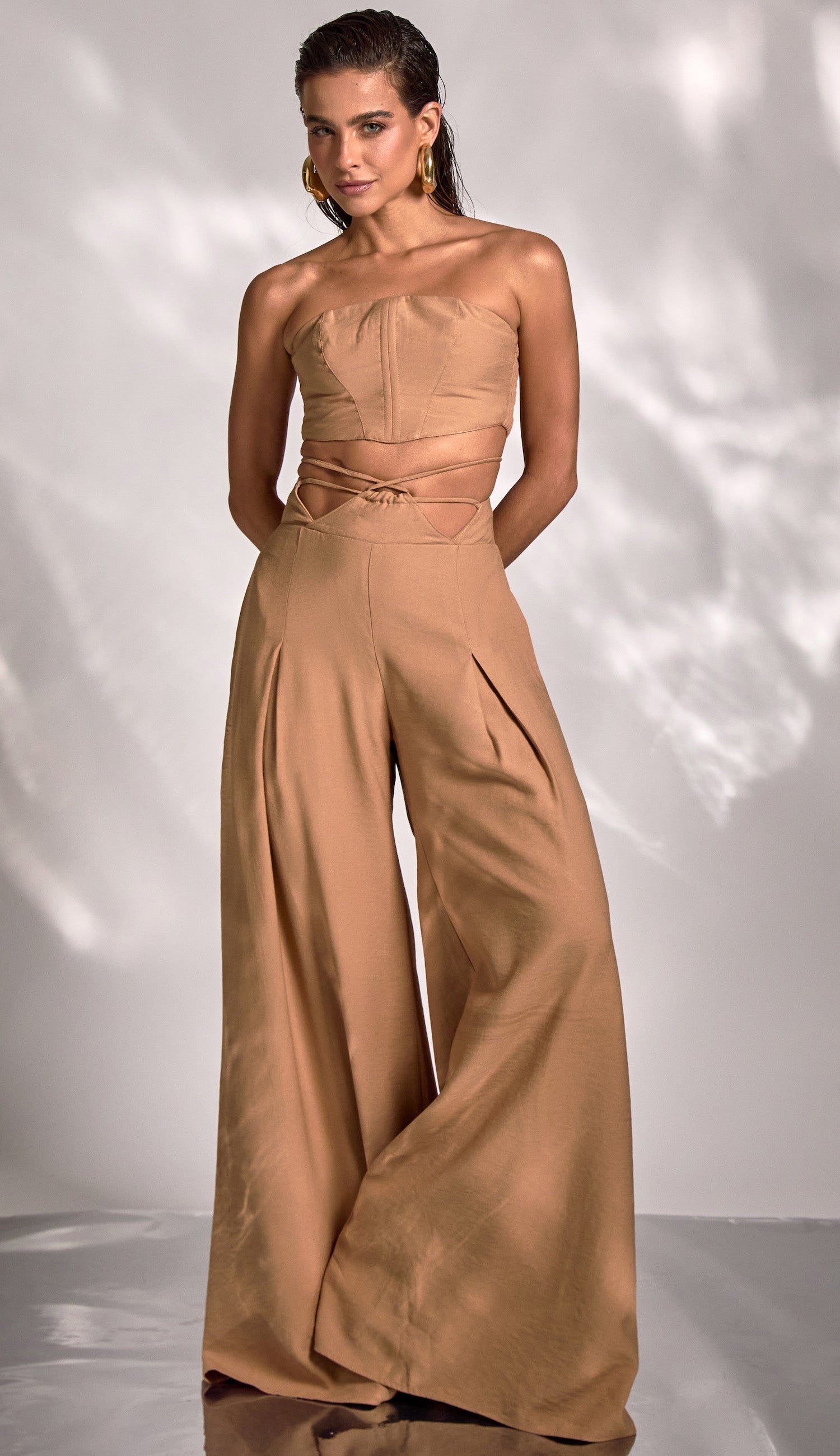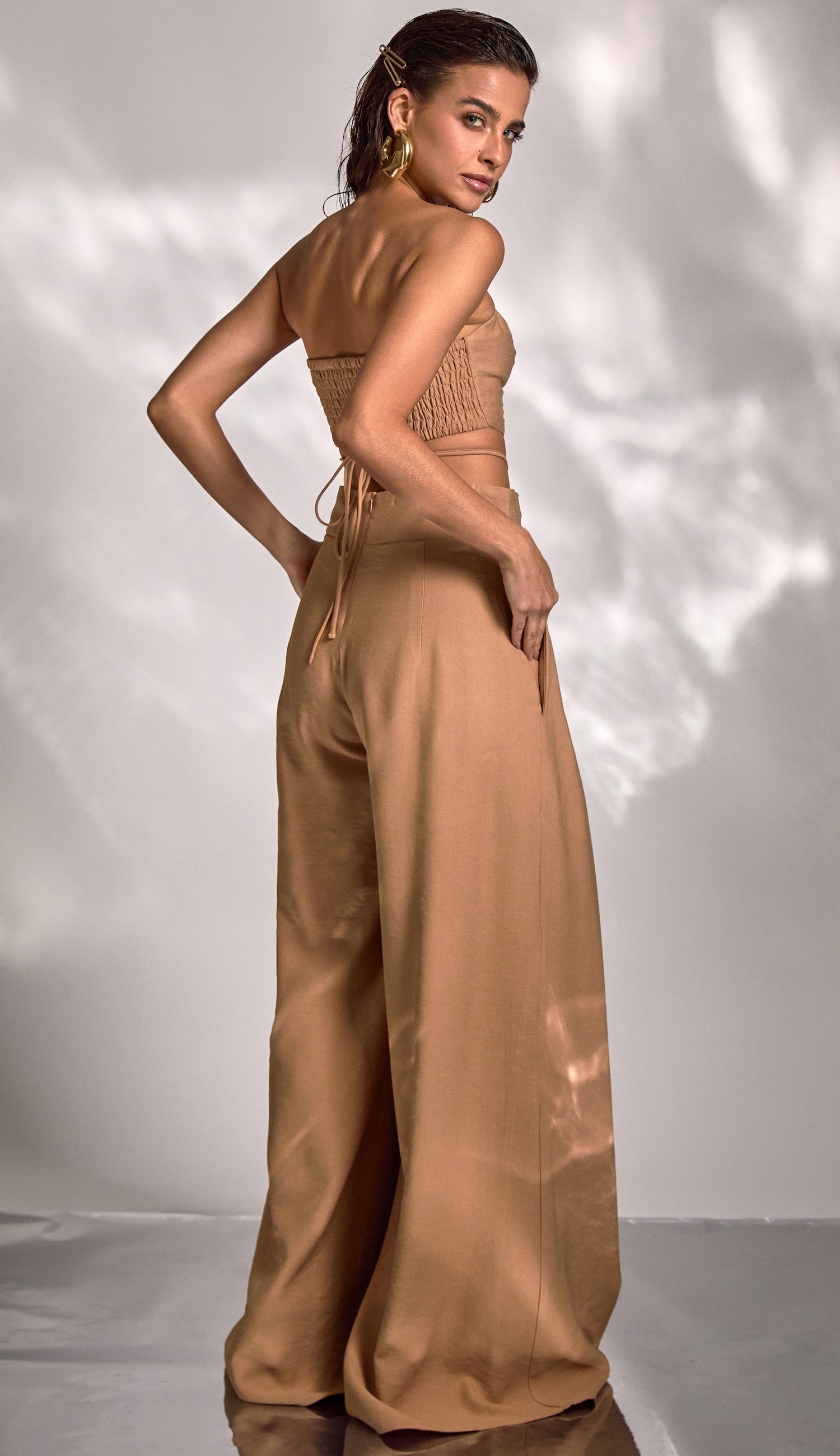 Conjunto confeccionado em sarja de alfaiataria em viscose mais encorpada. O top não possui mangas e conta com decote reto com silicone interno para maior segurança, recortes que modelam o busto, barbatana interna no centro para estruturar e lastex franzido nas costas para melhor ajuste ao corpo. A calça é pantalona e possui forro, pregas frontais, fechamento traseiro por zíper invisível, bolsos laterais e conta com detalhe de recorte vazado geométrico no cós com tirinhas finas embutidas para amarração.