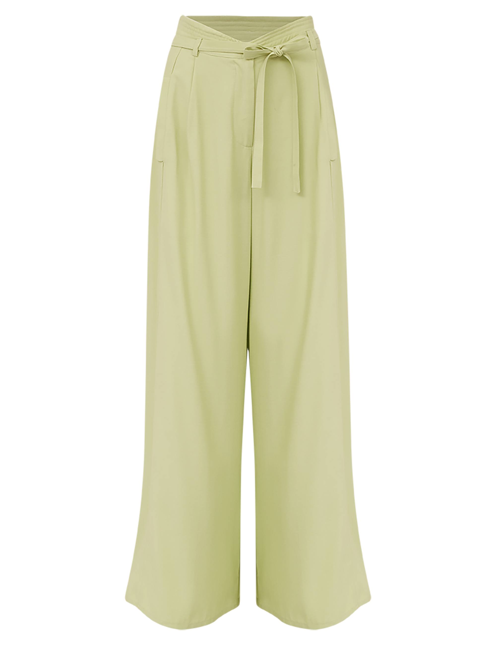 Conjunto confeccionado em poliviscose texturizada mais encorpada com aspecto de linho. O top possui decote em V com franzidinhos, tecido duplo no busto para não ficar transparente, alcinhas reguláveis, pala larga abaixo do busto e lastex franzido nas costas para melhor ajuste ao corpo. A calça possui forro, modelagem wide, cós largo pespontado com recorte geométrico frontal, passantes no cós, bolsos laterais e fechamento frontal por botãozinho forrado e zíper e acompanha faixa no mesmo tecido para amarrar.