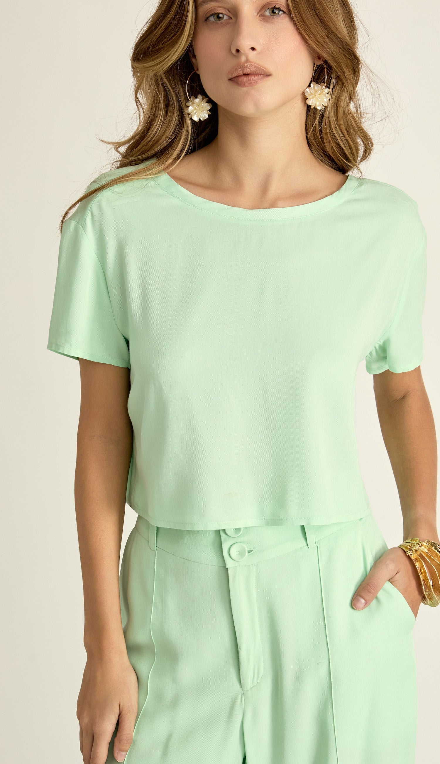 Conjunto confeccionado em viscose twill. A blusa é cropped e possui decote redondo, modelagem reta, mangas curtas e fechamento traseiro por zíper de metal com conchinha da Laguna gravada no pingente. A calça é pantalona e possui forro na peça inteira, vincos frontais, bolsos laterais e fechamento frontal por zíper e botão forrado.