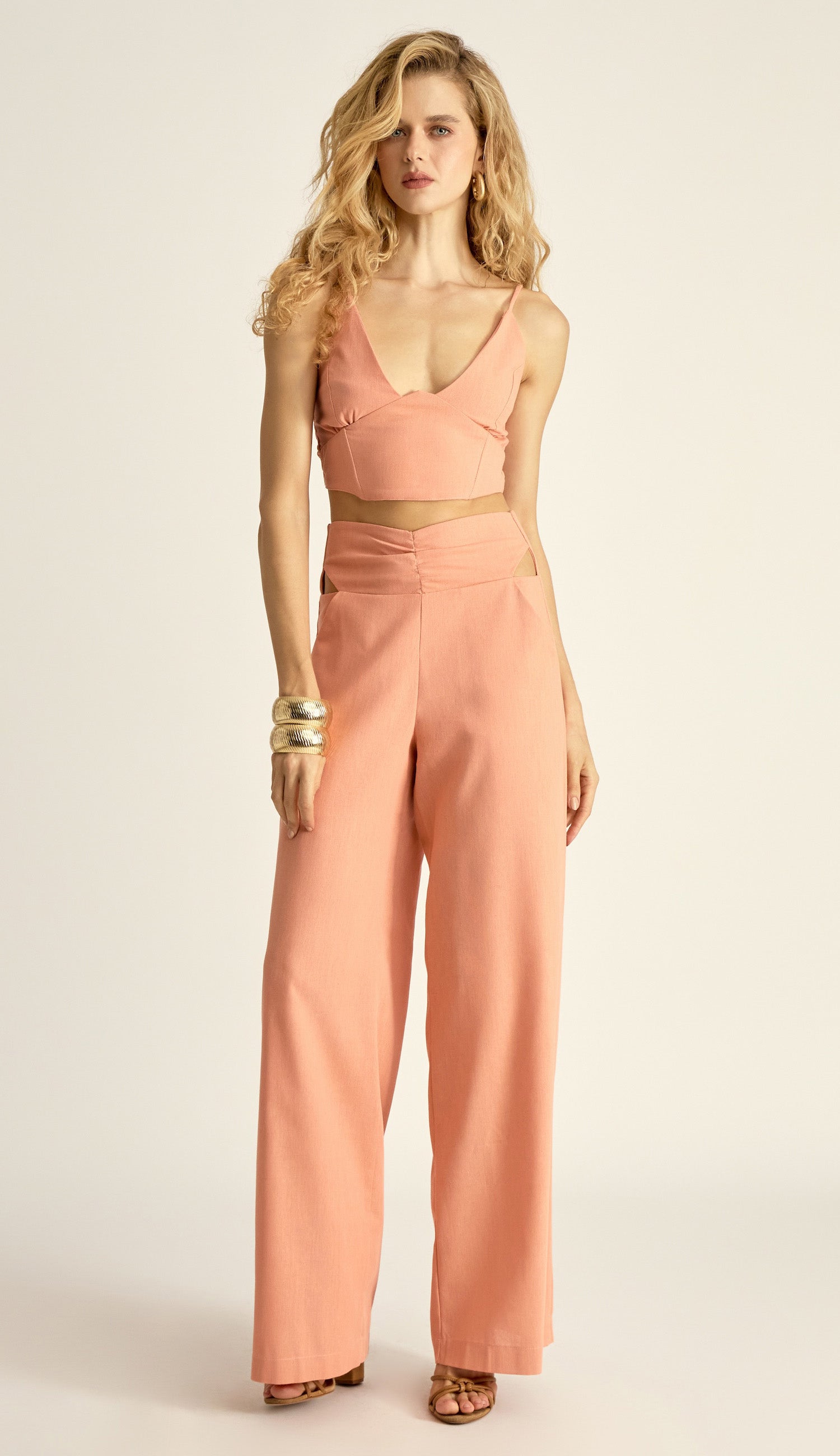 Conjunto confeccionado em linho com forro. O top possui alcinhas reguláveis, lastex franzido nas costas para melhor ajuste ao corpo, decote em V com recortes e franzidinhos que modelam o busto, seguido de pala logo abaixo com barbatanas que estruturam a peça e bico no centro do decote e da barra que desenham a silhueta. A calça é no estilo wide e possui bolsos laterais, cós largo com detalhe frontal franzidinho que cria um lindo recorte na peça, vazados laterais no limite do cós e fechamento traseiro por zíper de metal com pingente que tem a conchinha da Laguna gravada.